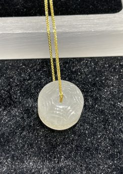An icy pendant is carving as a donut shape with Ruyi clouds on it. The jade pendant also has icy translucent quality. The gold chain is optional.