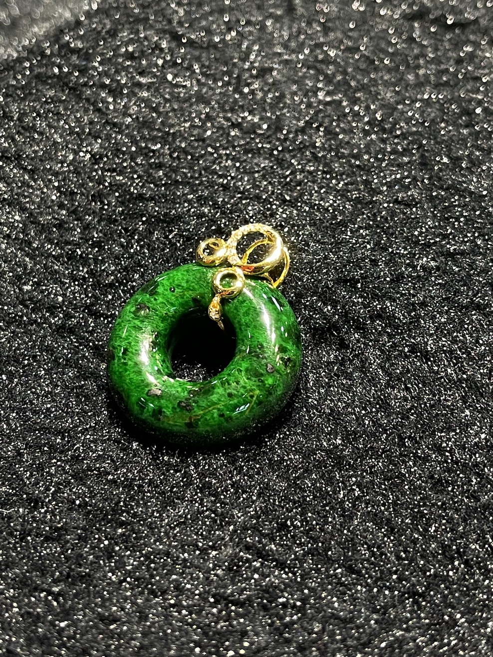 The jade pendant has vibrant dark green colour, it is carving as donut shape. The jade pendant is setting in 18k yellow gold.