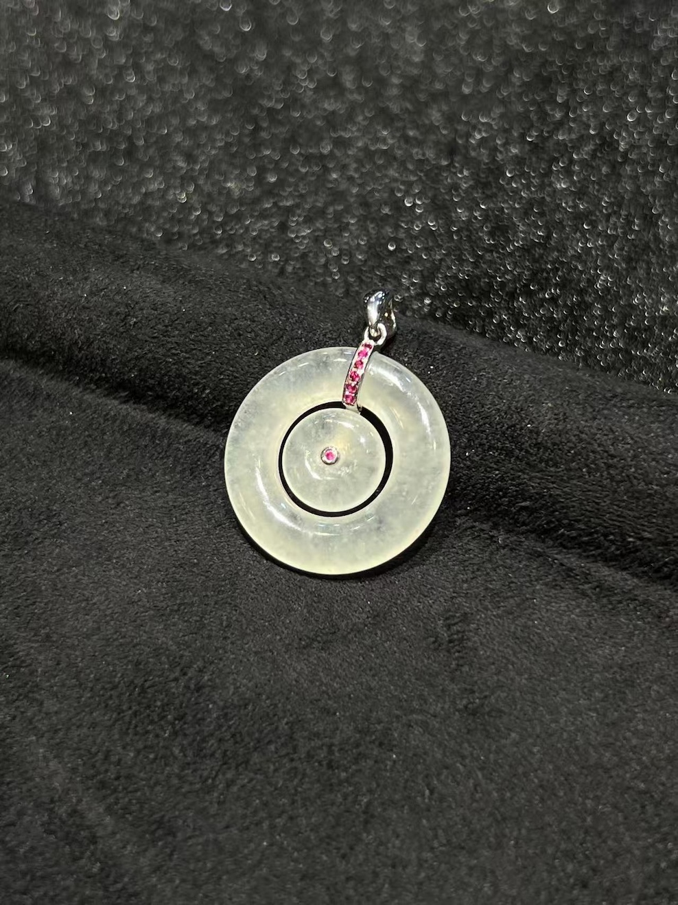 This pendant features an icy jadeite disc with high translucency and a clean, luminous appearance. When light passes through the jade, it reveals soft cloudy textures and subtle internal layers, which are characteristic of natural icy jadeite rather than surface brilliance alone.