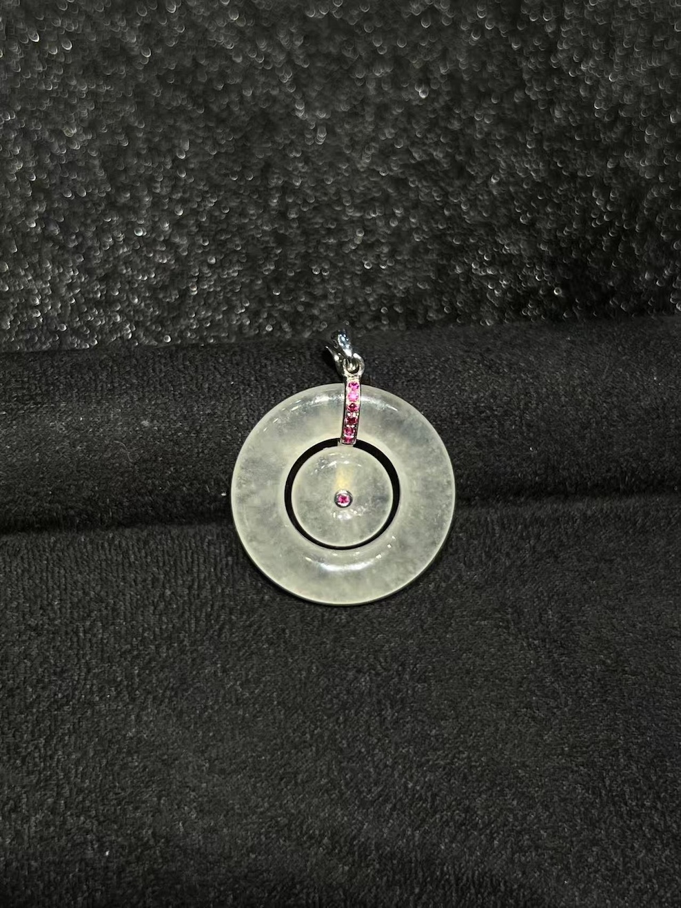 An 18K white gold bail holds a line of pink sapphires, adding a soft contrast to the cool jade. A single pink sapphire set at the centre further draws the eye inward, reinforcing the circular design. Together, the white gold and sapphires frame the jade without overpowering it.