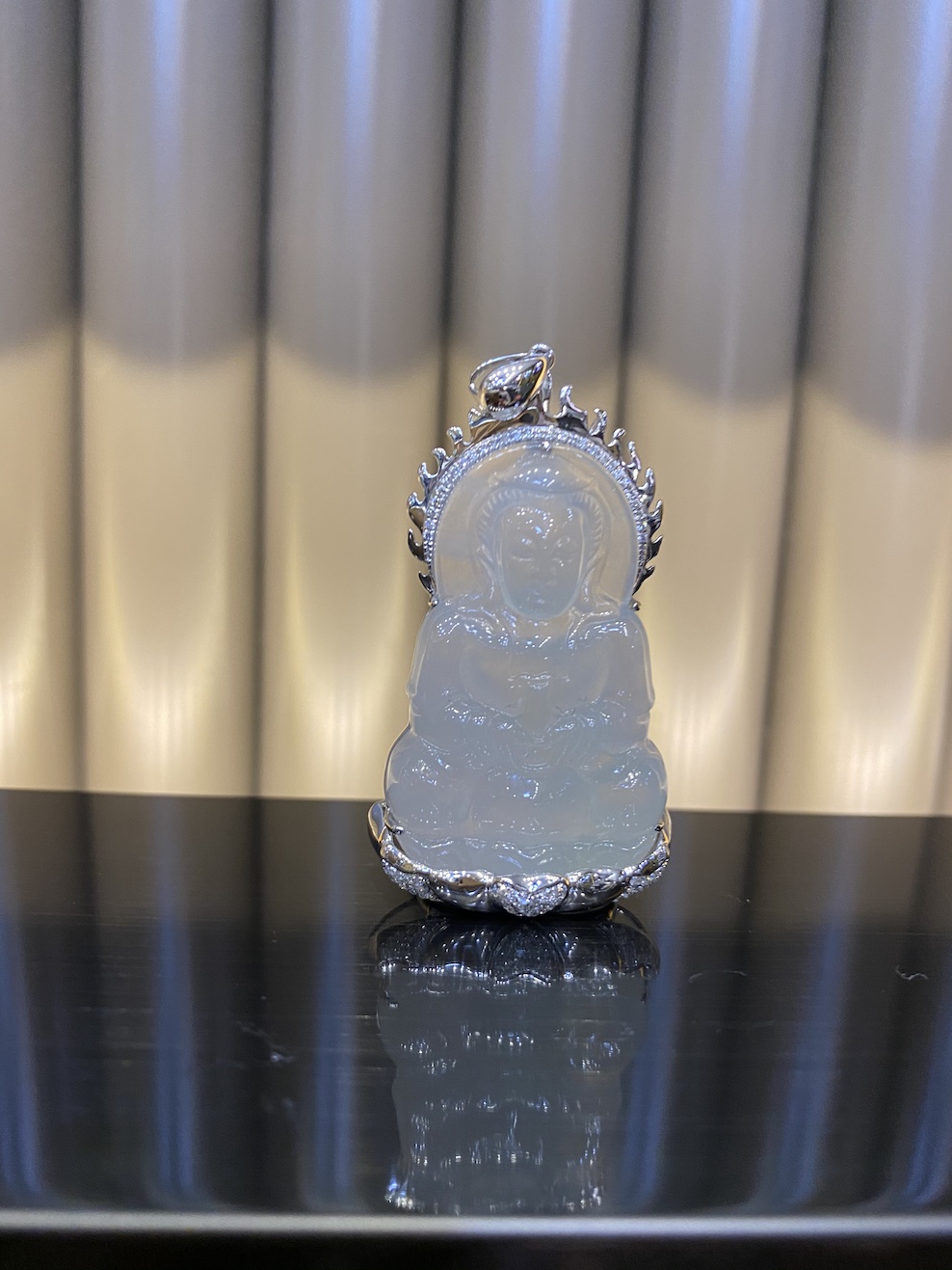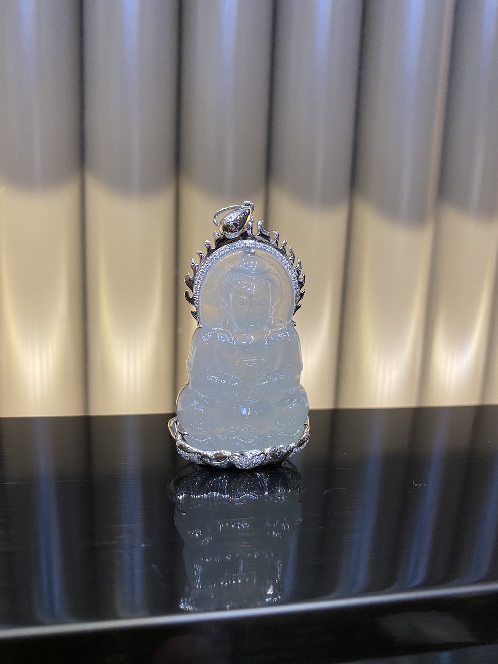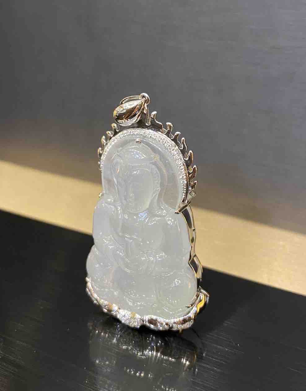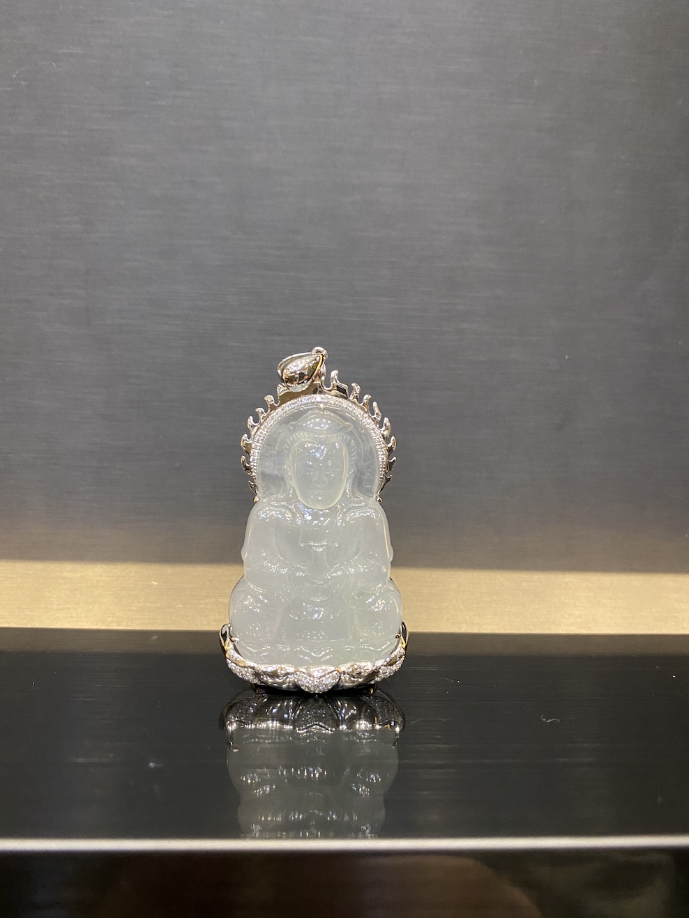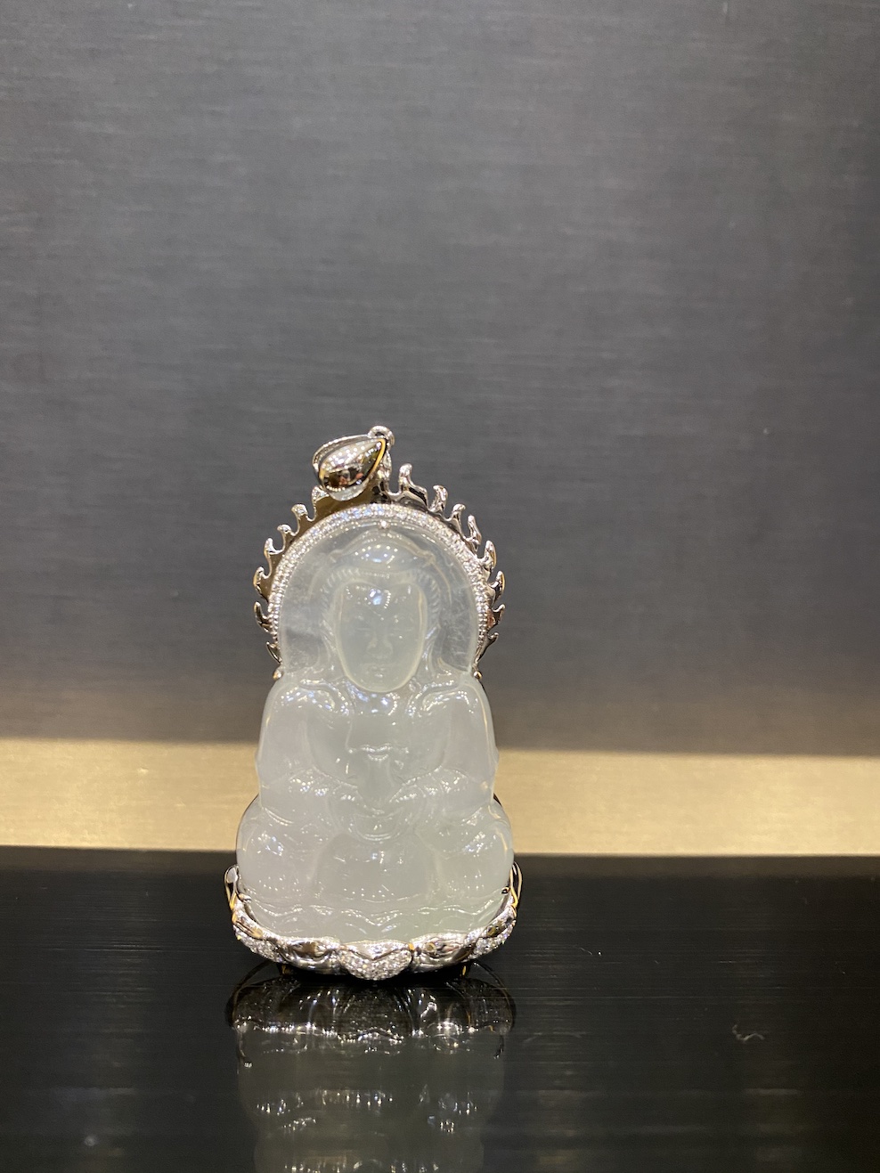 An icy jade has highly translucent quality. The jade pendant is carving as Guanyin, and it is designing in 18k white gold and diamonds.