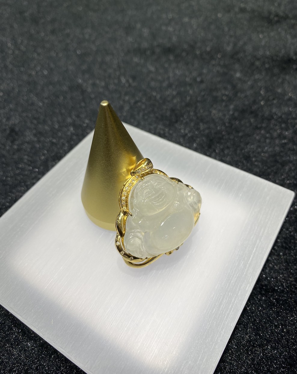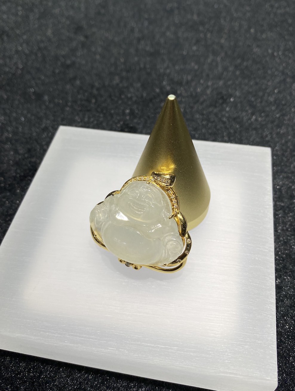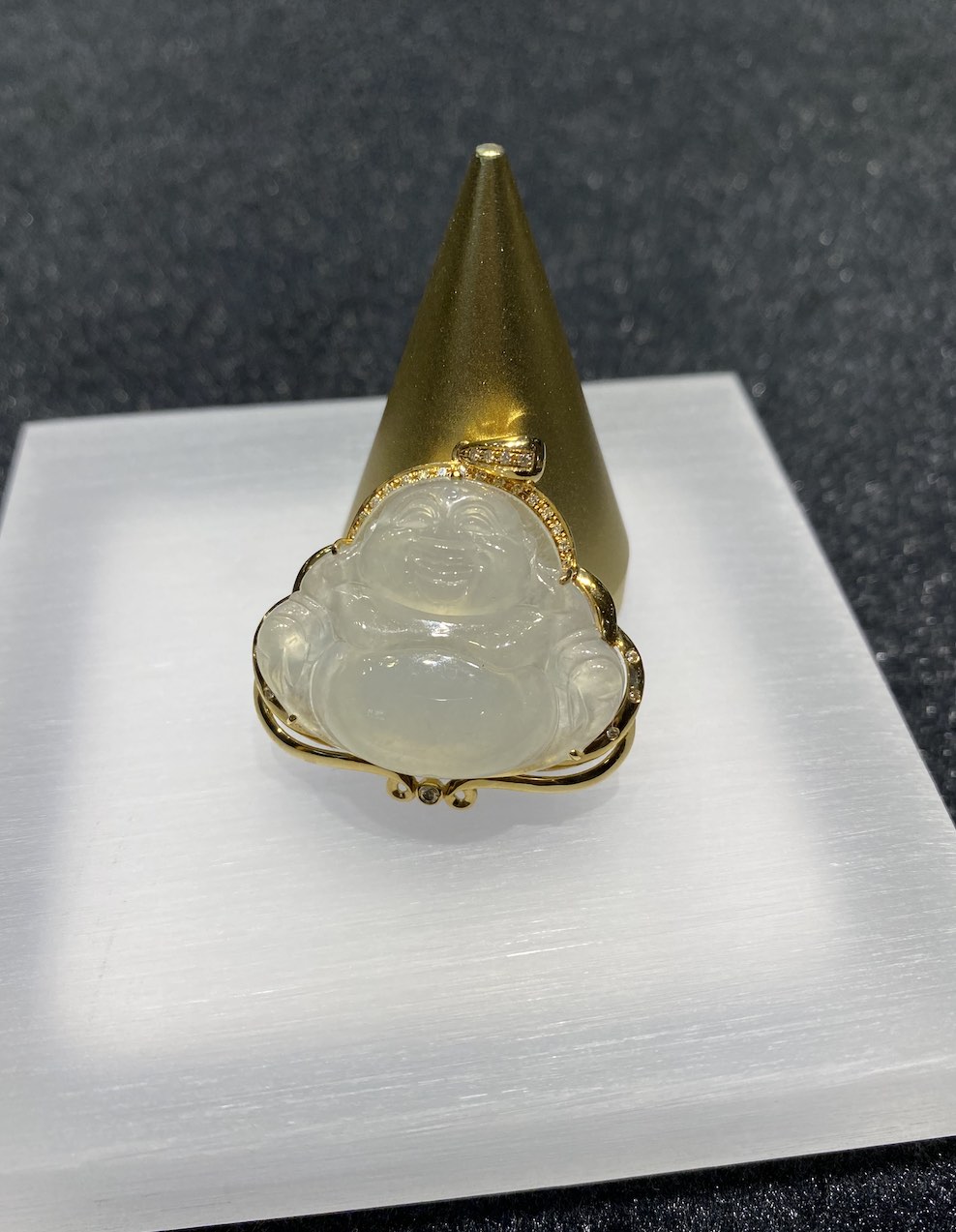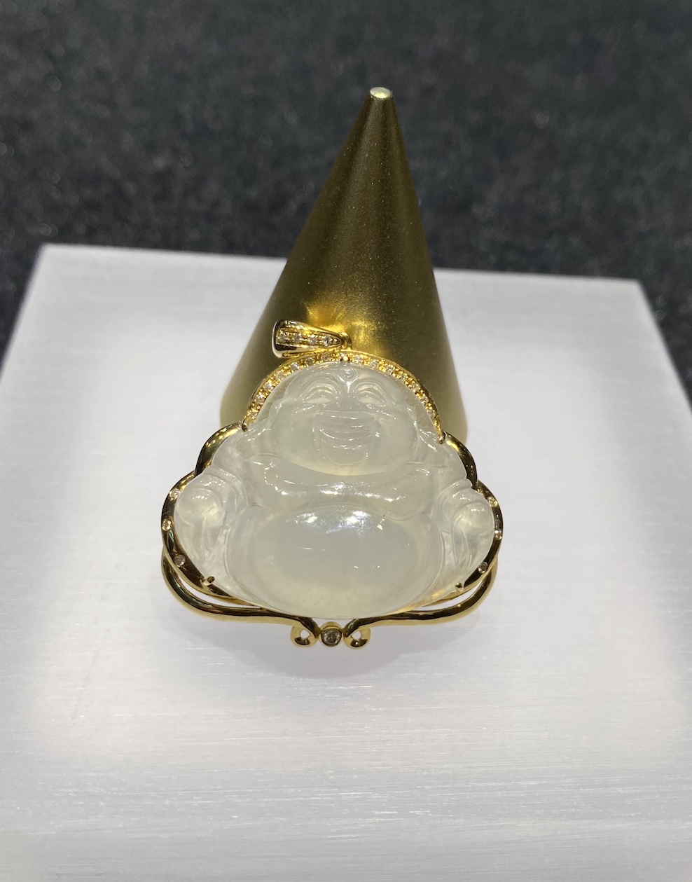 The jade pendant is carving with Laughing Buddha which has very good translucency. The setting is in 18k yellow gold and diamonds.