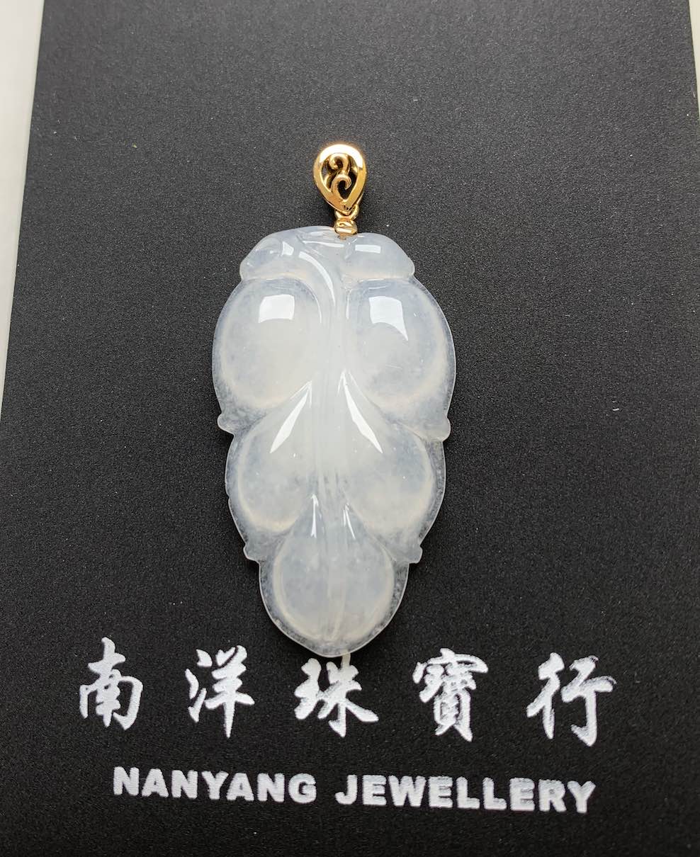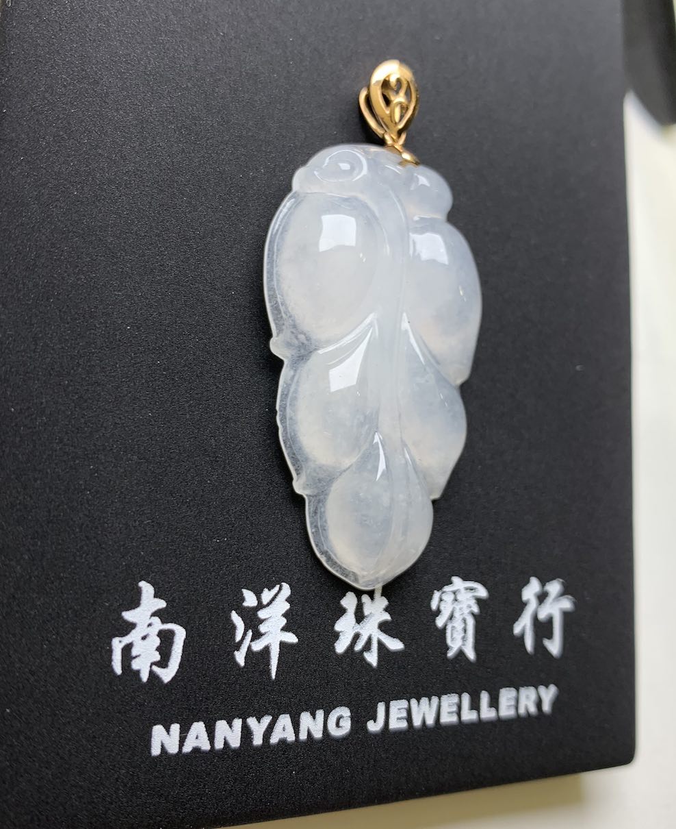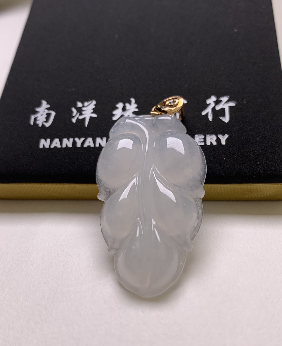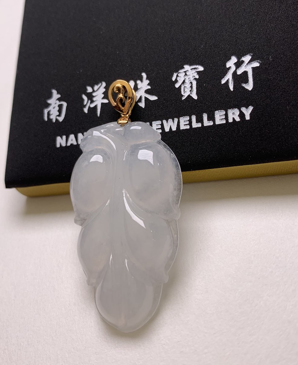 an icy jadeite leaf with highly translucent quality is set into a pendant in 18k pink gold.