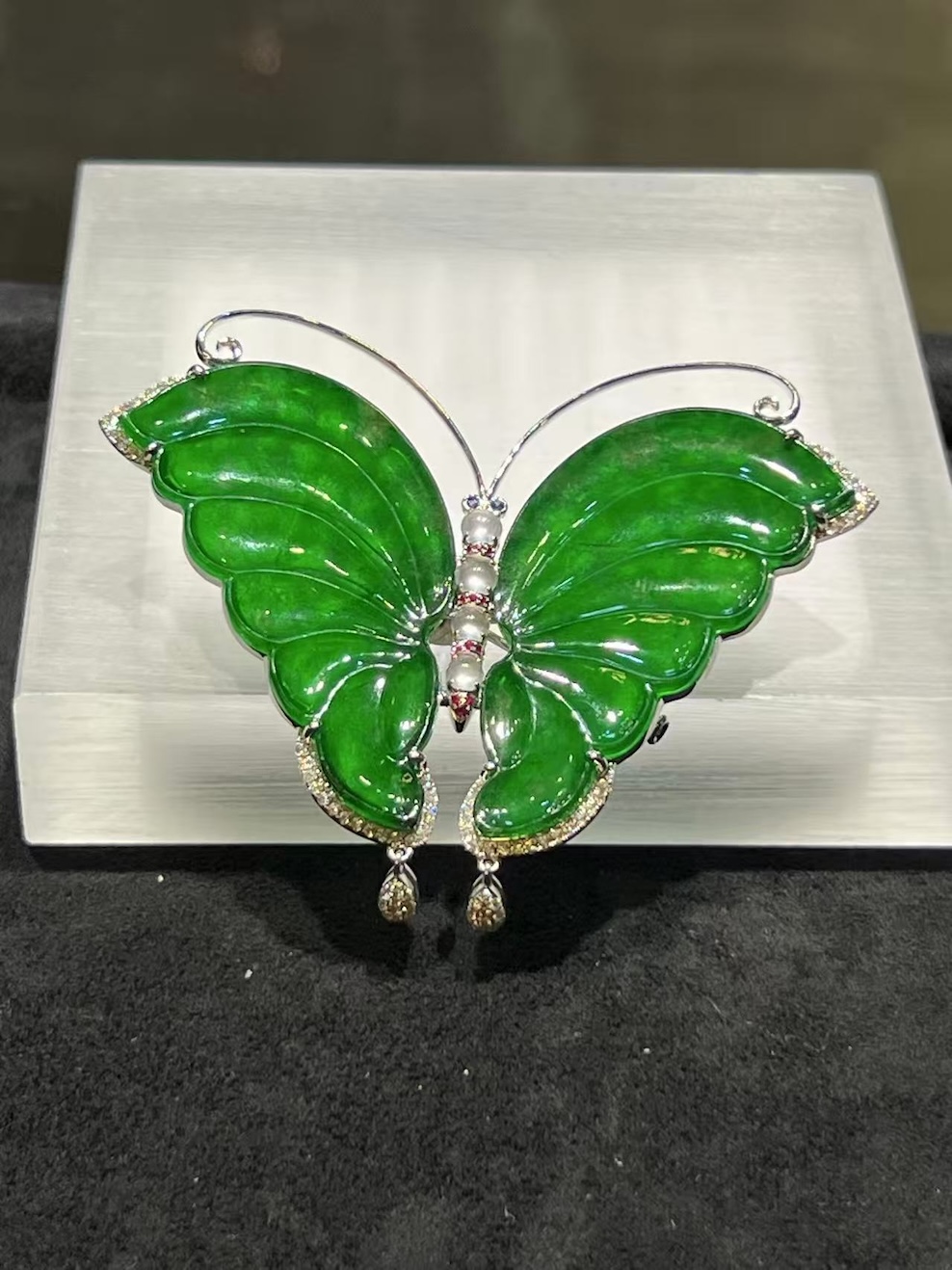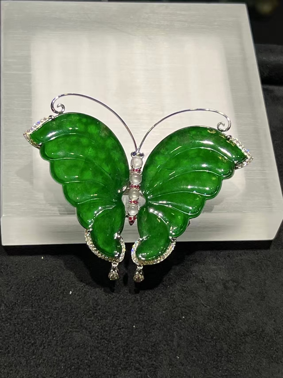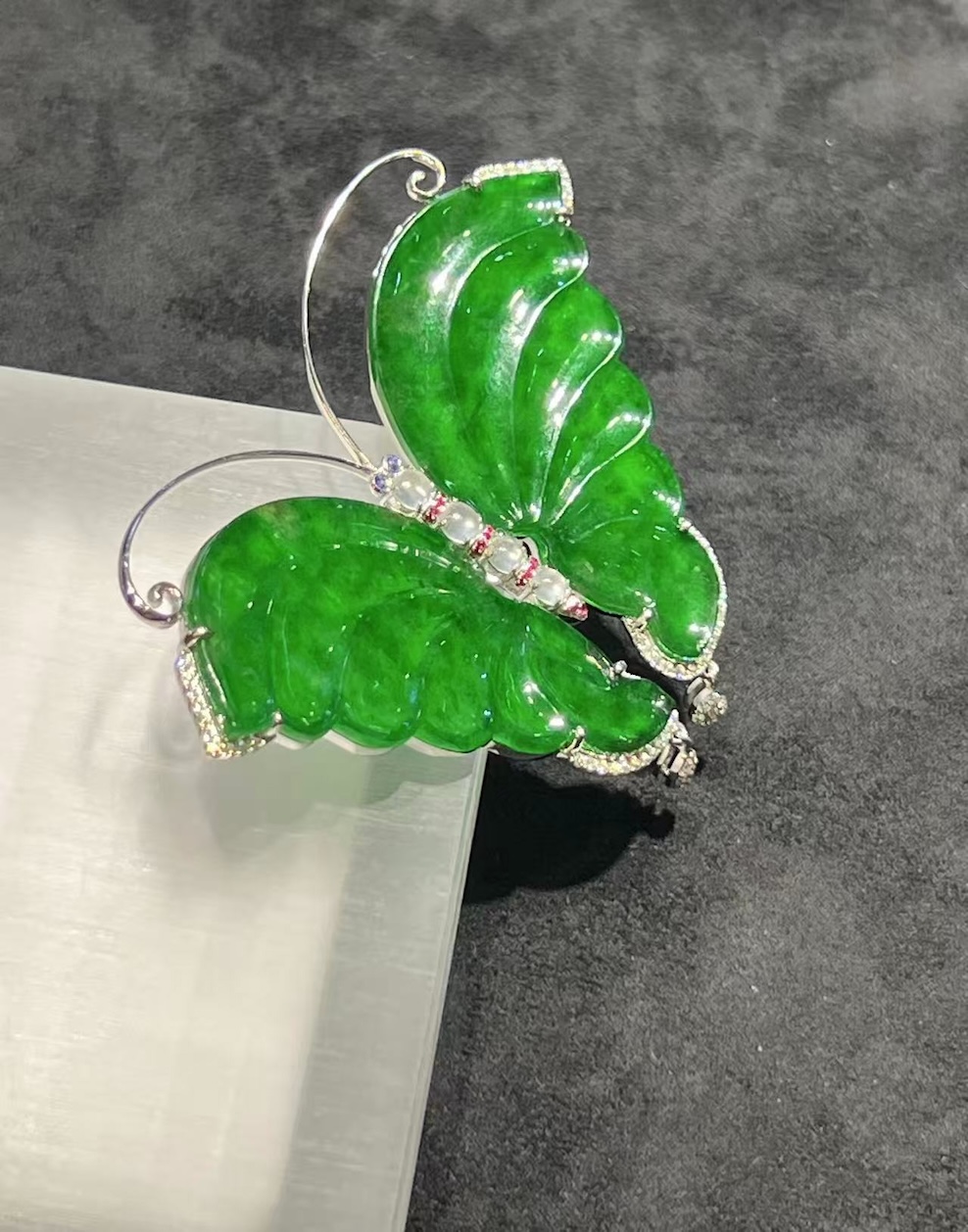 At the centre, the butterfly body uses four small icy jadeite cabochons arranged in a vertical line. Moreover, their cool translucency creates a calm contrast against the richer green wings. This balance keeps the overall design harmonious and visually light.