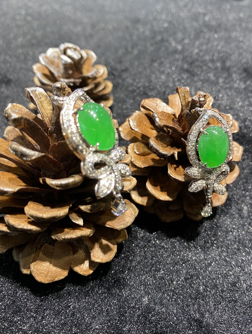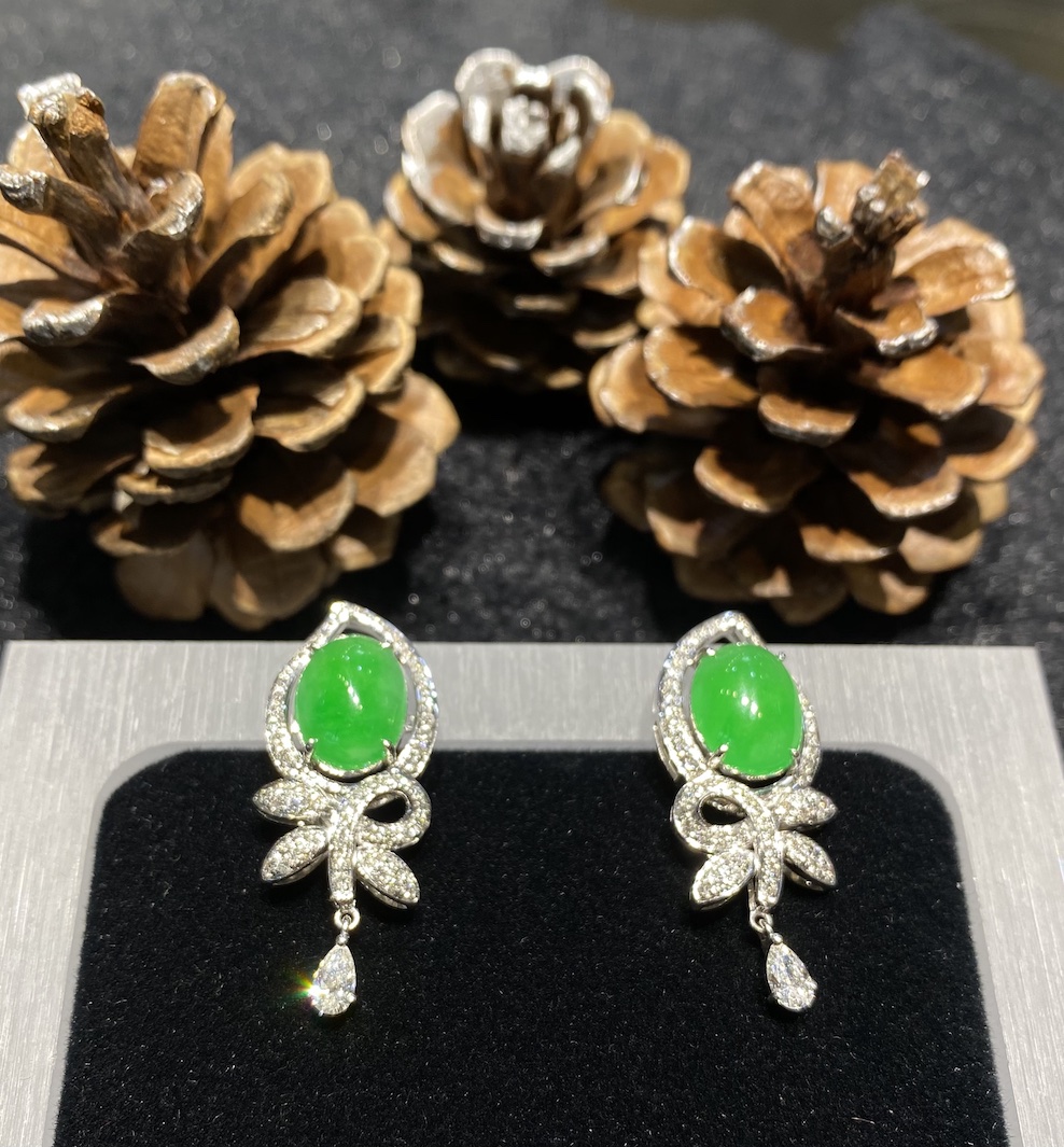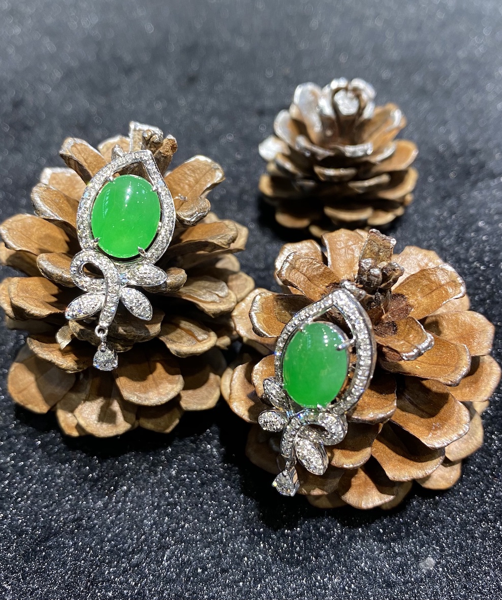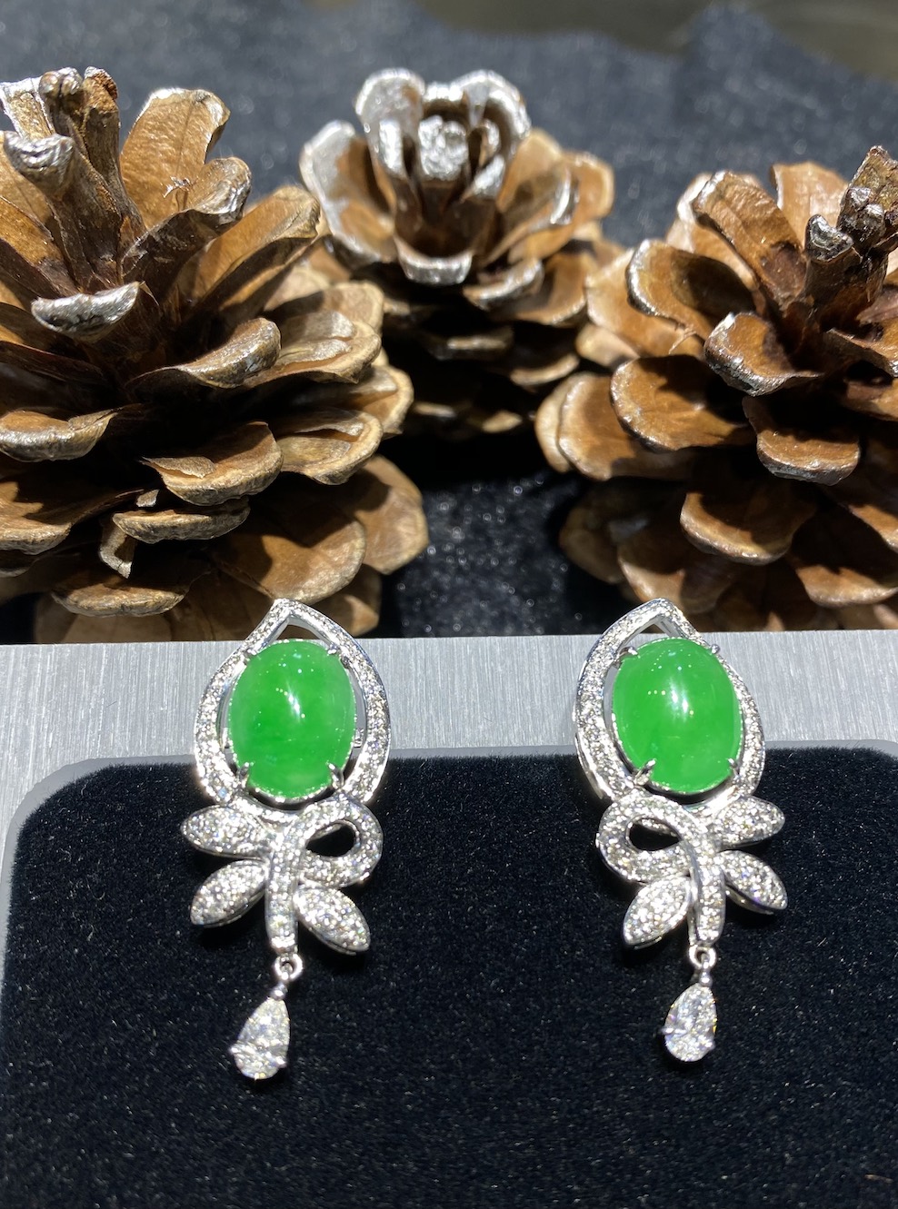 A pair of highly translucent icy cabochon has very vivid green colour. The cabochons are designing into a pair of dangling earring in 18k white gold and diamonds. The jade cabochon earring also has very fine jade quality.