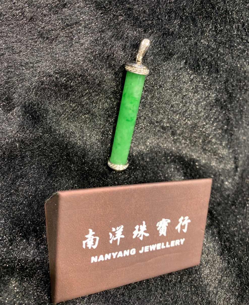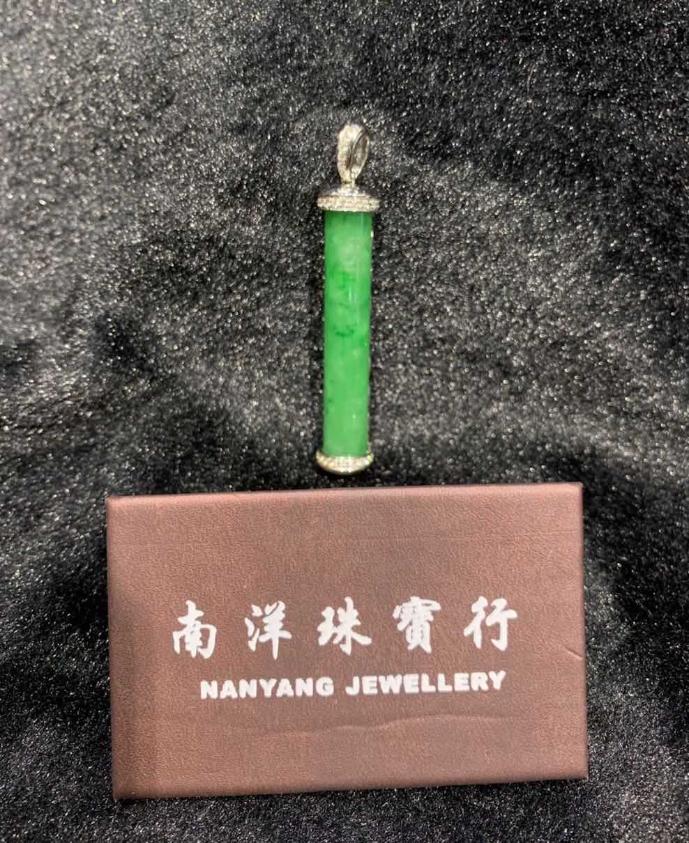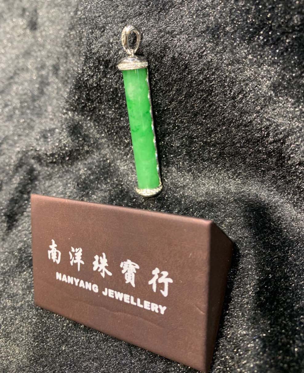 a perfect jadeite stone is carved into a pillar-shape pendant, it has very vivid and rare vibrant green colour with highly translucent quality. it is deigned into a jadeite pendant in 18k white gold and diamonds.
