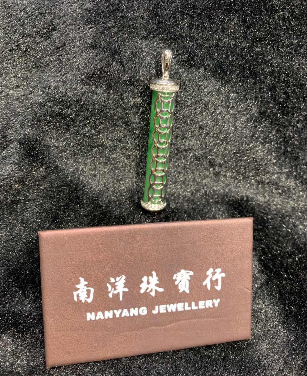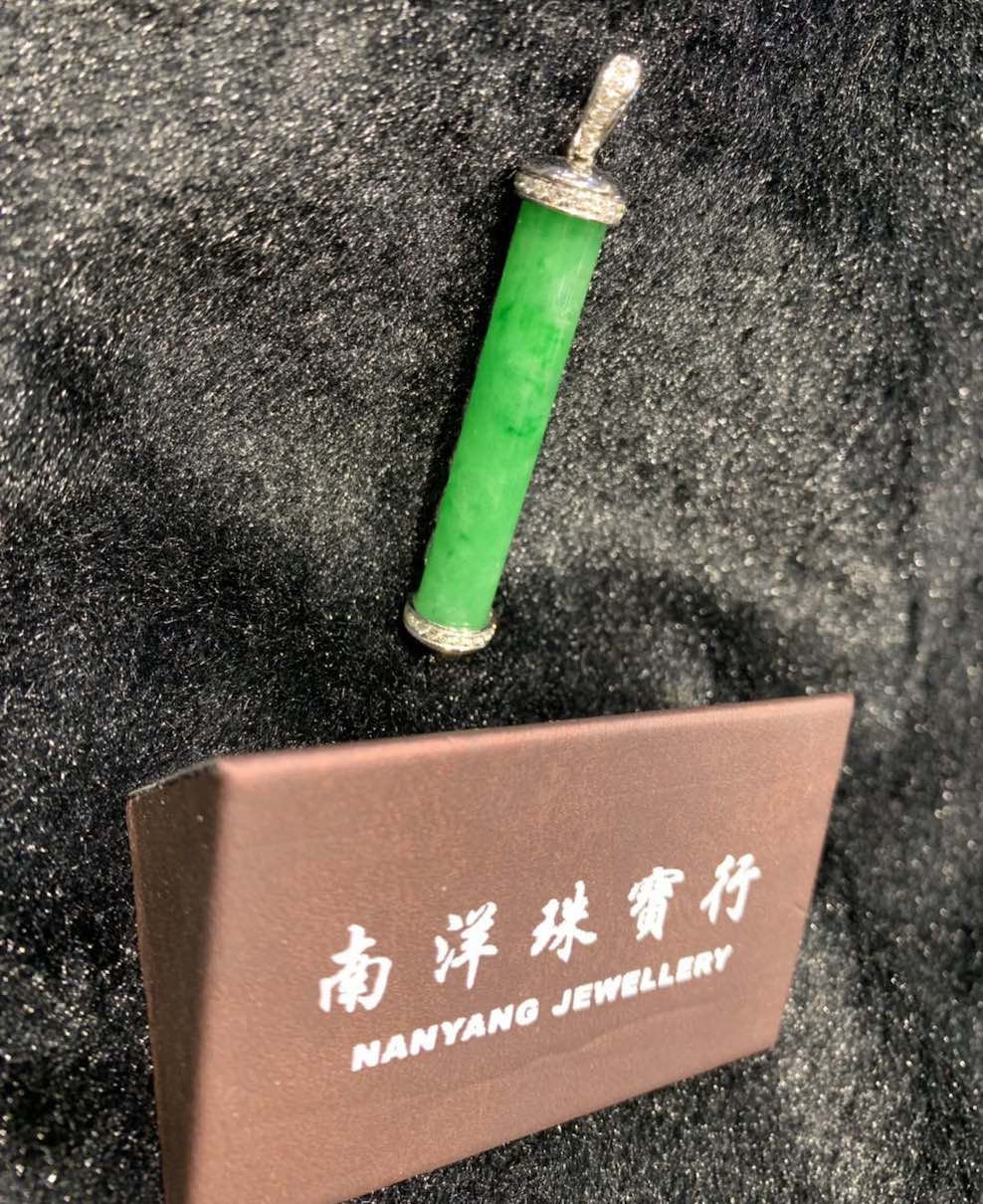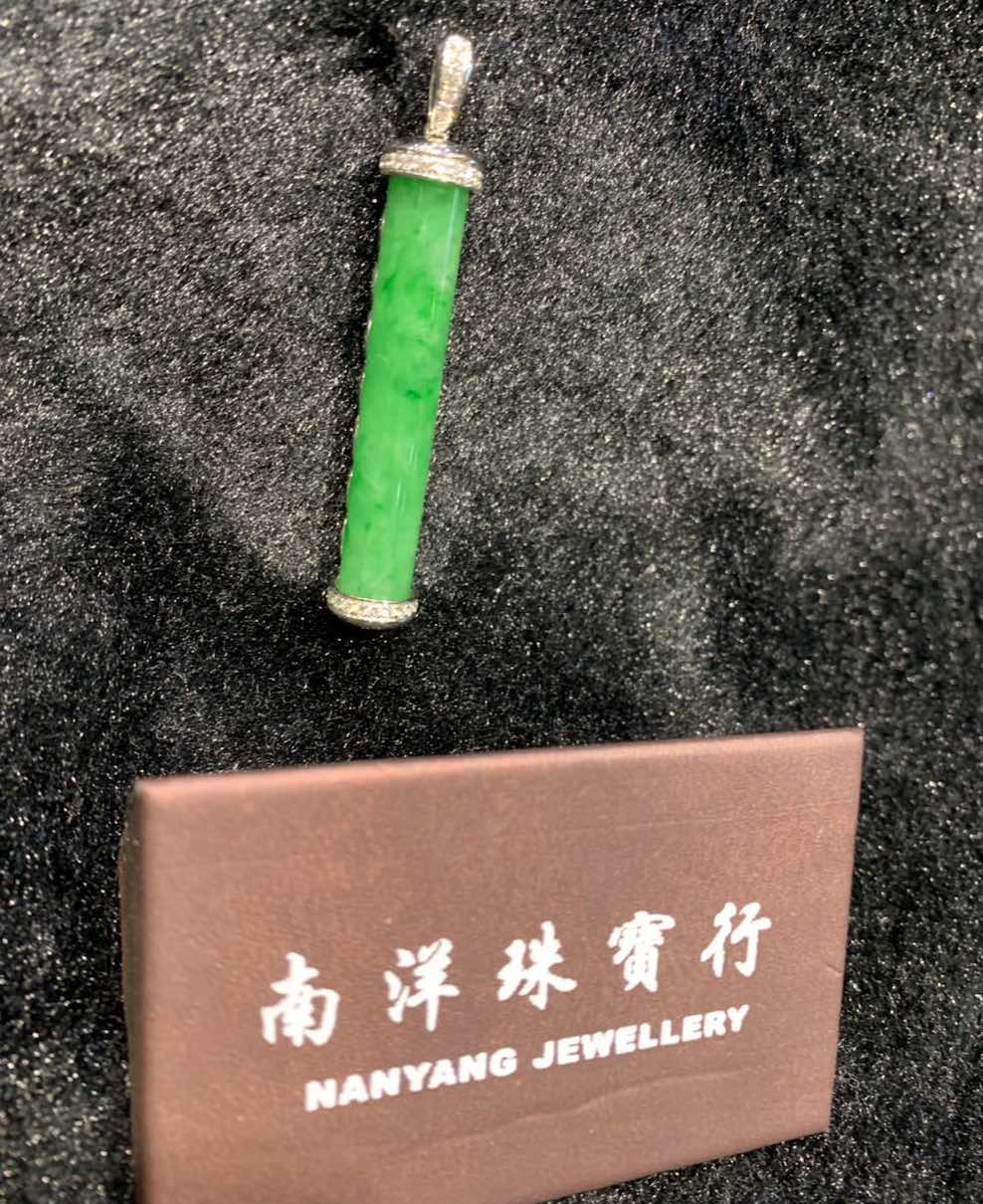 a perfect jadeite stone is carved into a pillar-shape pendant, it has very vivid and rare vibrant green colour with highly translucent quality. it is deigned into a jadeite pendant in 18k white gold and diamonds.