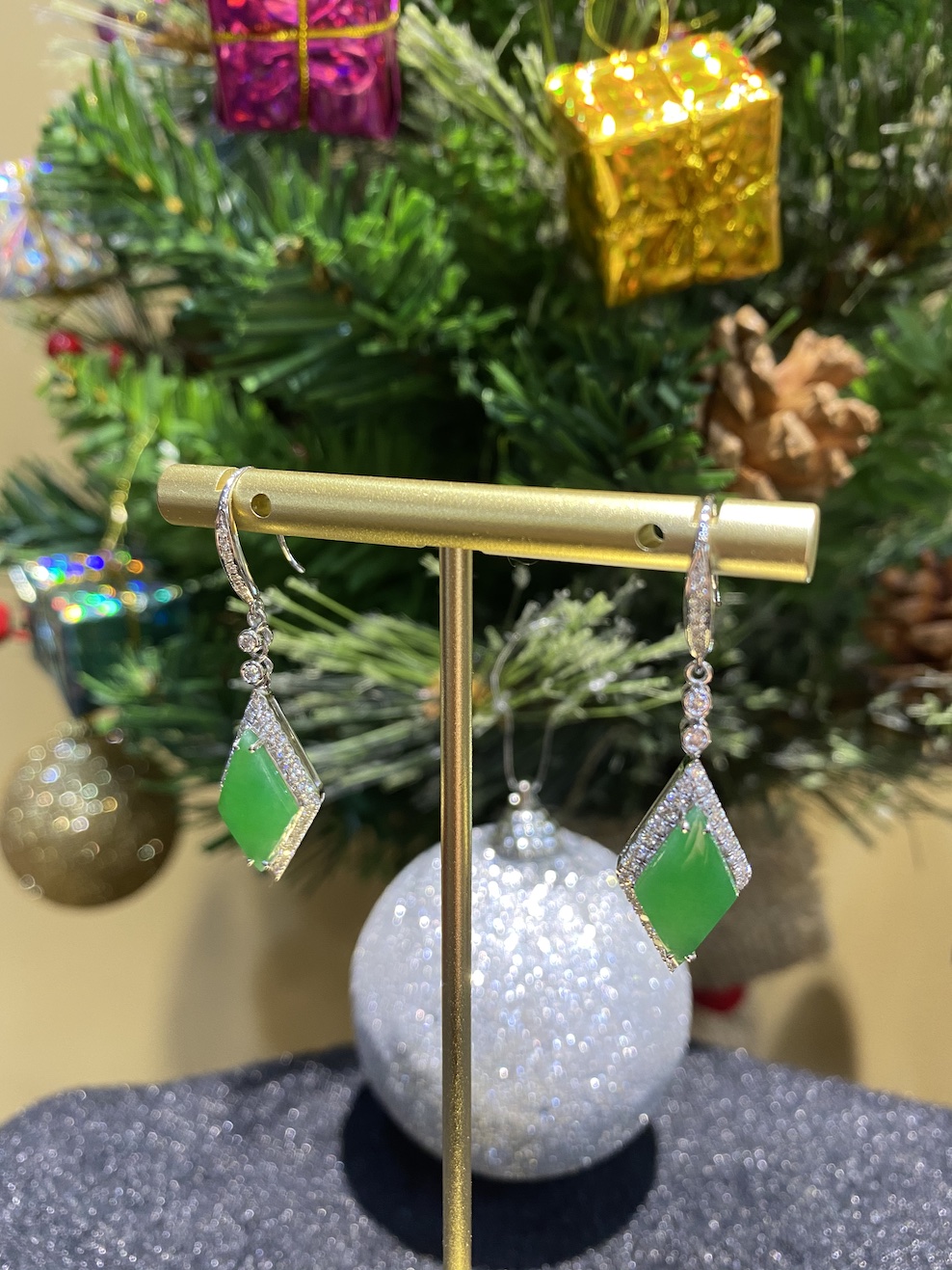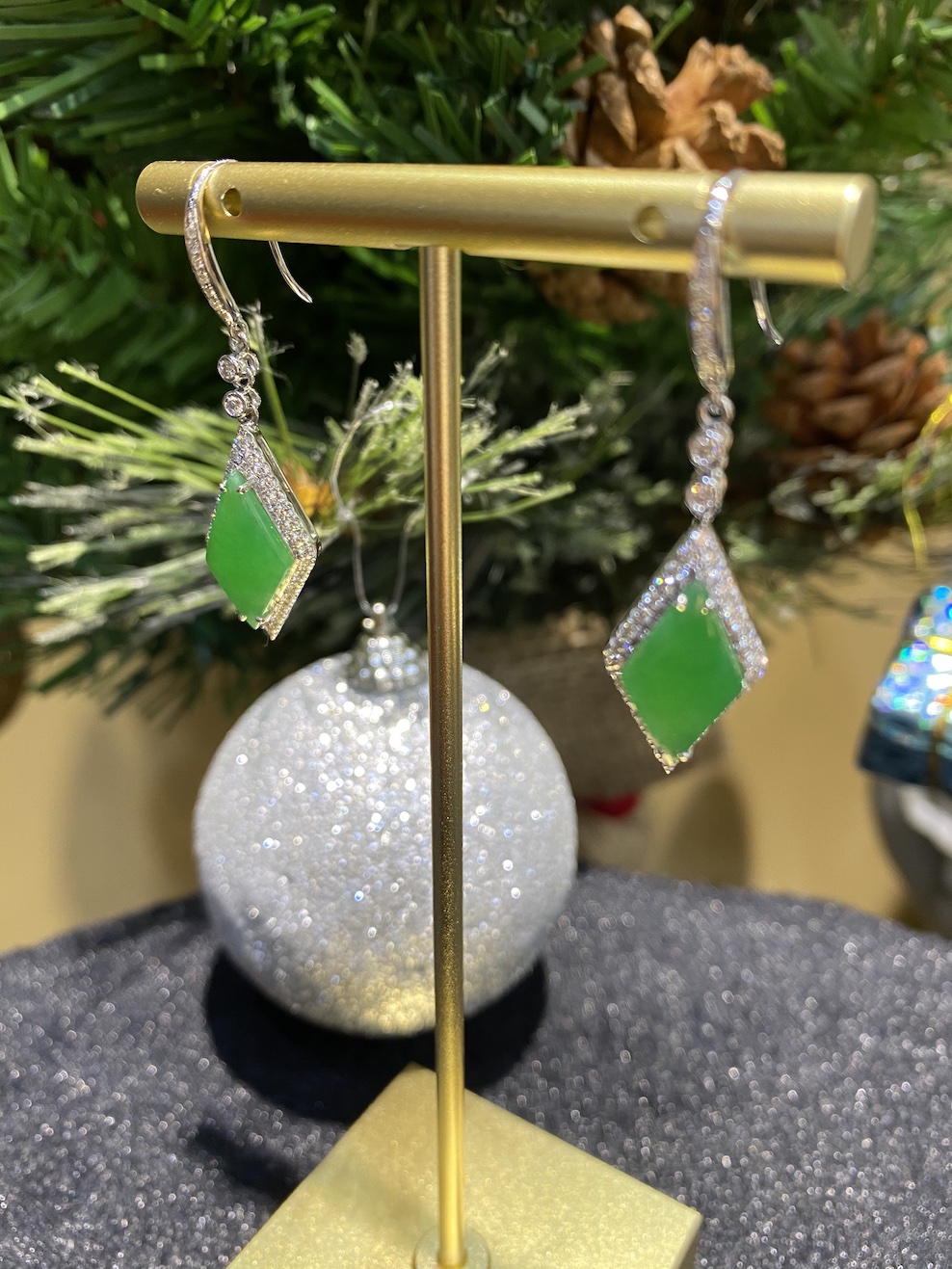 A pair of rhombus cut jade has very translucent and vivid green colour. The jade is designing into a pair of dangling jade earring in 18k white gold and diamonds. It is a lovely pair of jade earring with fine jade texture.