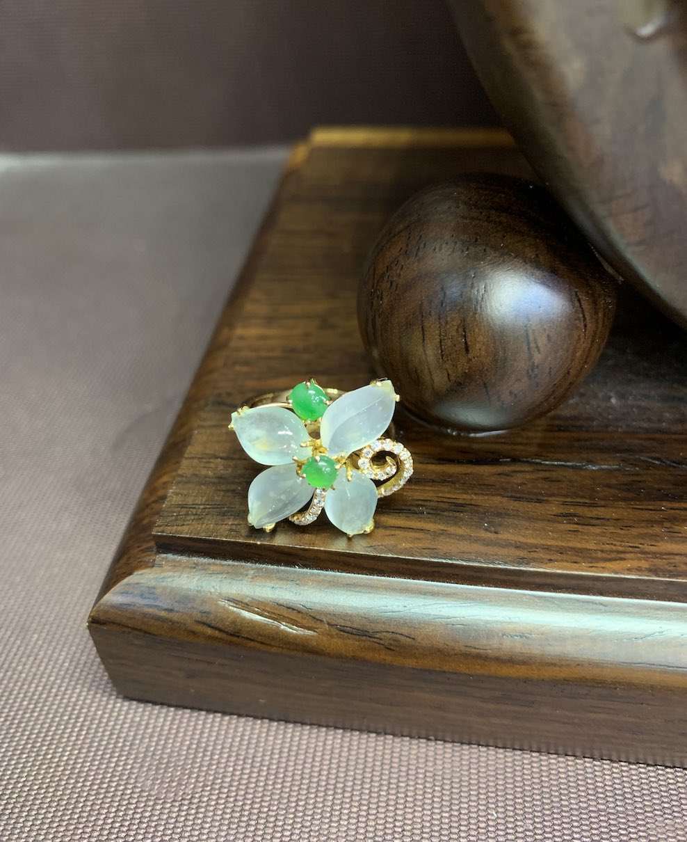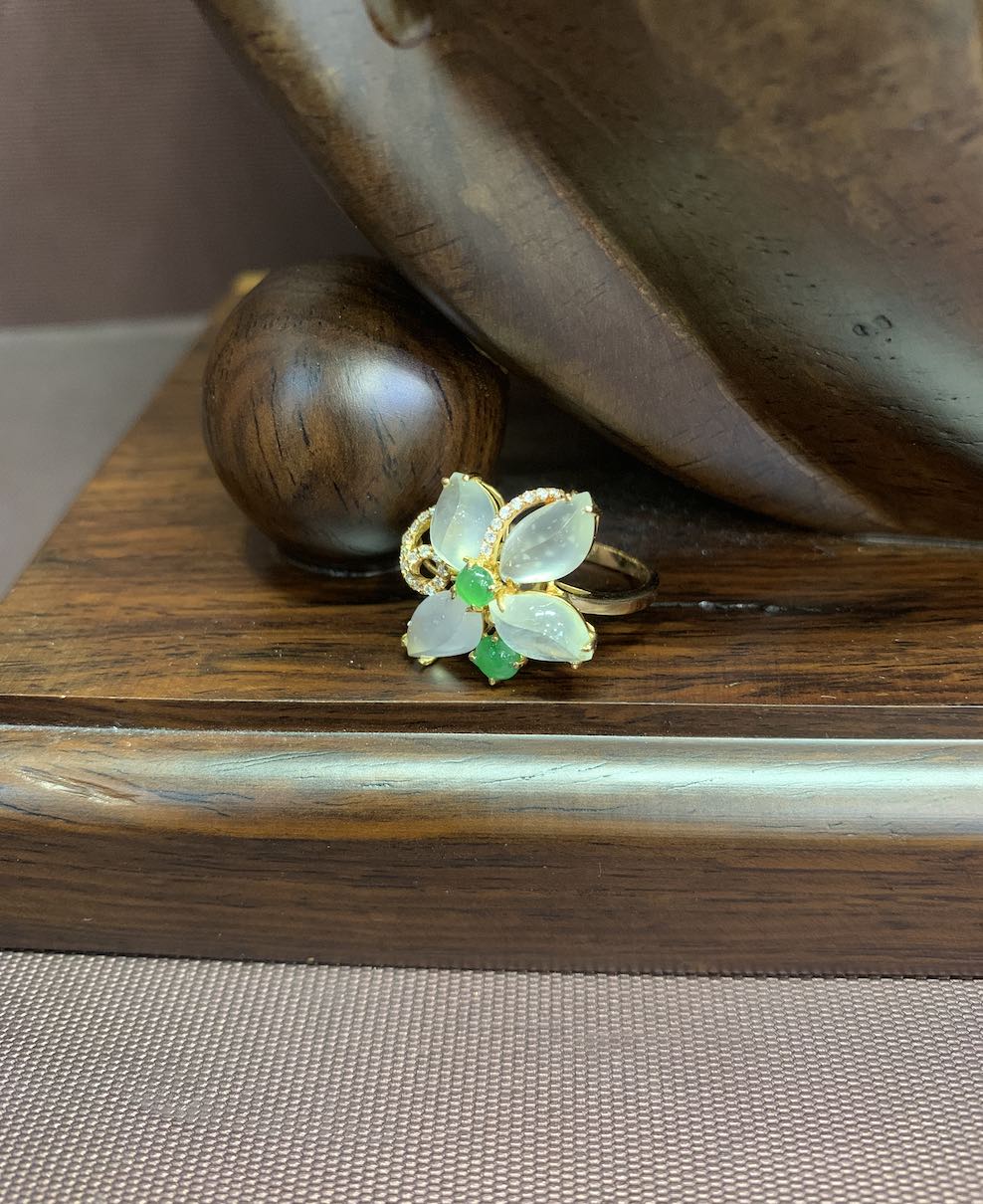 four pieces of highly translucent icy irregular cut jadeite is deigned into a flower jade ring in 18k rose gold