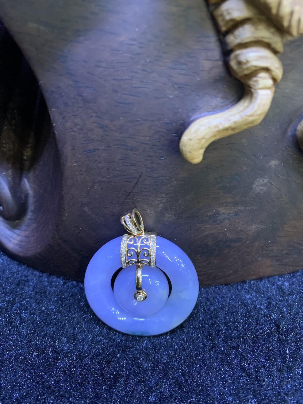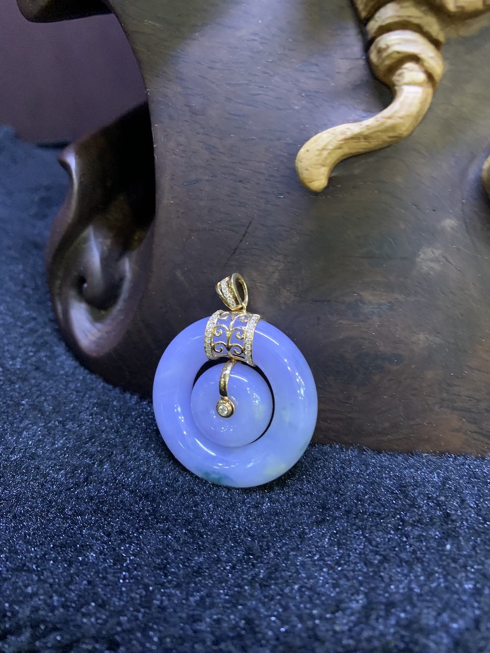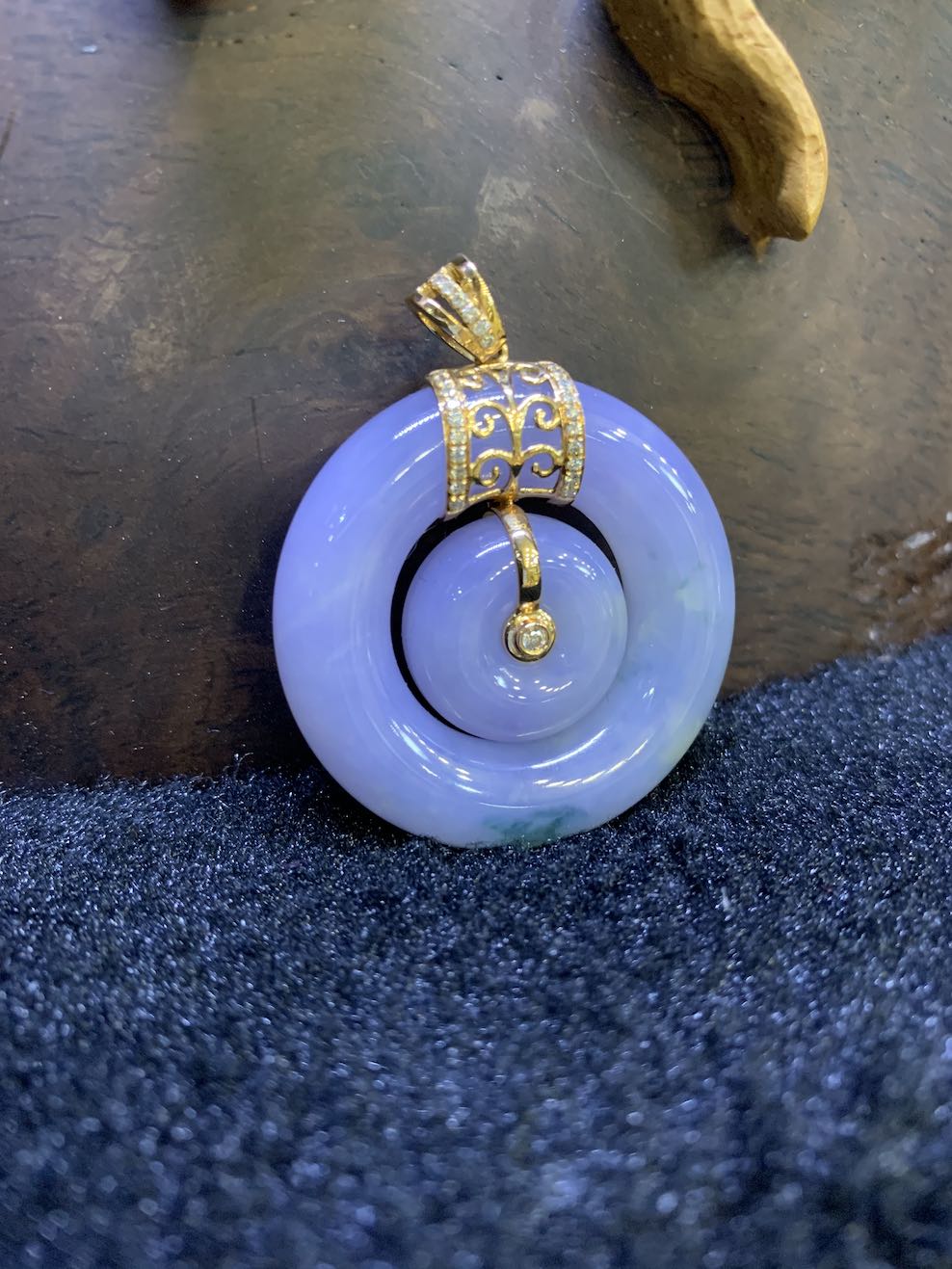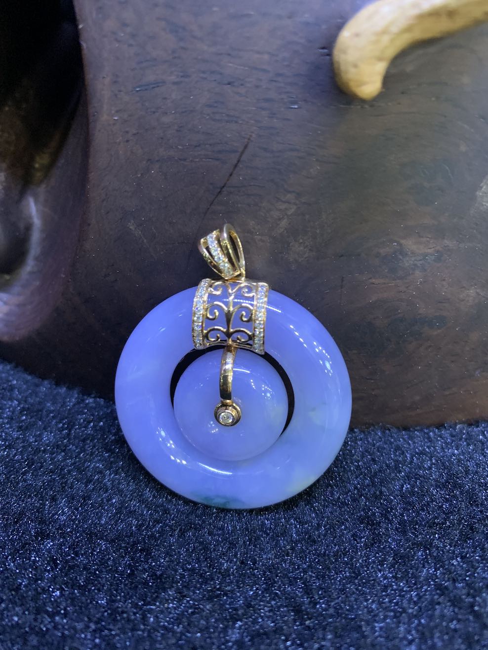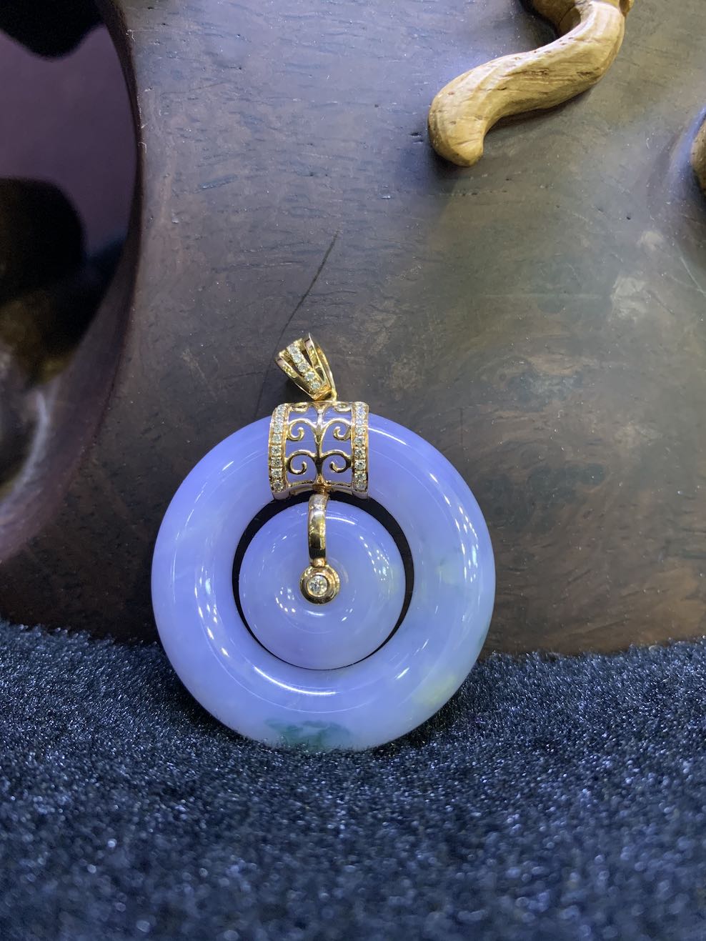 a pair of safety donut is designing into a jade pedant in 18k rose gold and diamonds. Both jade donuts has very icy and translucent jade texture and quality.