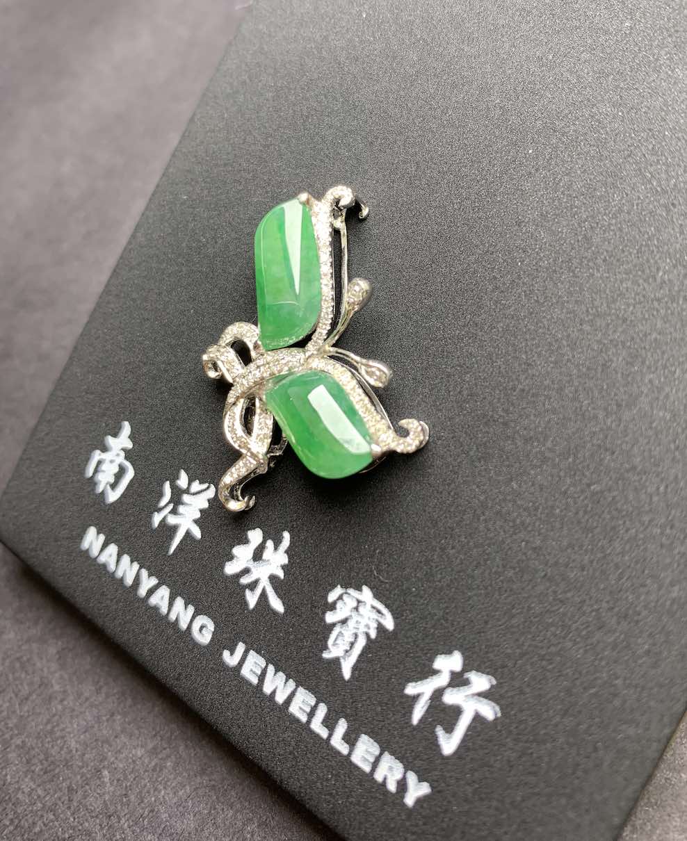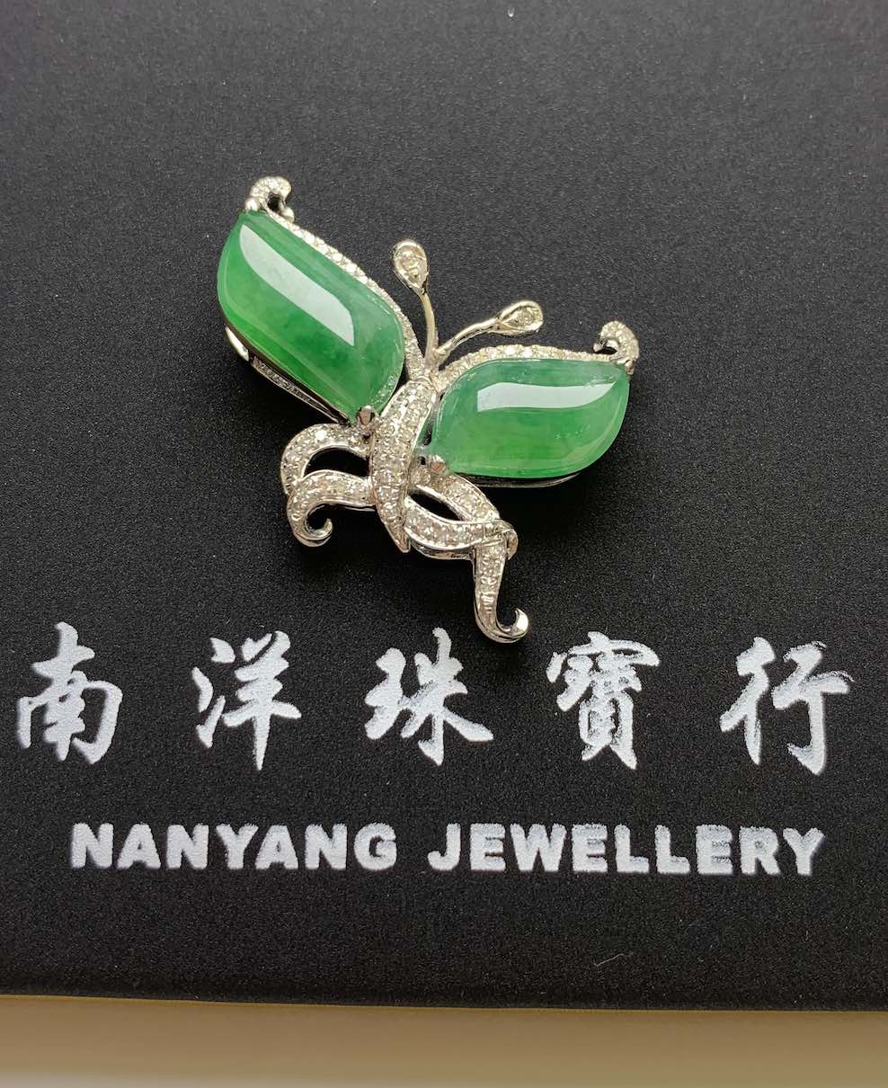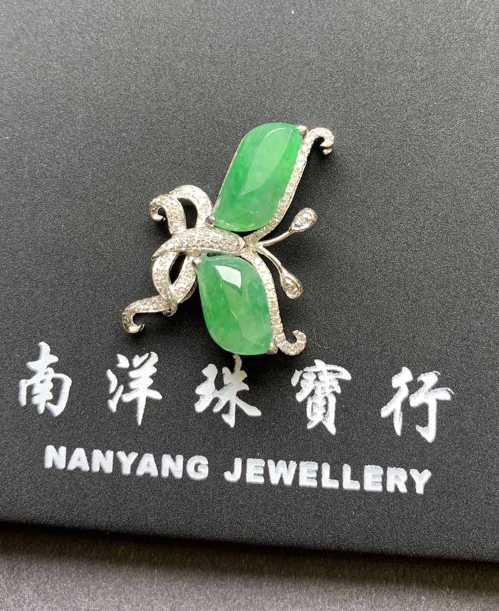 a beautifully designed butterfly with 2 pieces of highly translucent green jadeite in 18k white gold and diamonds.