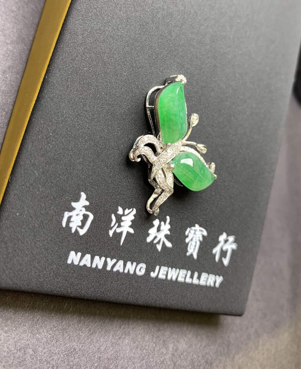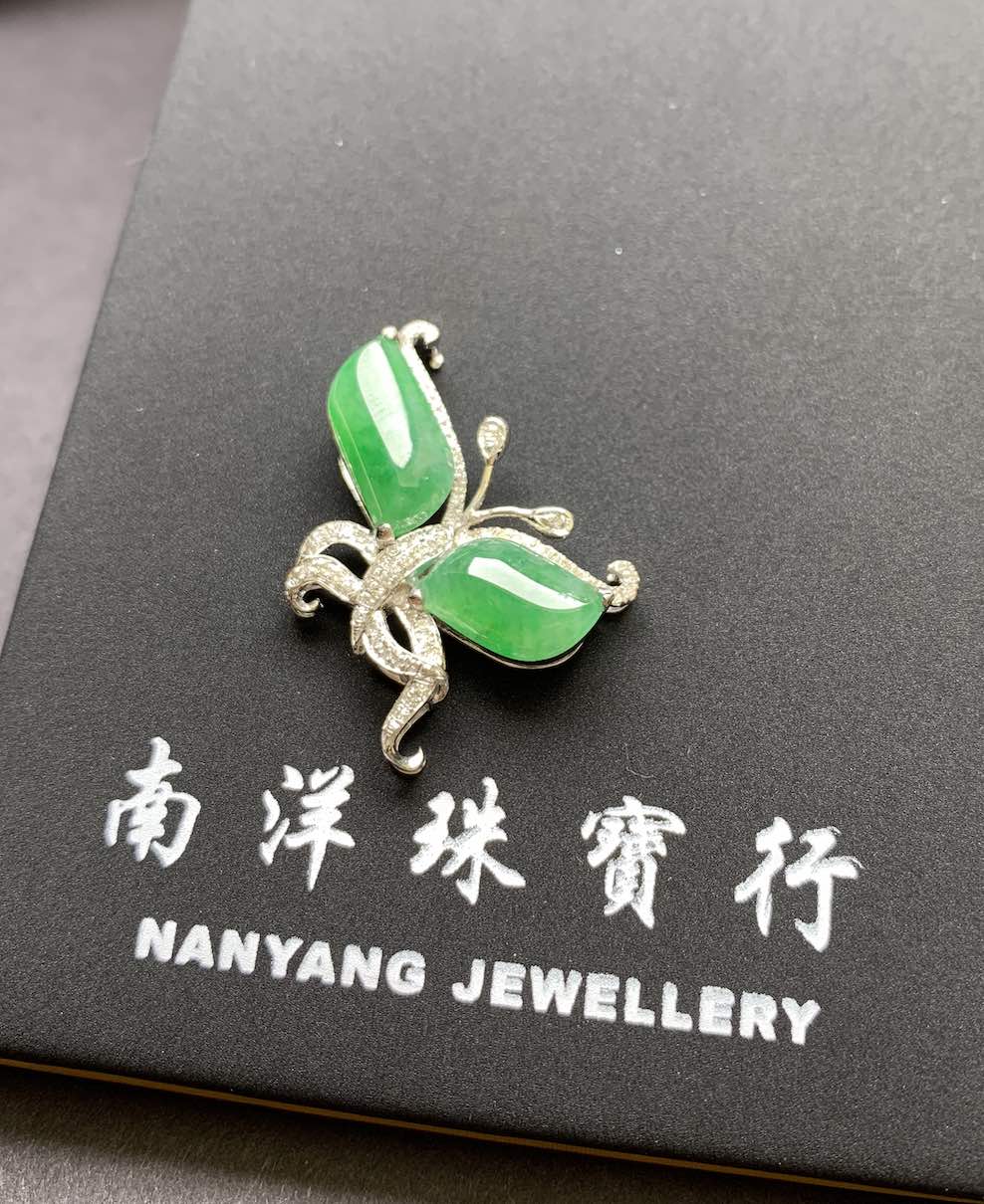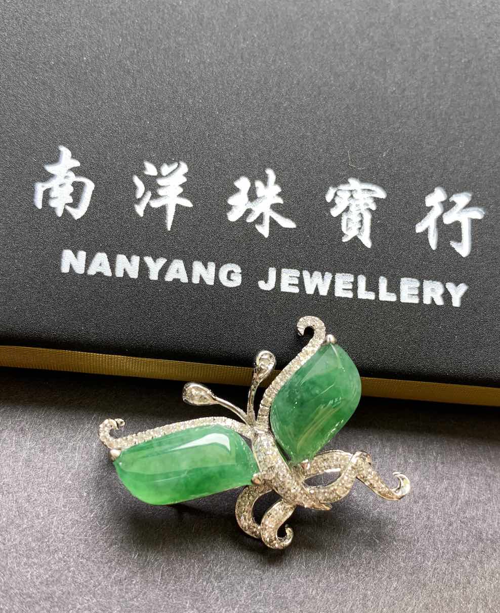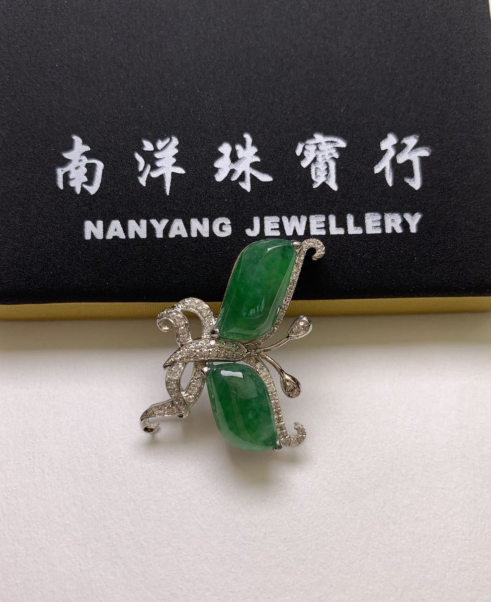 a beautifully designed butterfly with 2 pieces of highly translucent green jadeite in 18k white gold and diamonds.