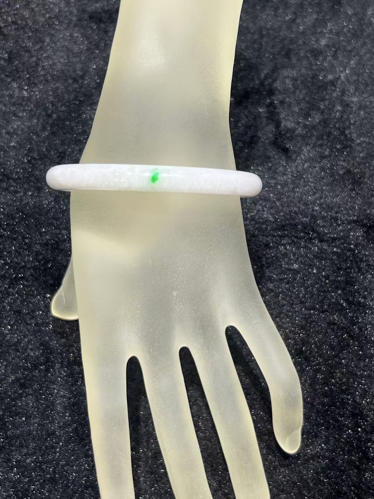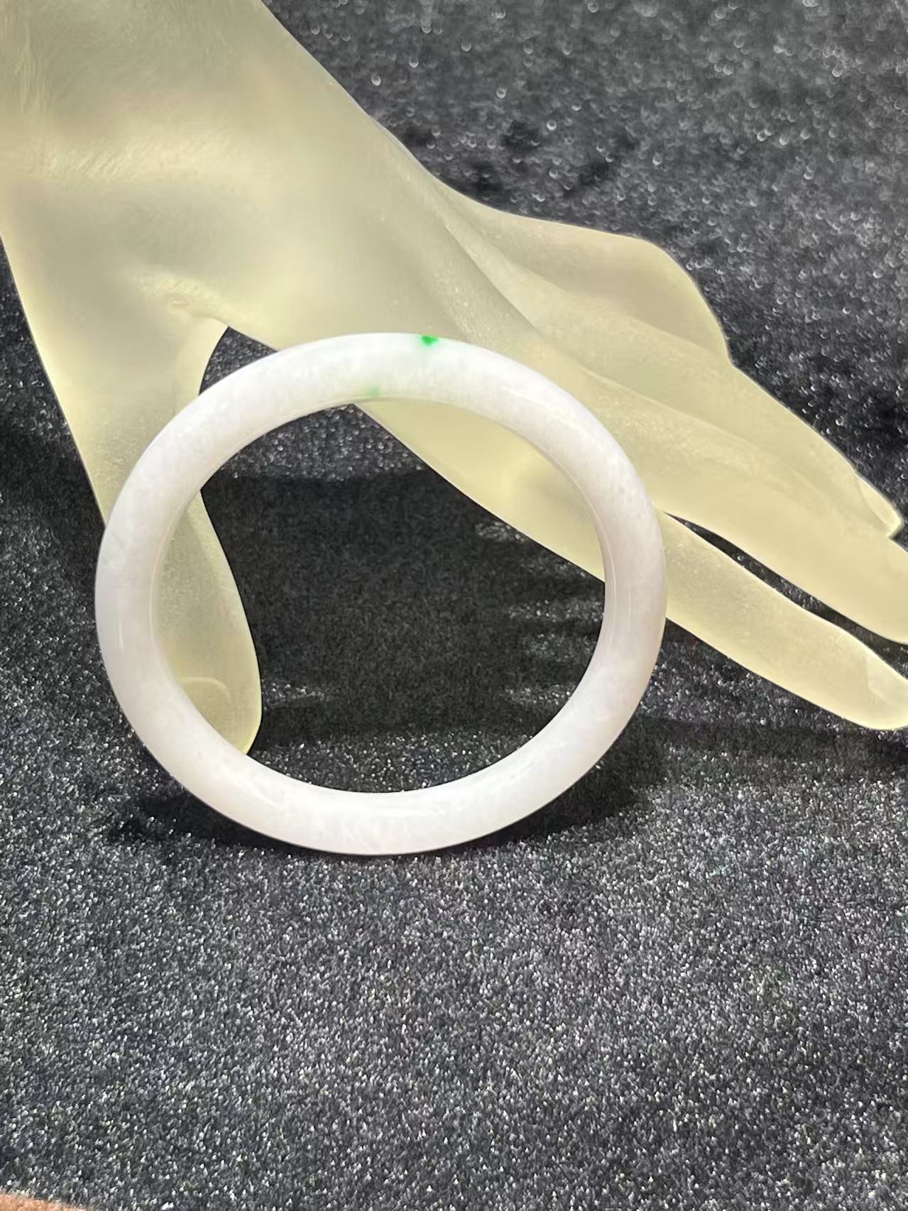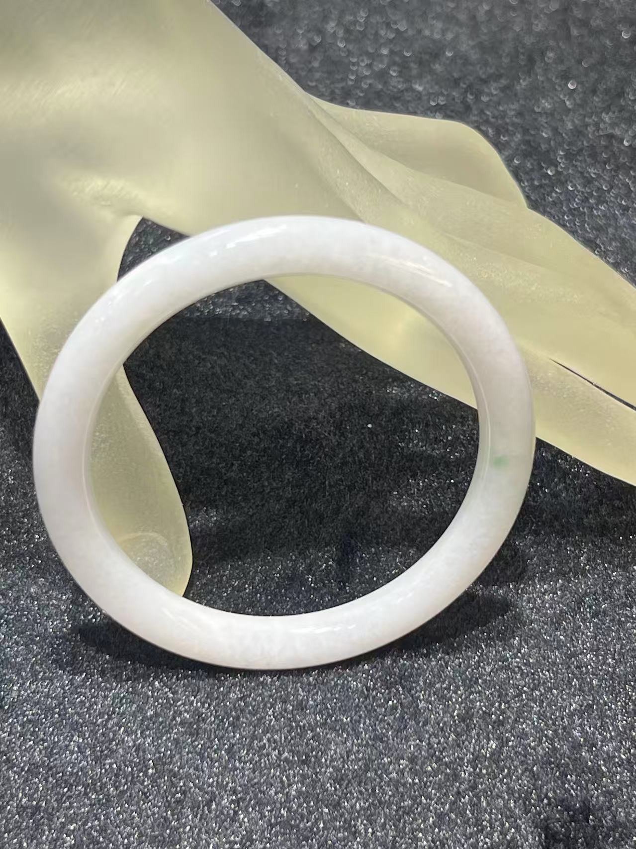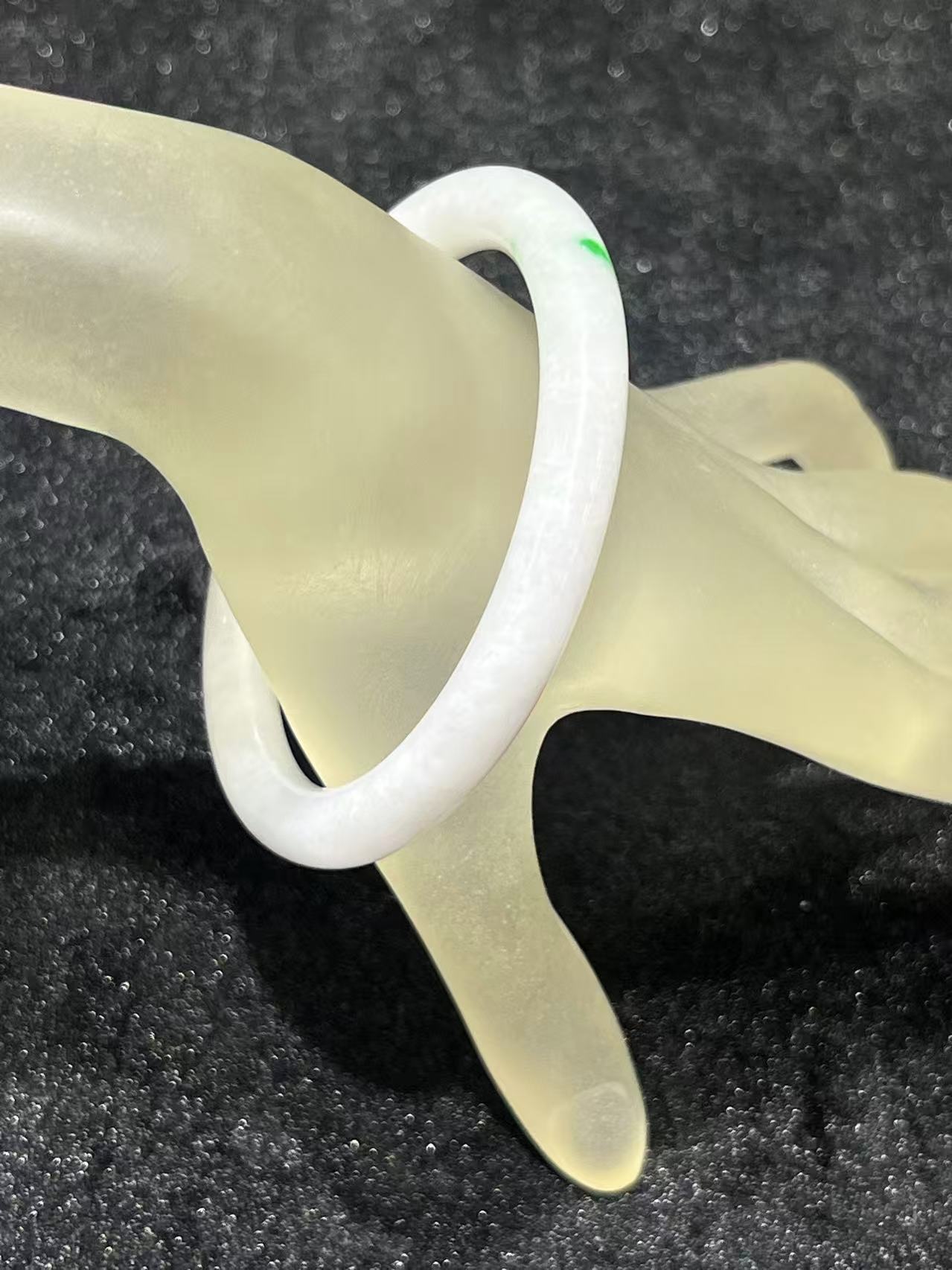 This jadeite bangle presents a soft translucent white tone with a gentle milky texture. The colour appears calm and even across the surface, allowing light to pass through naturally. A small natural green accent emerges on one area of the bangle, adding quiet contrast without overpowering the overall balance.