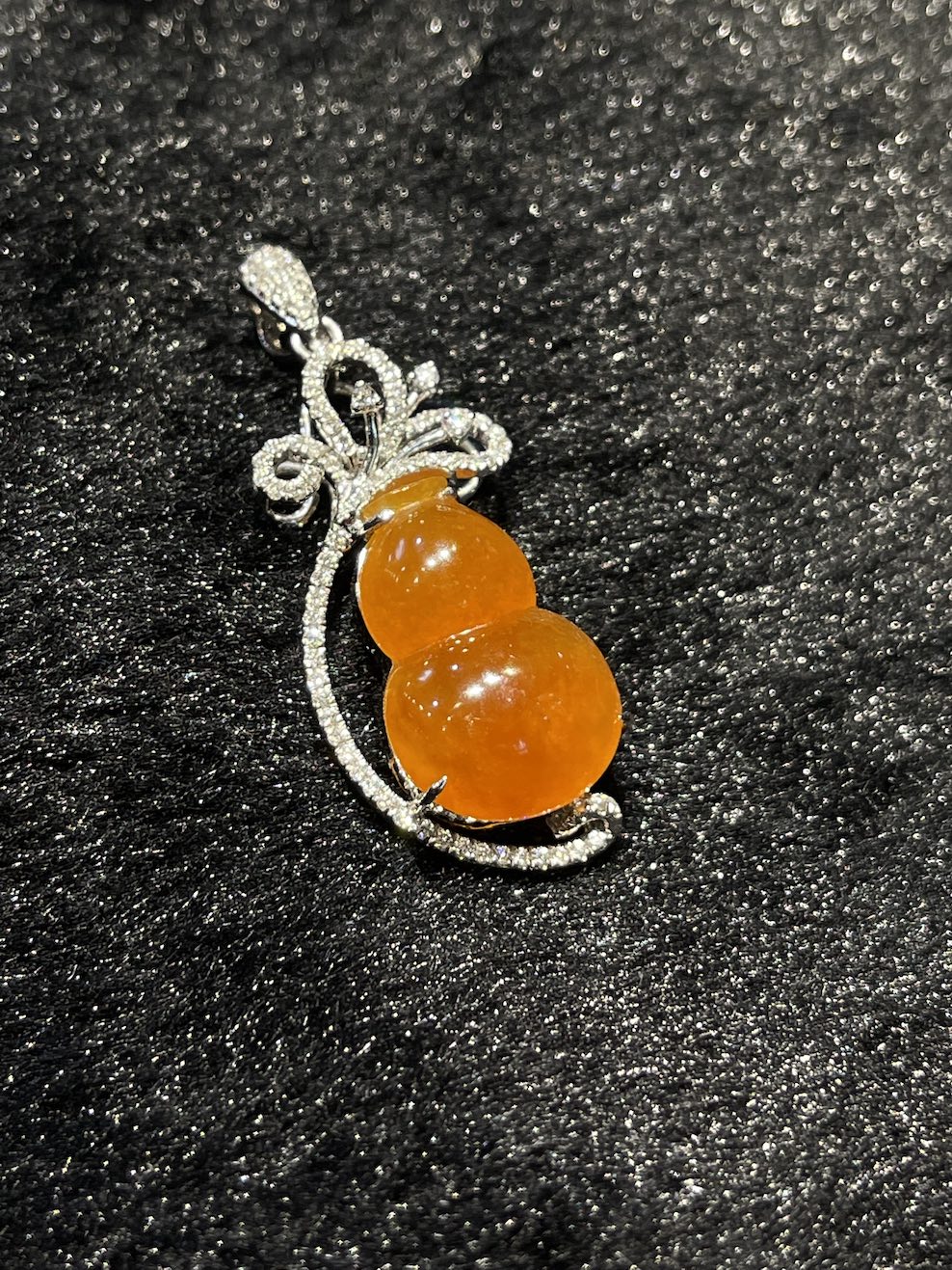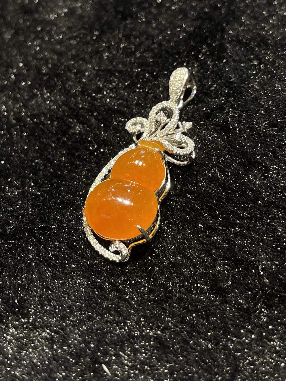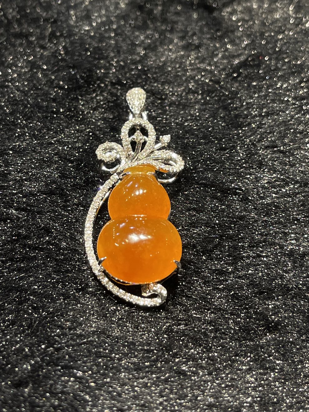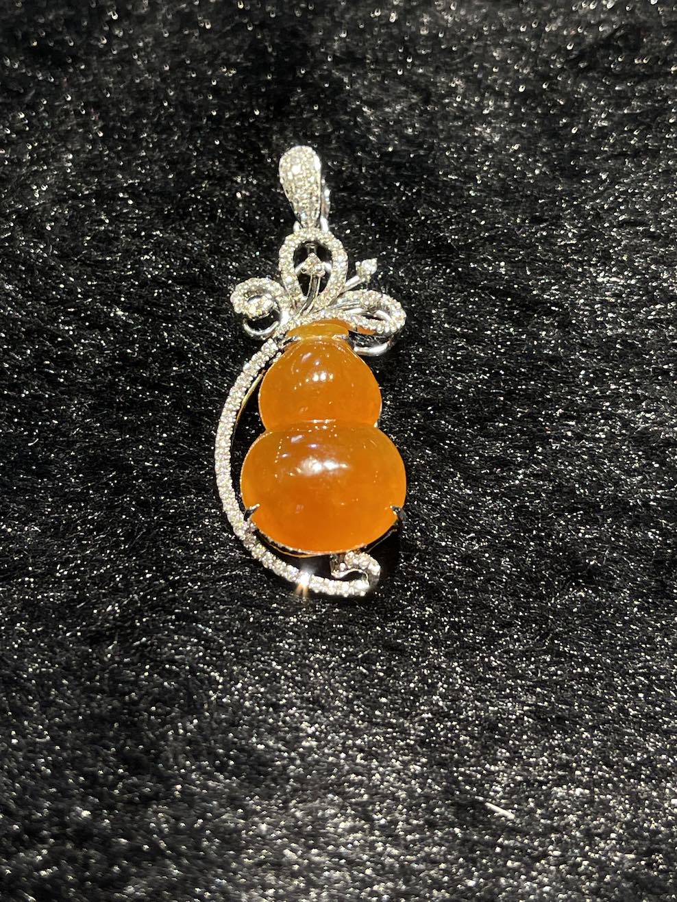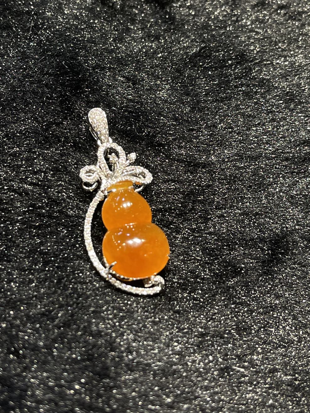 The jade pendant is carving as gourd which meant to bring protection. The jade gourd very good translucency, and it has beautiful reddish orangey colour. The setting is in 18k white gold and diamonds.
