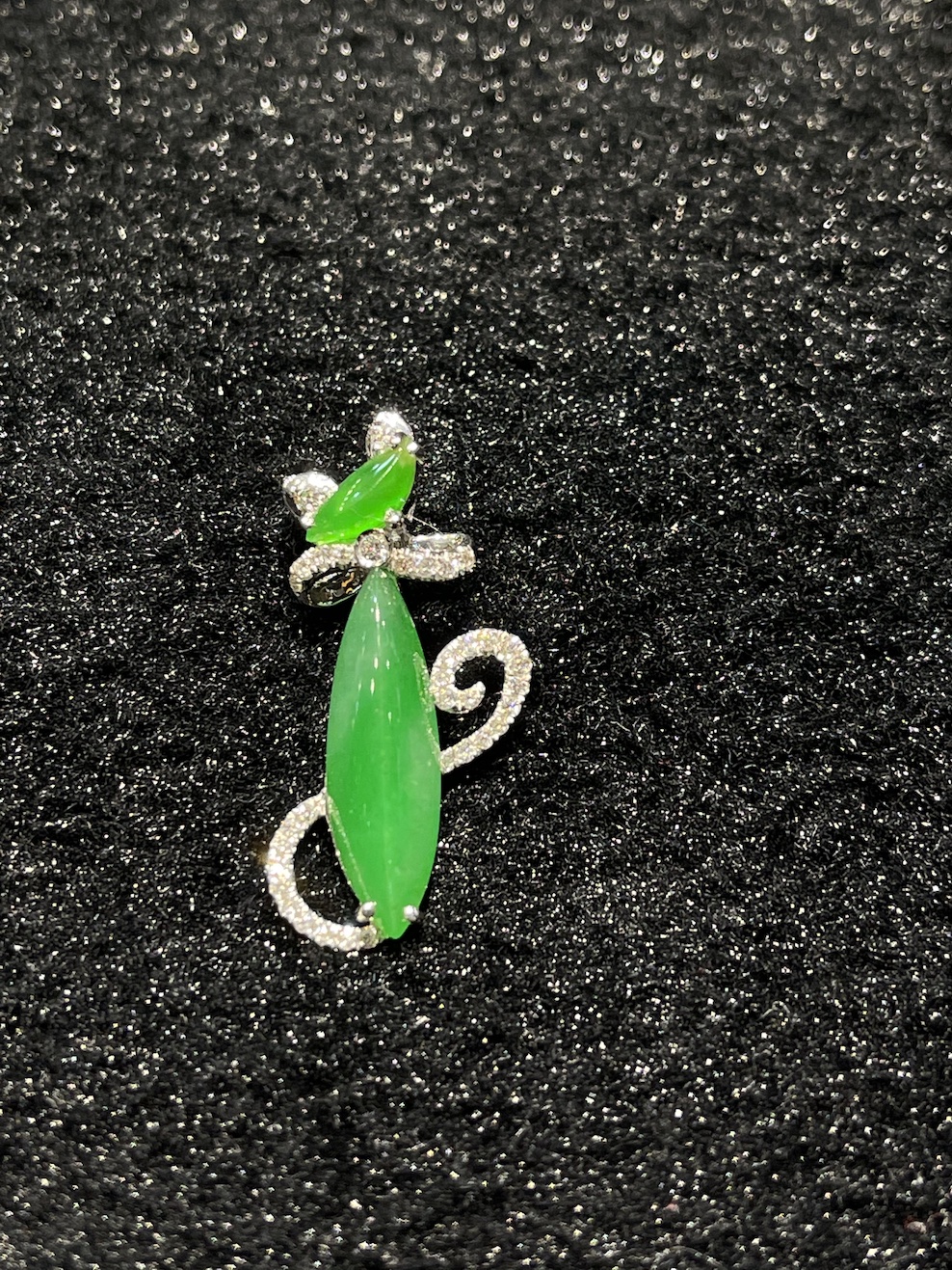 Two pieces of loose jade is designing into a jade pendant in cat design in 18k white gold and diamonds. The jade has very translucent and vibrant green.