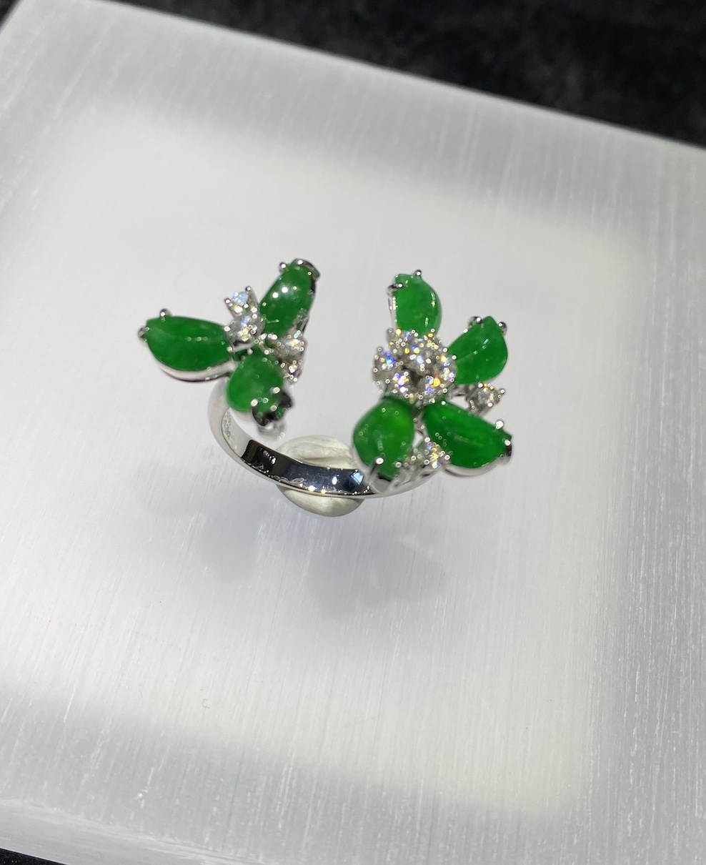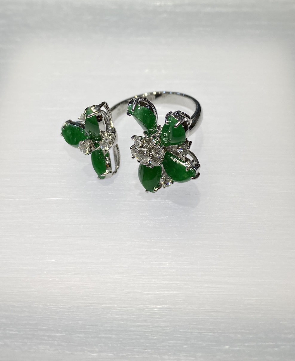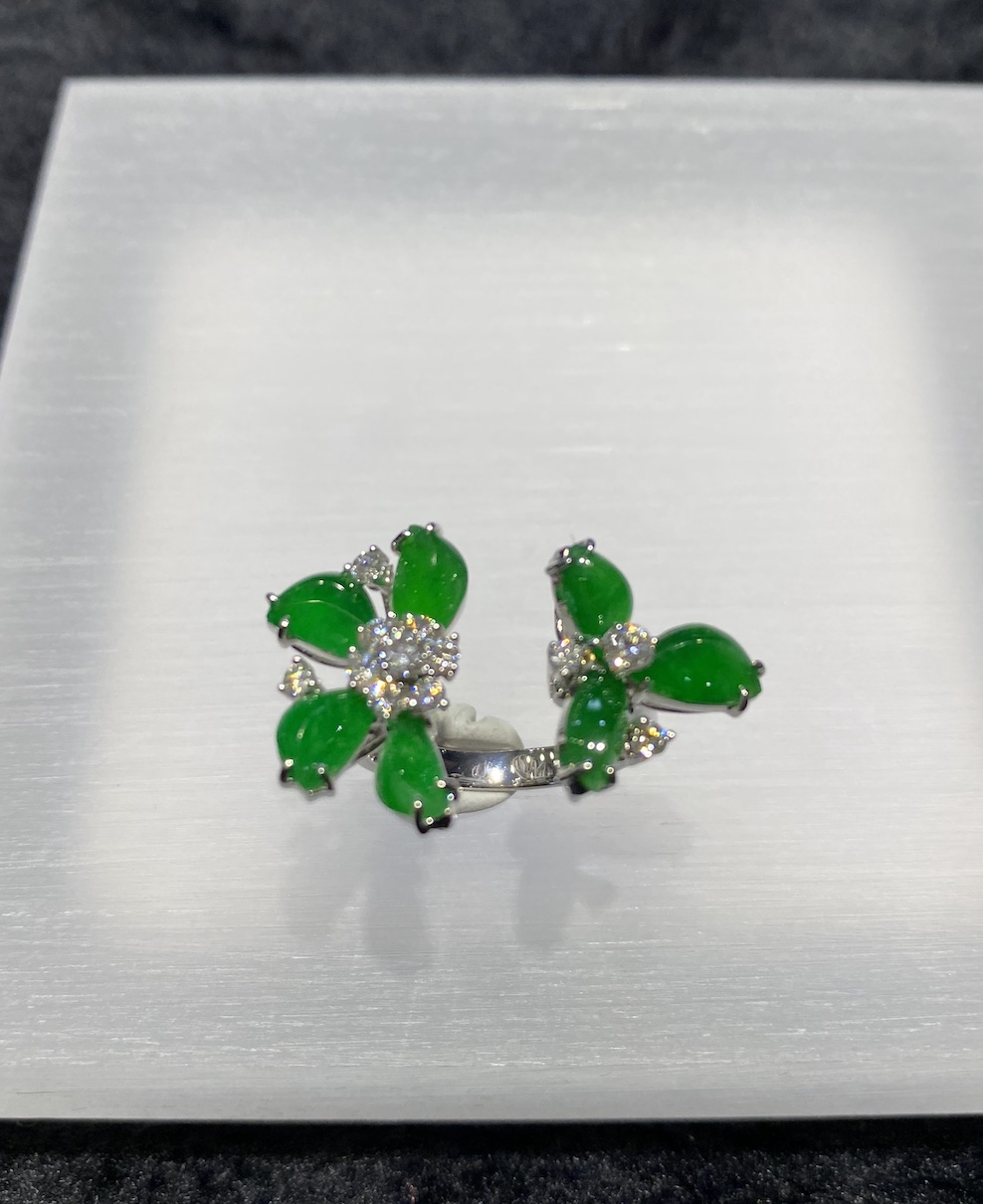 Seven pieces of loose irregular shape jade stone has very icy and translucent vibrant green colour. The jade stones are designed into a flower shape jade ring with 18k white and diamonds. It is a beautiful and fashionable jade ring.