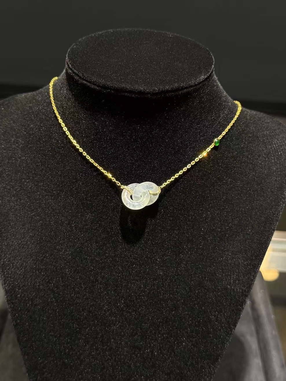 This icy translucent double safety-knot pendant presents a refreshing and serene look. The jadeite carries a gentle clarity, and its cool tone shifts softly under light, showing faint natural clouding that adds depth rather than uniformity. These organic traits reflect the authentic nature of jadeite, giving the piece a calm and genuine presence.
