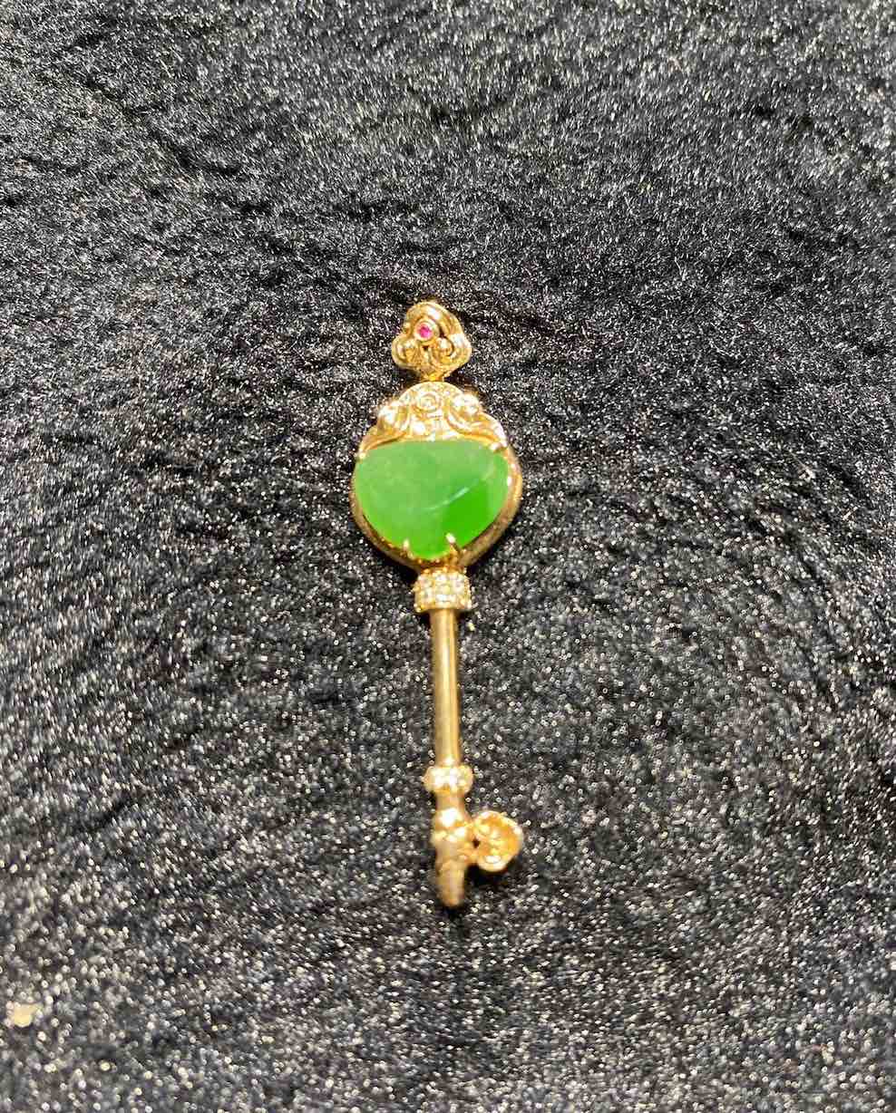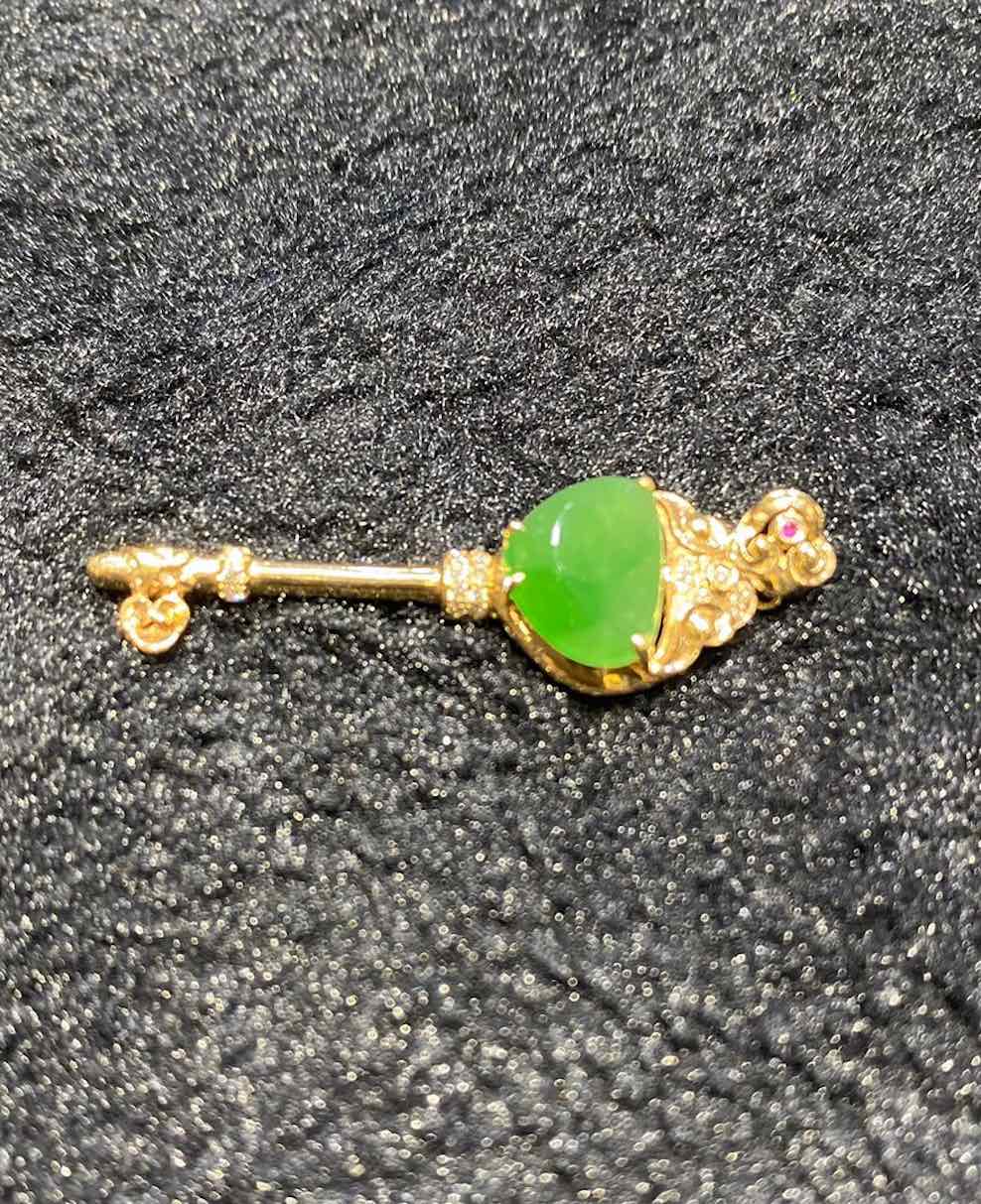 An icy translucent heart shape jade pendant has very vivid green colour. the jade pendant is designed as a key shape in 18k yellow gold with diamonds and pink sapphire. it also symbolise the key to success.