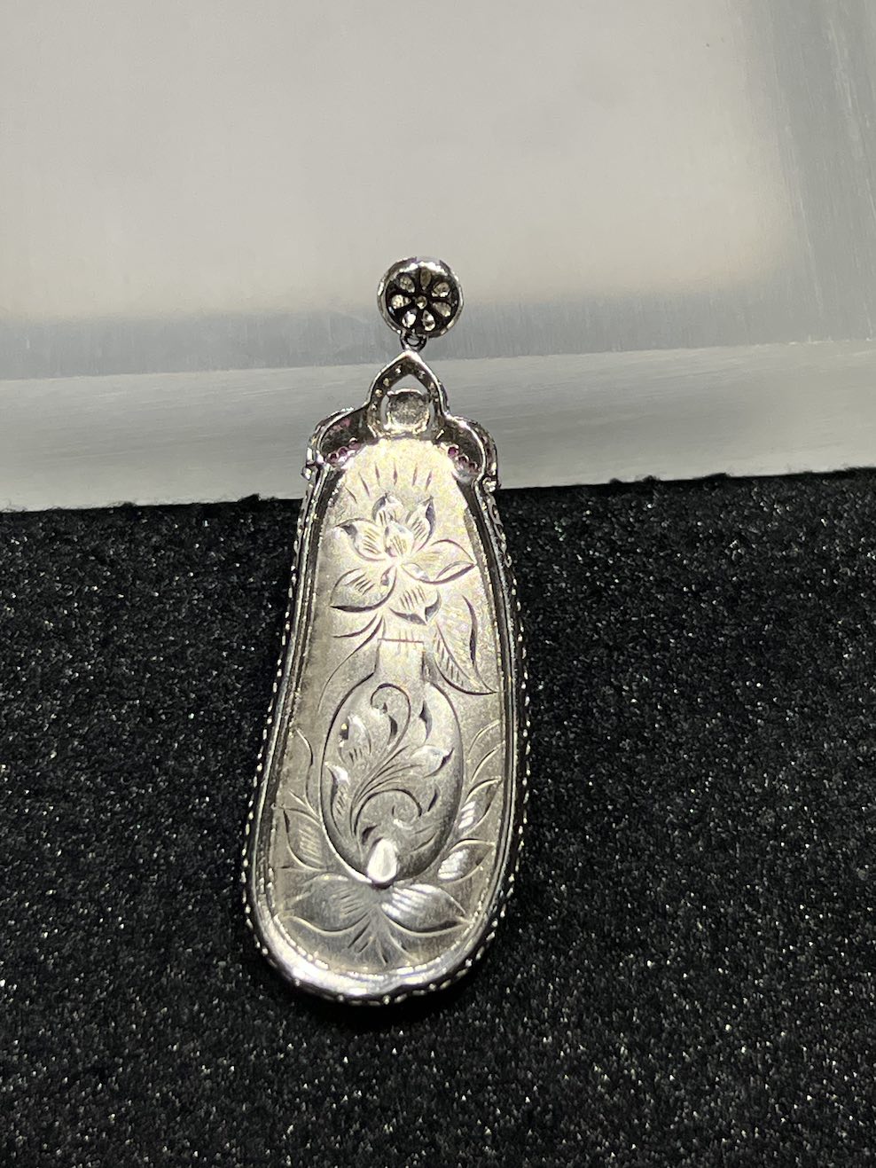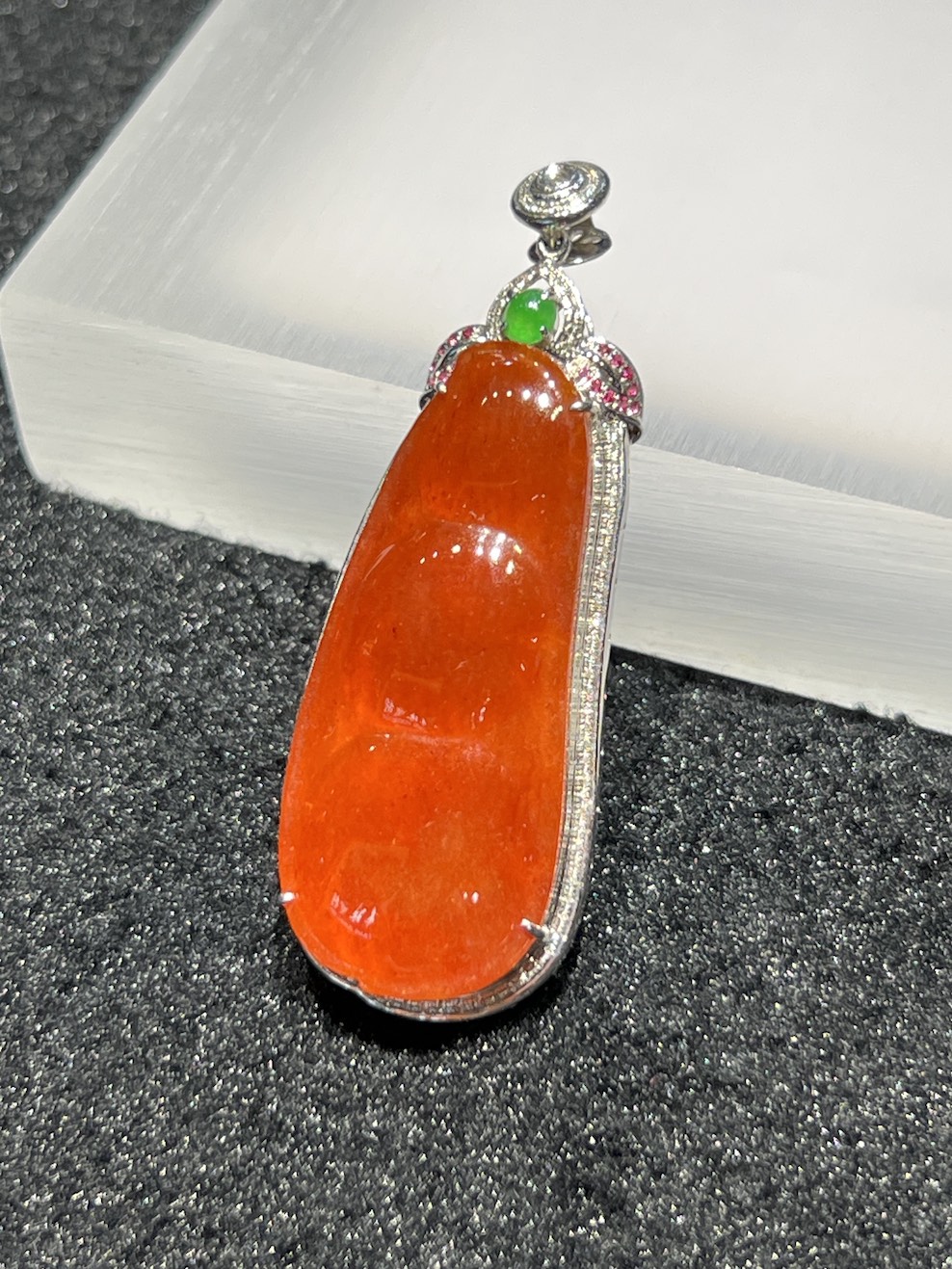 The jade pendant is well carved as a pea pod design, it symbols for growth, prosperity and fortune. The jade pendant has icy reddish colour with good translucency. The setting is in 18k white gold with diamonds and pink sapphires.