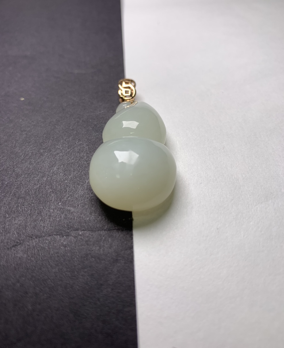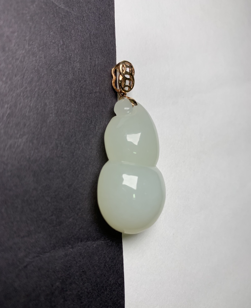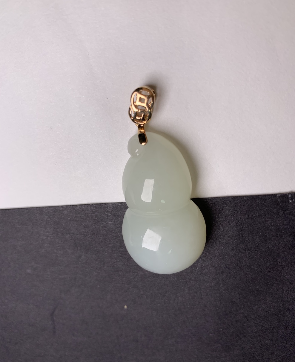 a simply carved nephrite pendant as gourd set in 18k pink gold.