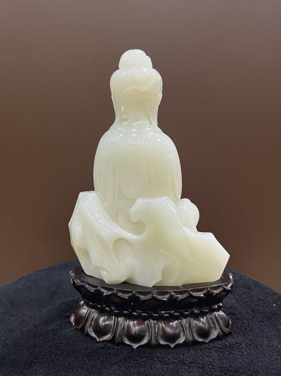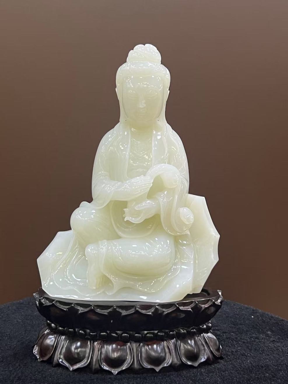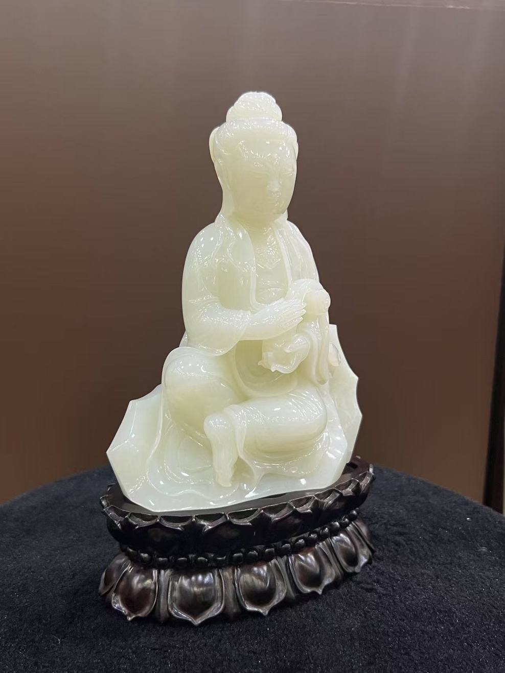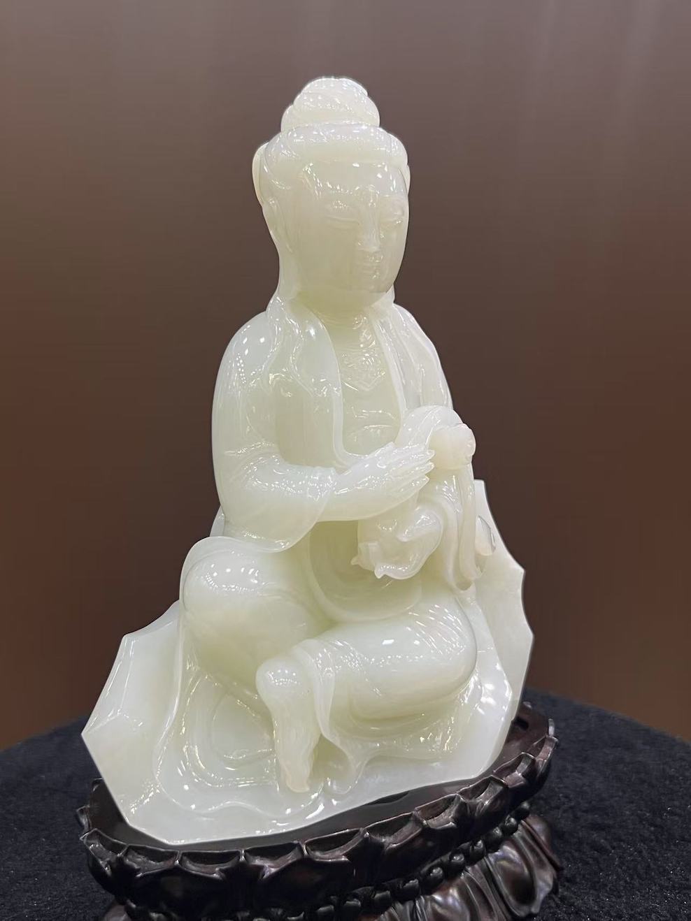 Elevated on a lotus-shaped wooden base, this sacred sculpture embodies peace, protection, and spiritual guidance — a timeless piece ideal for display in spaces of contemplation or reverence.