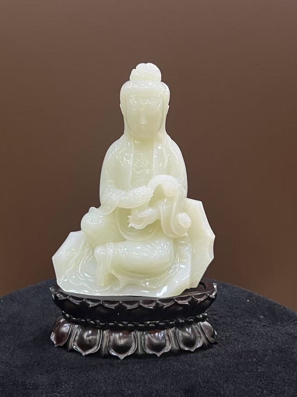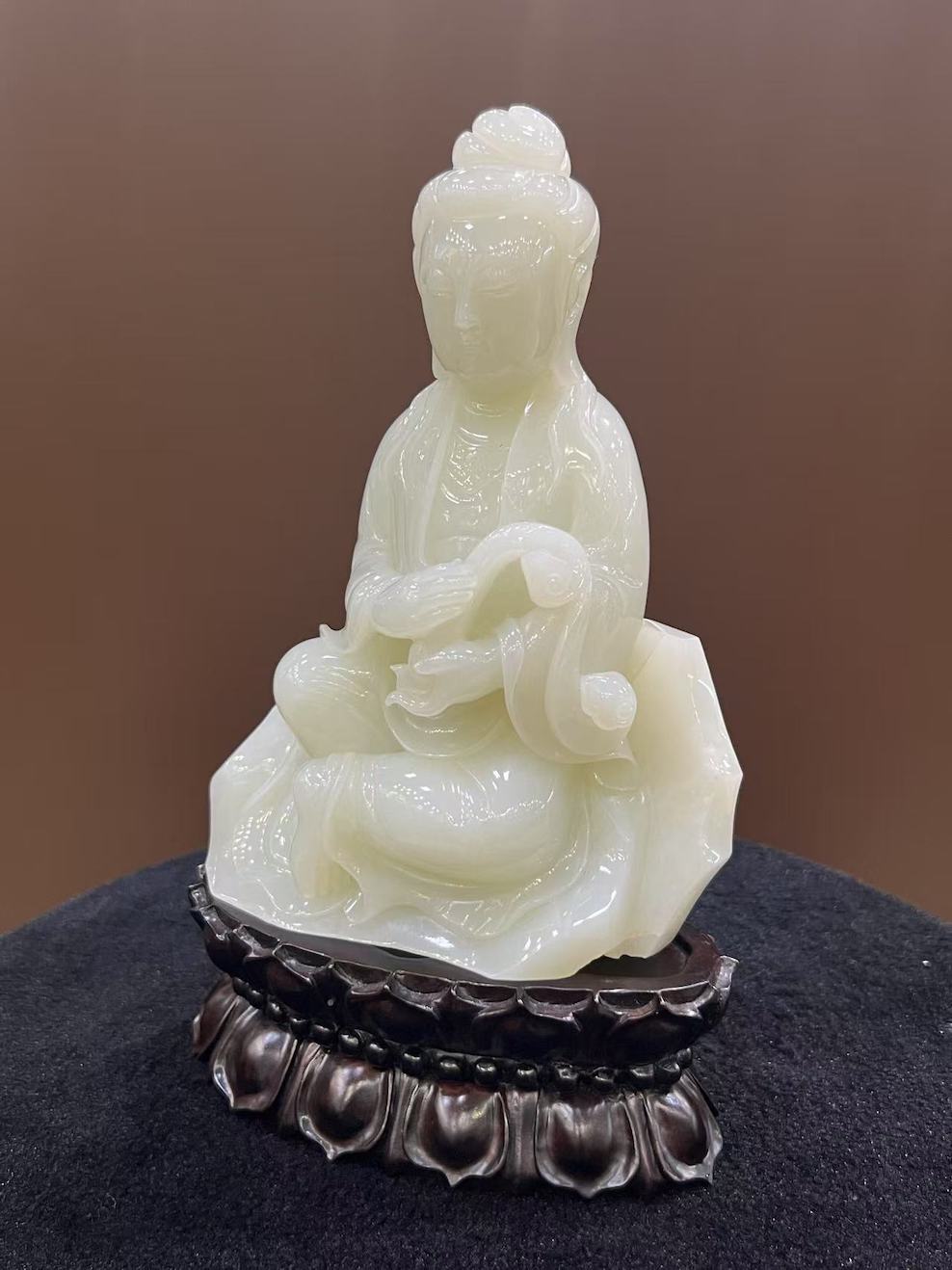 Depicted in a seated meditative posture, Guanyin — the Bodhisattva of Compassion — is rendered with elegant lines and graceful drapery that flows naturally around her form. The folds of her robe, her tranquil facial expression, and the delicate gesture of her hand cradling a scroll or vessel are executed with refined detail, showcasing both the jade’s softness and the carver’s skill.