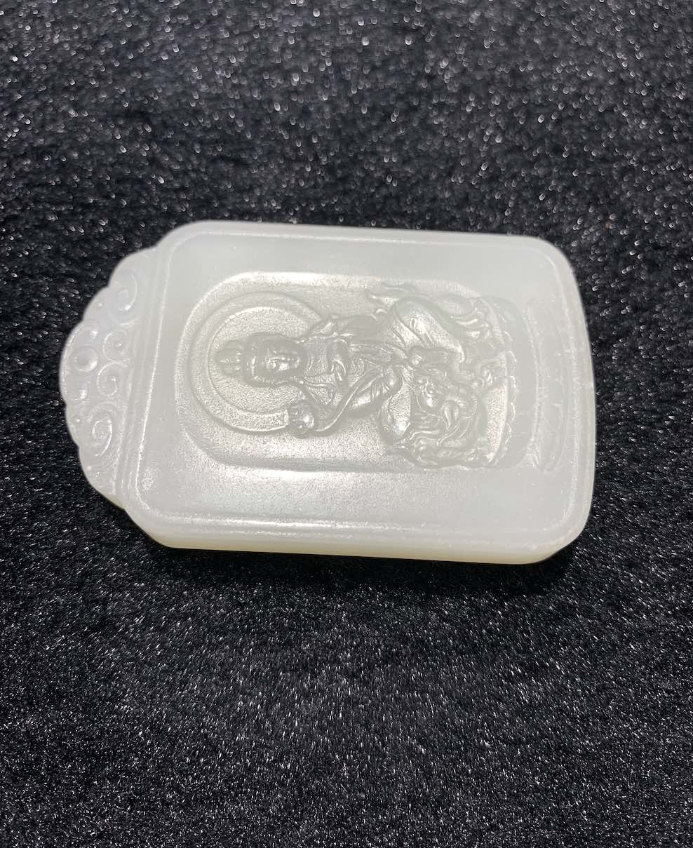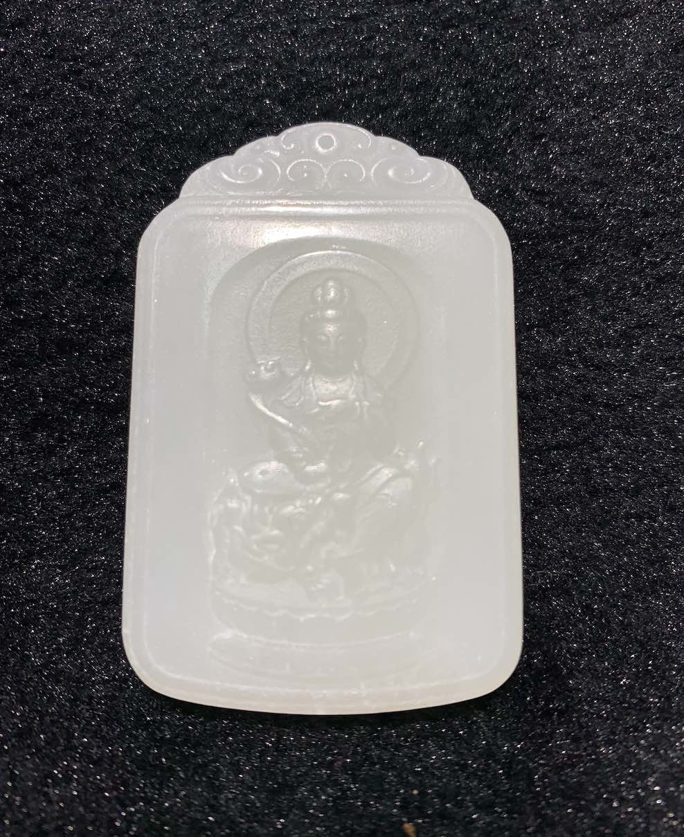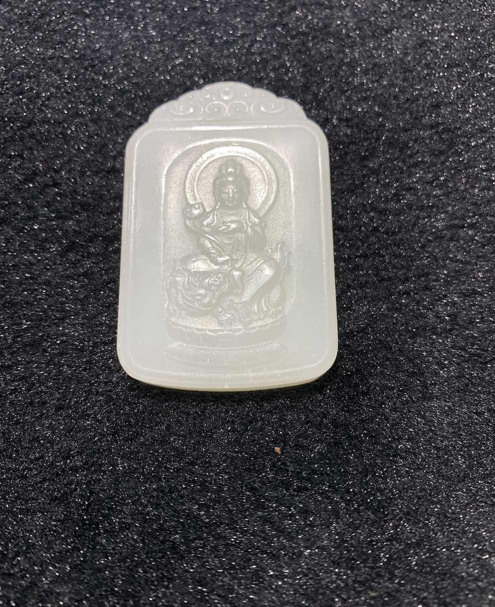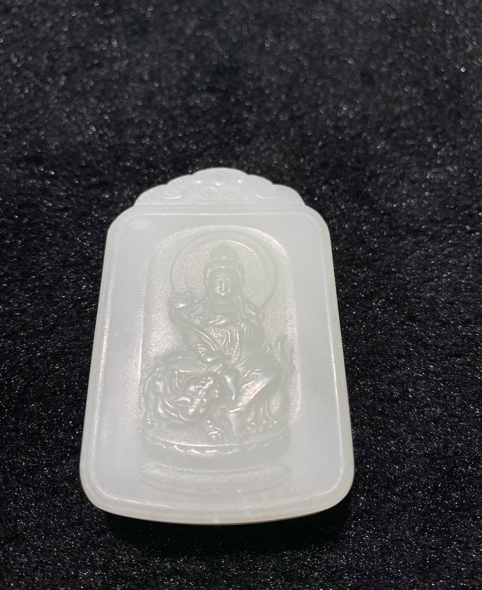 a nephrite jade pendant is well carved with GuanYin sitting on elephant and holding a Ruyi. The white jade pendant has very fine and waxy texture.