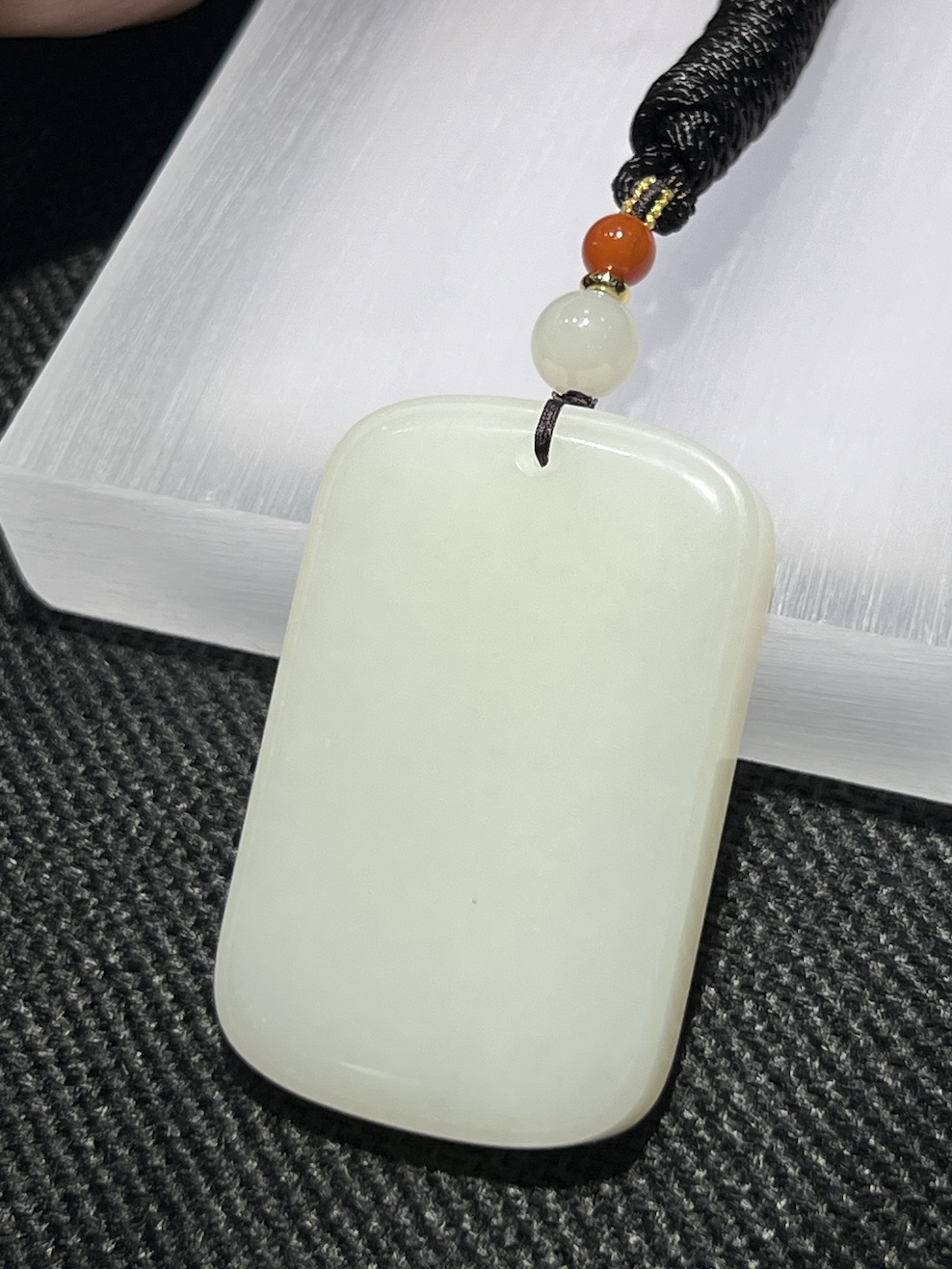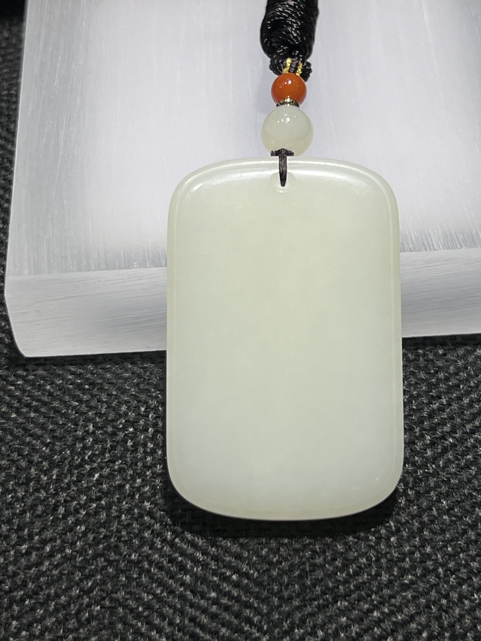 The nephrite is carving as a safety rectangle pendant symbols for protection(平安无事). The nephrite pendant has very waxy white jade texture.
