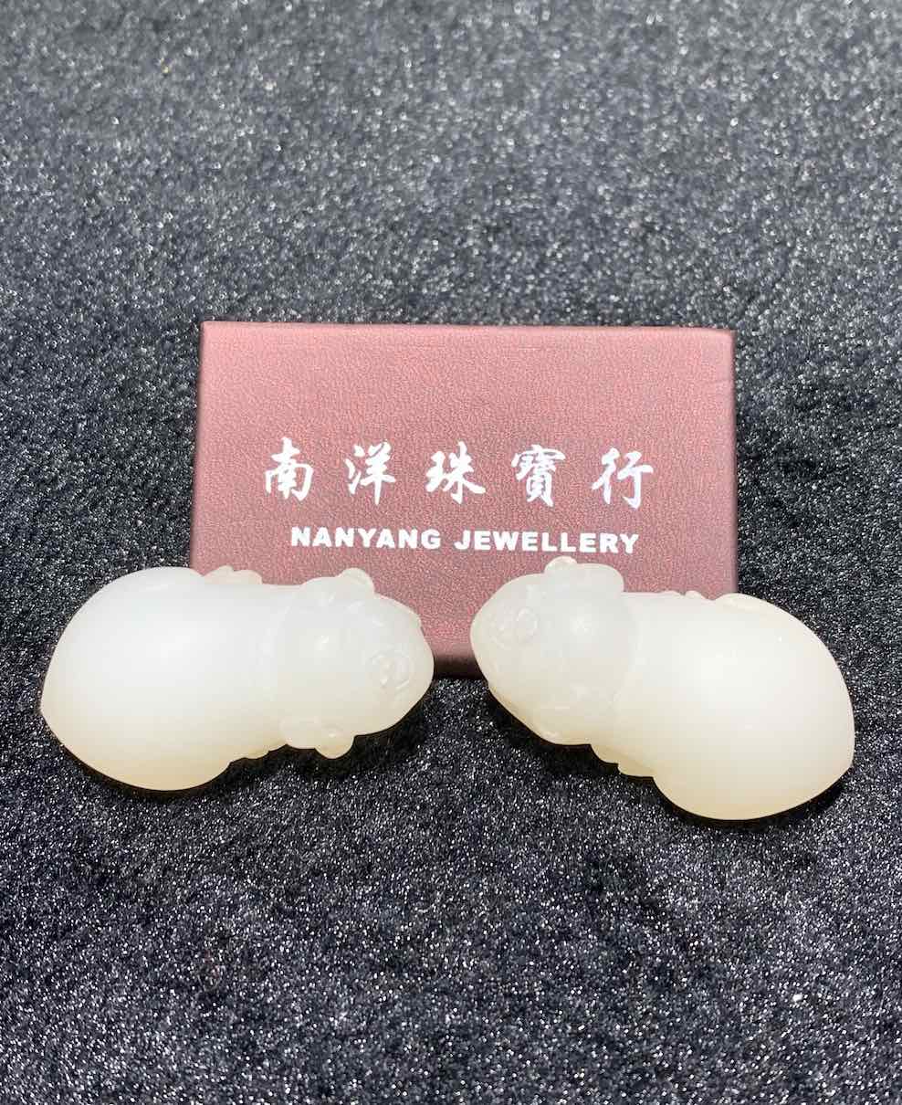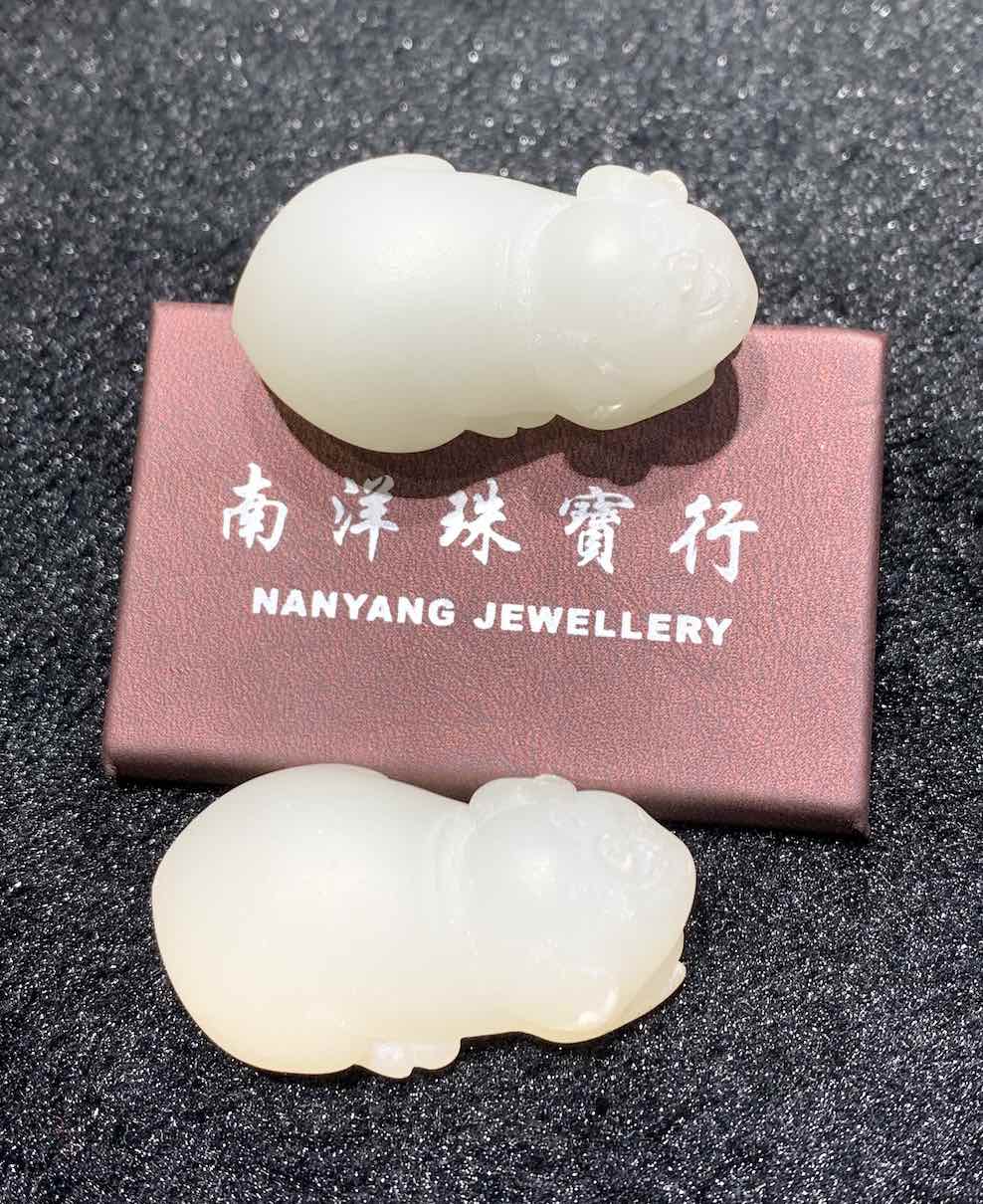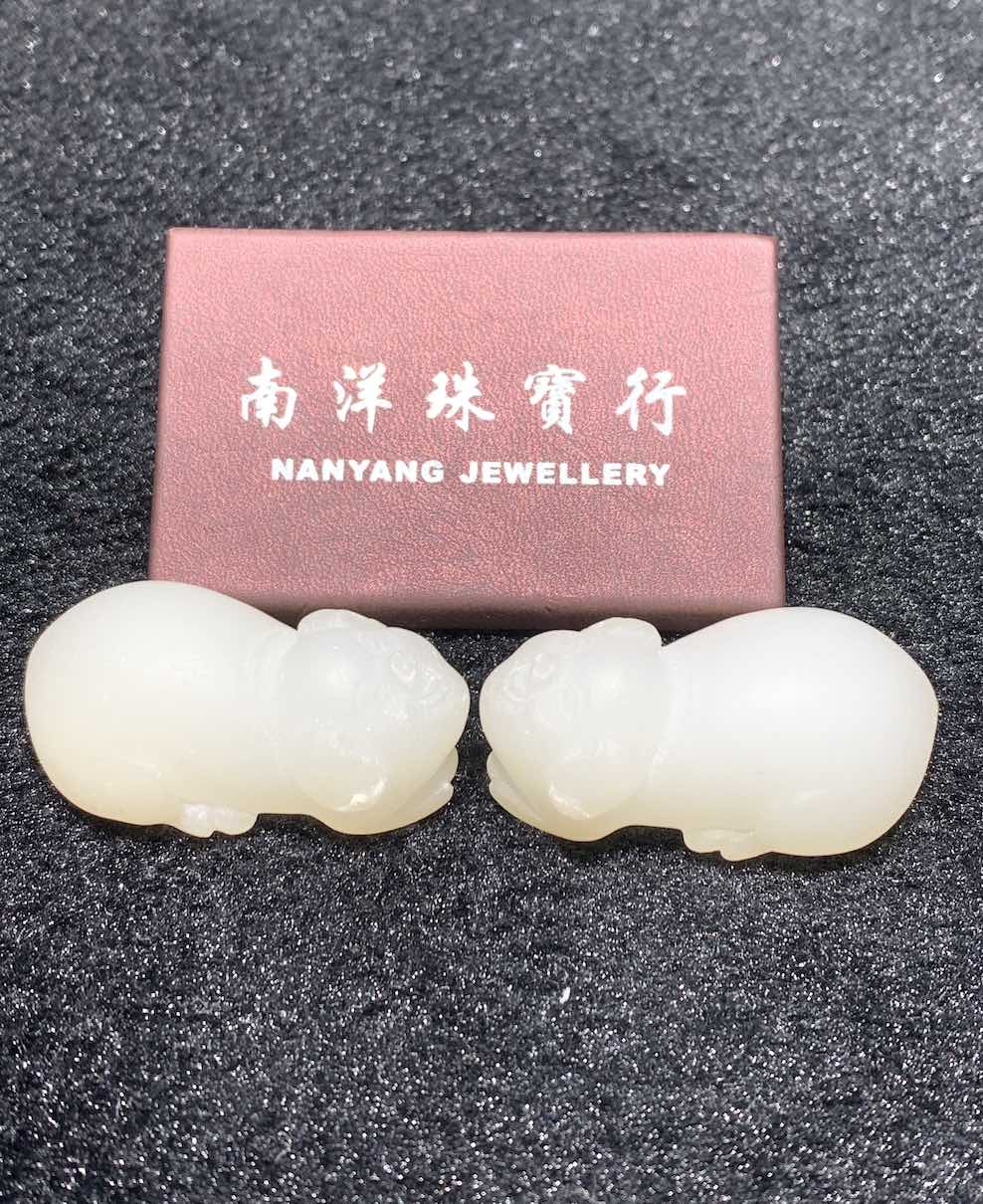 a pair of lovely pigs is carved from natural nephrite jade. it is unique as they are unpolished yet the whiteness of the jade is excellent. they can be worn as pendant or displayed as small ornament.