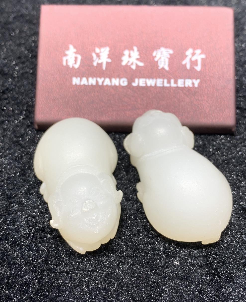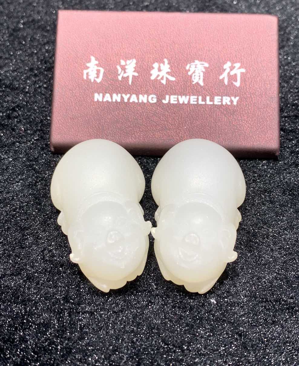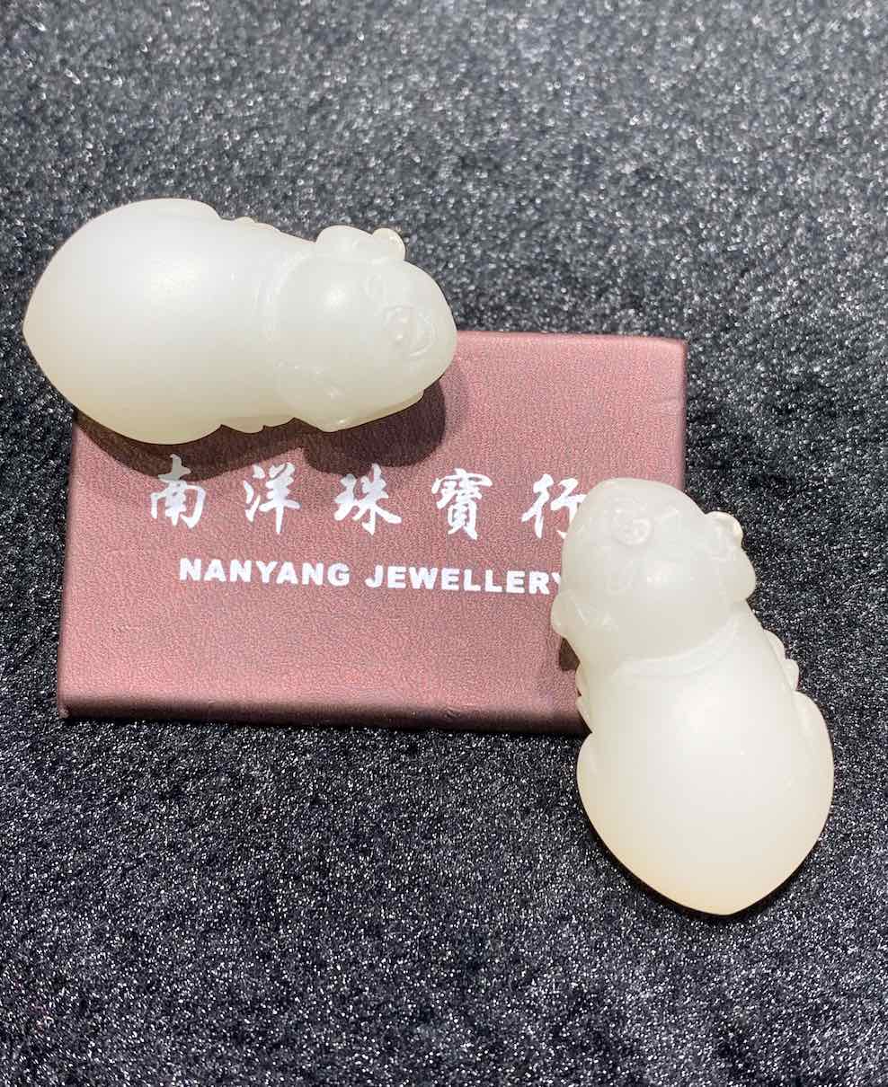 a pair of lovely pigs is carved from natural nephrite jade. it is unique as they are unpolished yet the whiteness of the jade is excellent. they can be worn as pendant or displayed as small ornament.