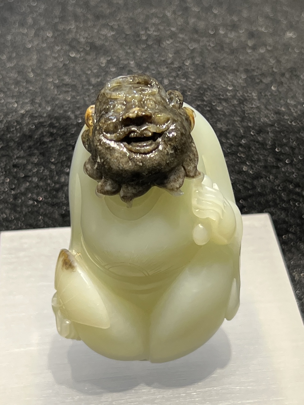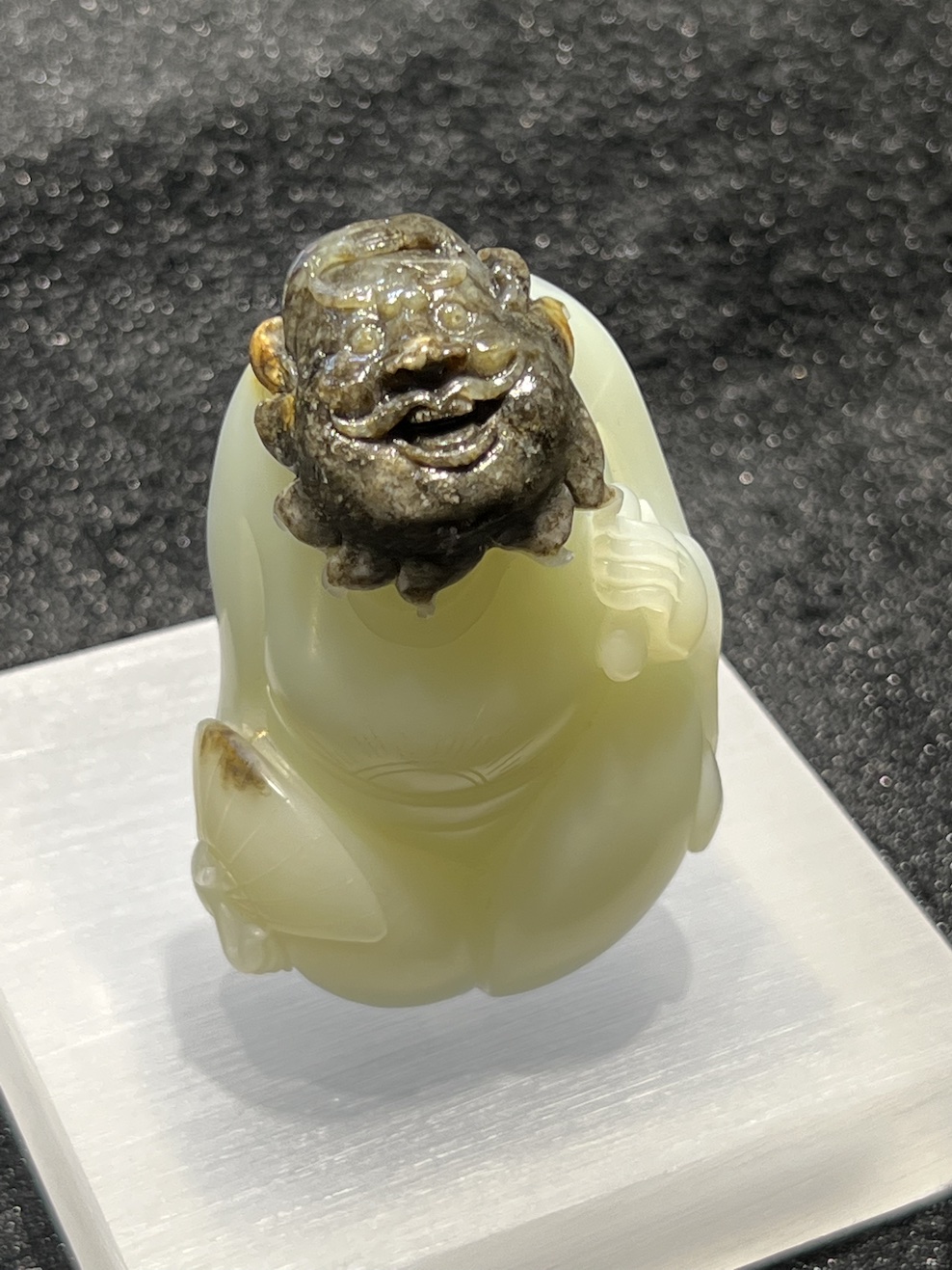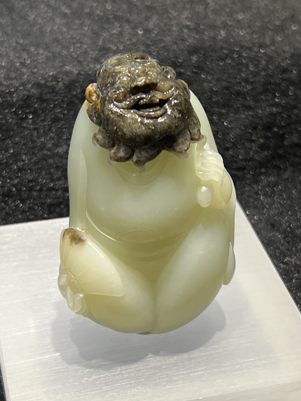 A white jade is carved as Zhongkui which is designed on the skin of the nephrite. The nephrite has really fine texture.