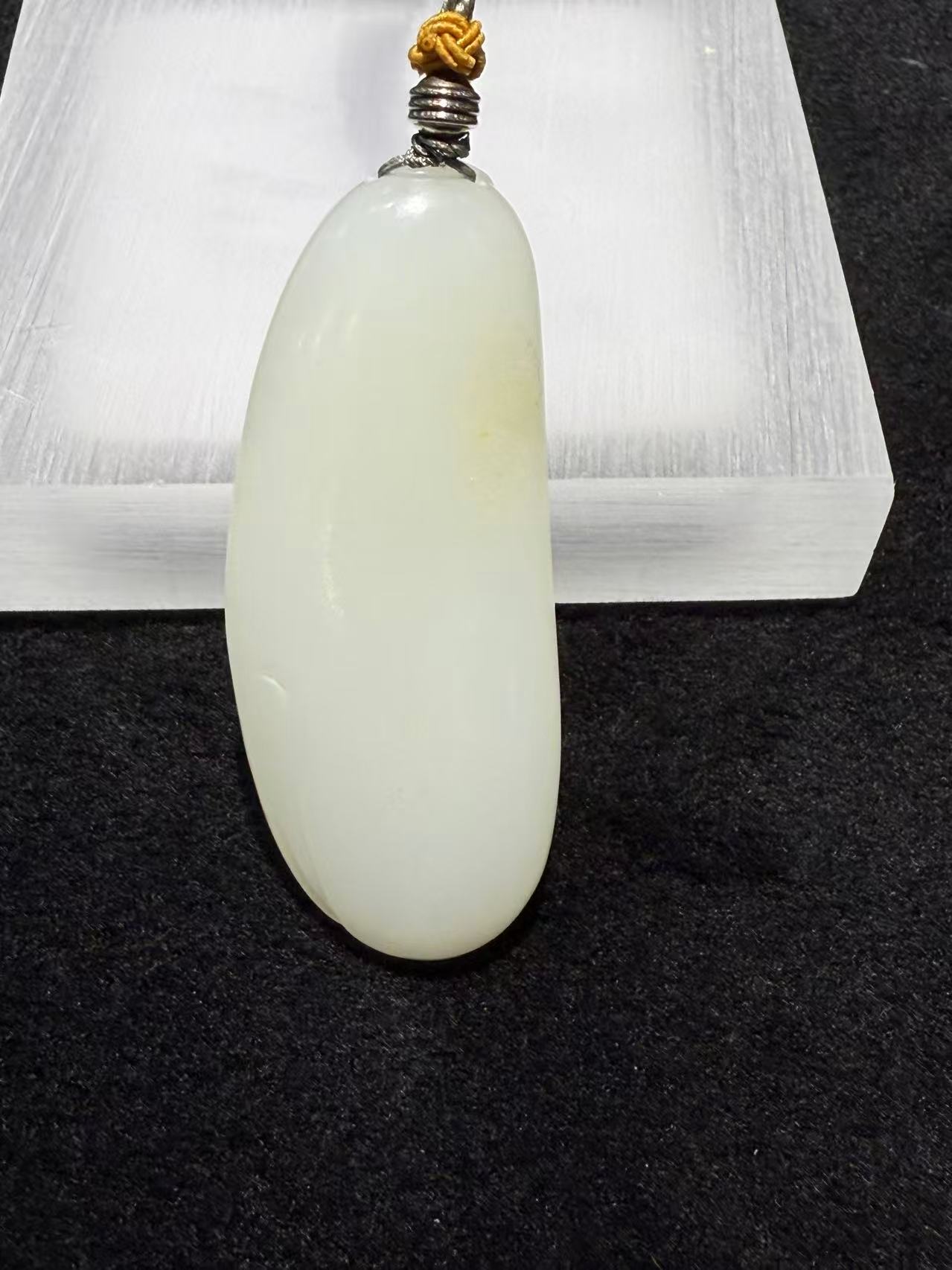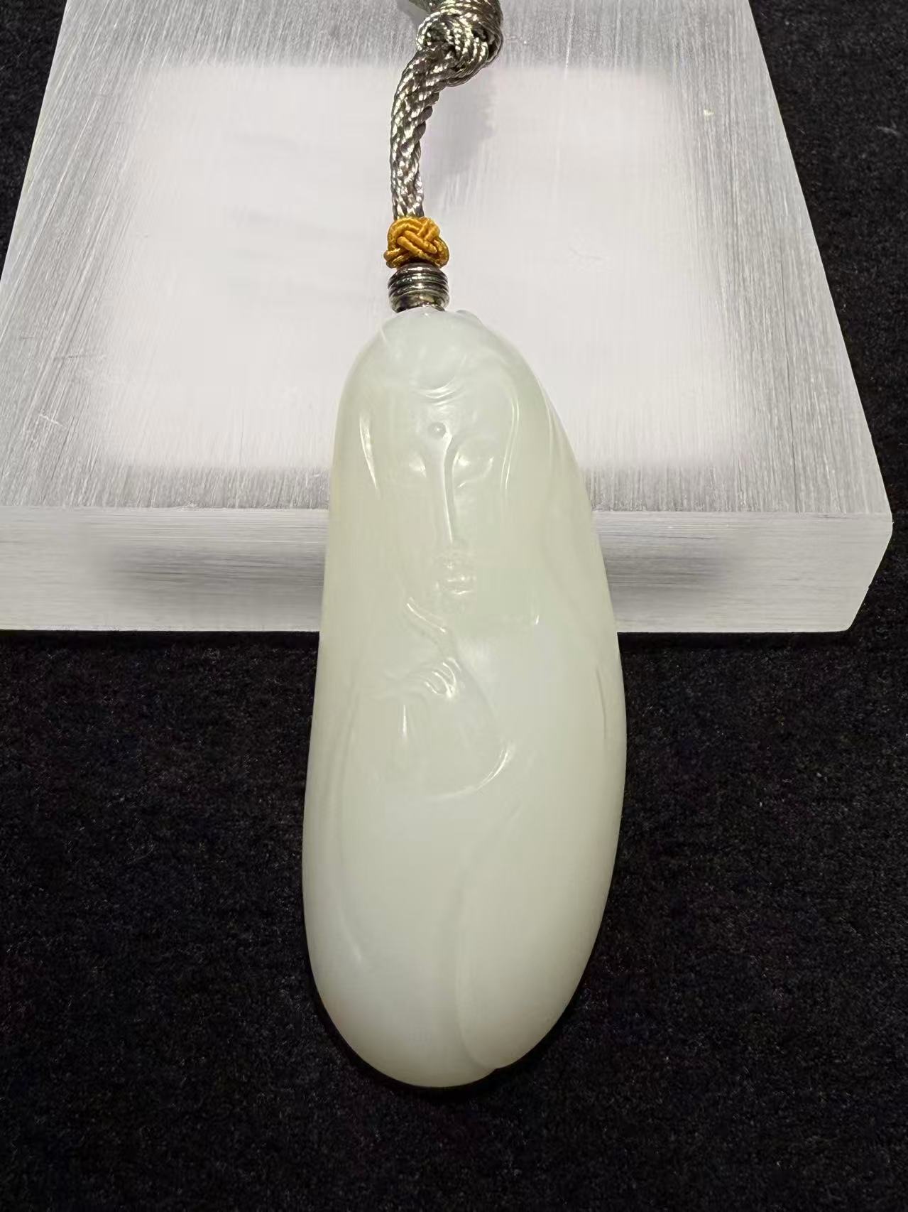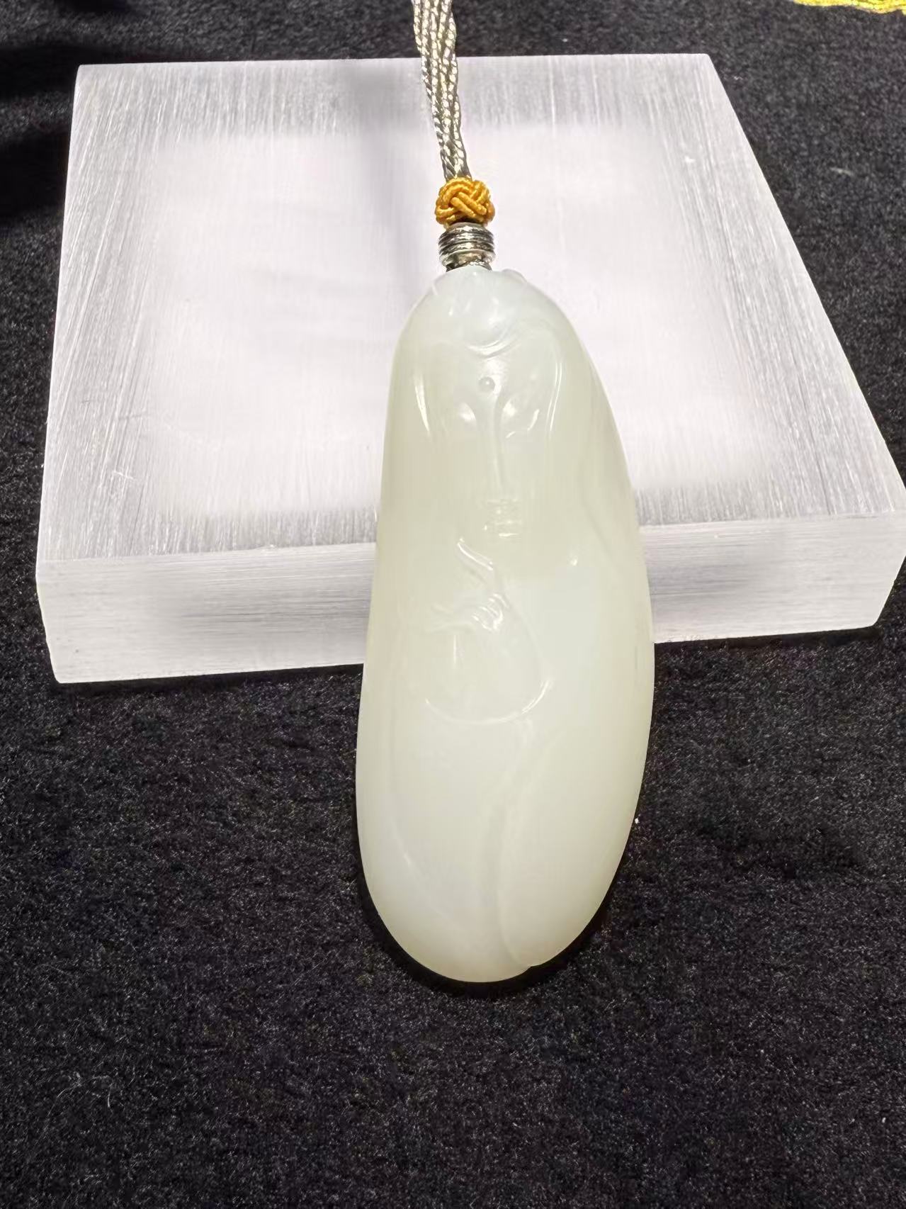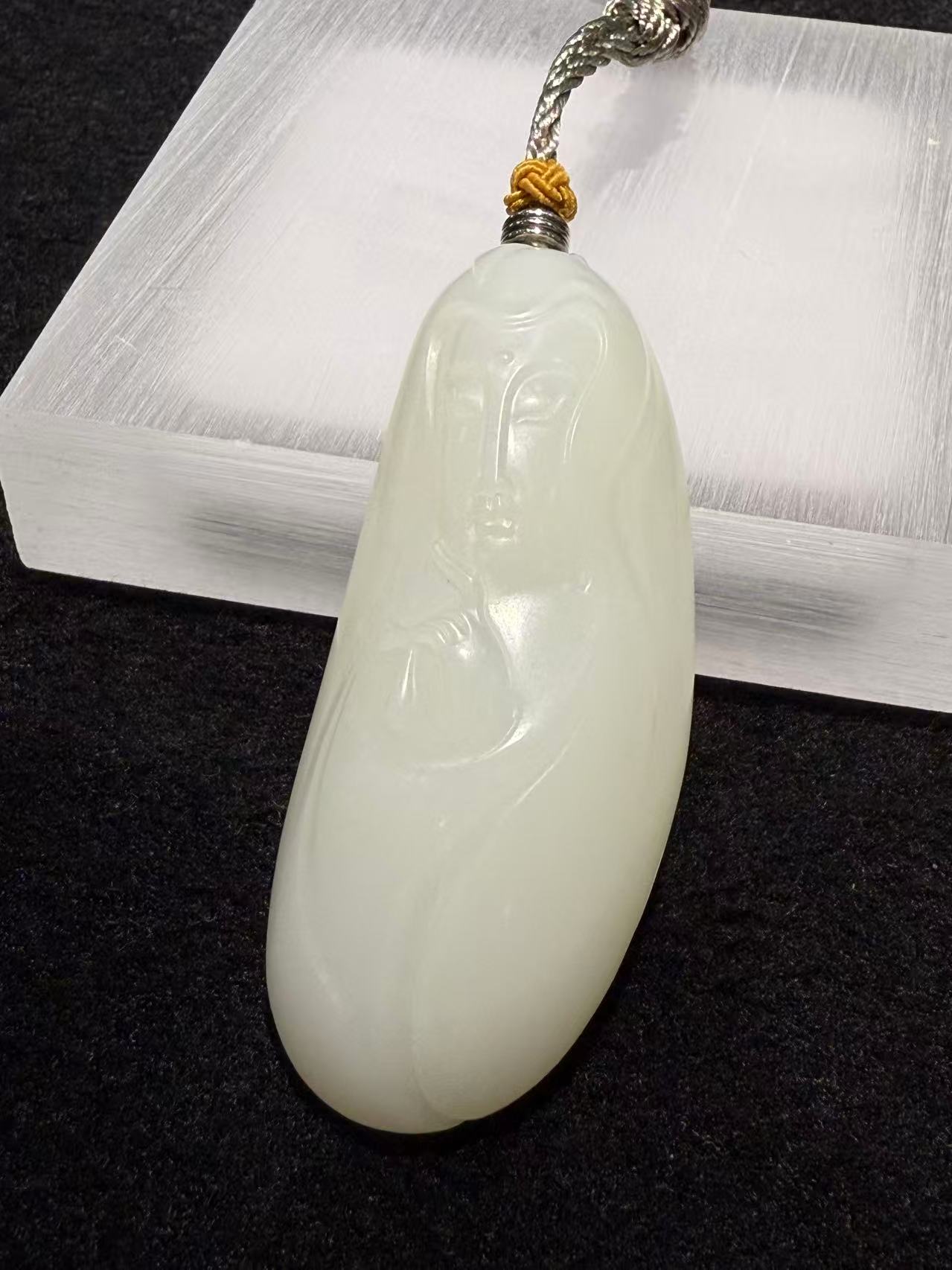This white nephrite jade Guanyin pendant carries a quiet and balanced beauty. The jade displays a soft creamy white tone, often associated with traditional Hotian jade. Its surface reflects light gently, creating a smooth and mellow lustre instead of sharp shine.