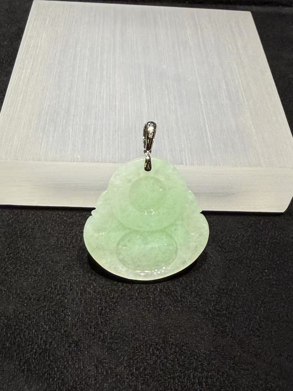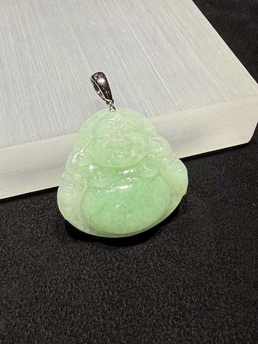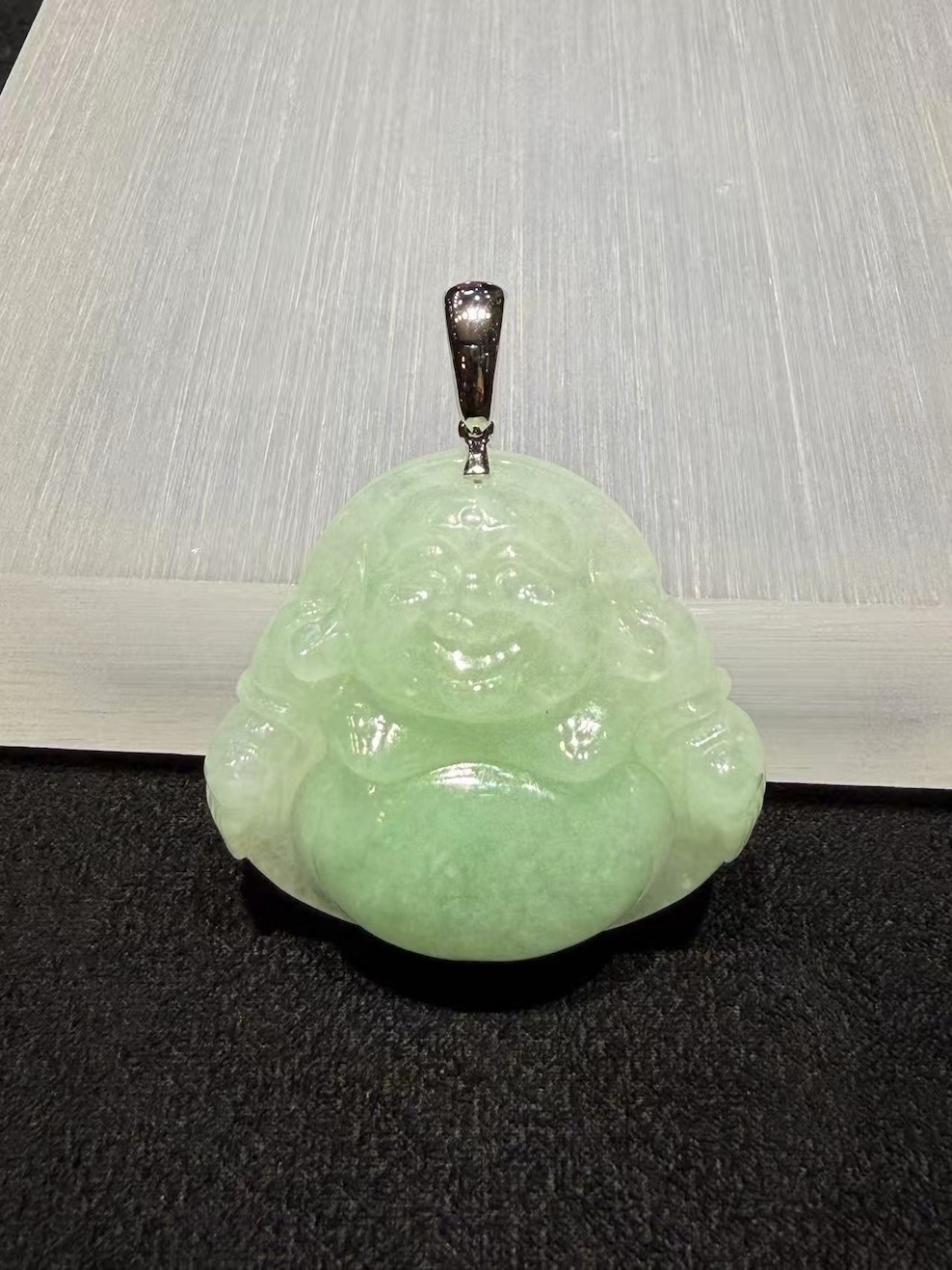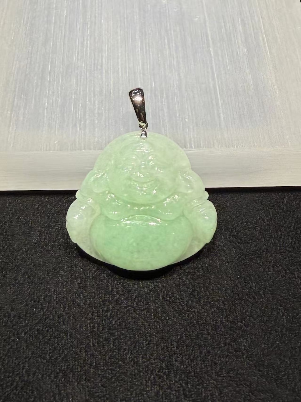 This apple green jadeite Buddha pendant presents a soft, uplifting presence. The jade shows a faint yet lively apple green tone, layered over a milky translucent base. As light passes through, the surface reveals a gentle glow rather than sharp brilliance. This gives the piece a warm, natural character.