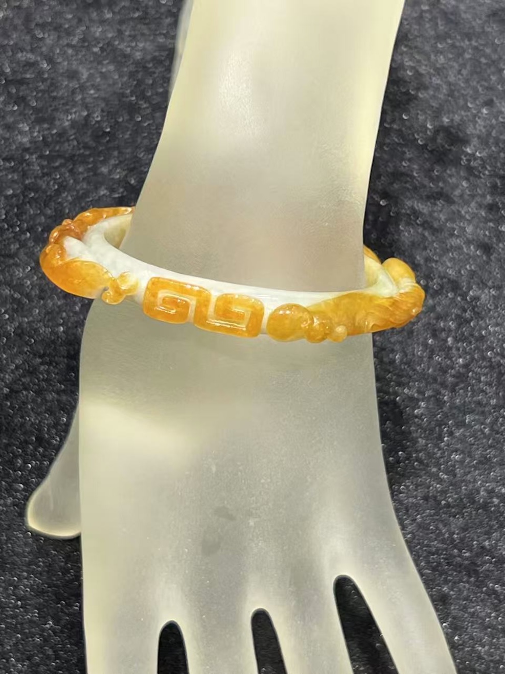 A masterpiece of artistry and symbolism, this Translucent brownish Yellow Jadeite Bangle embodies the harmony between heaven and earth.