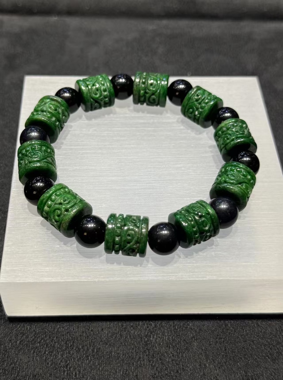 Between the jade beads, polished black beads provide contrast. Their smooth, reflective surface highlights the texture of the jade carving. At the same time, the darker tones strengthen the overall presence of the piece.