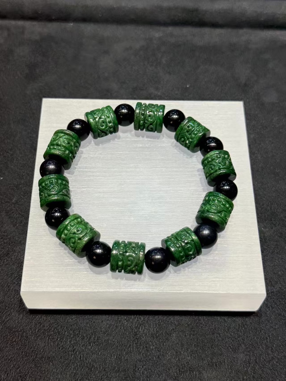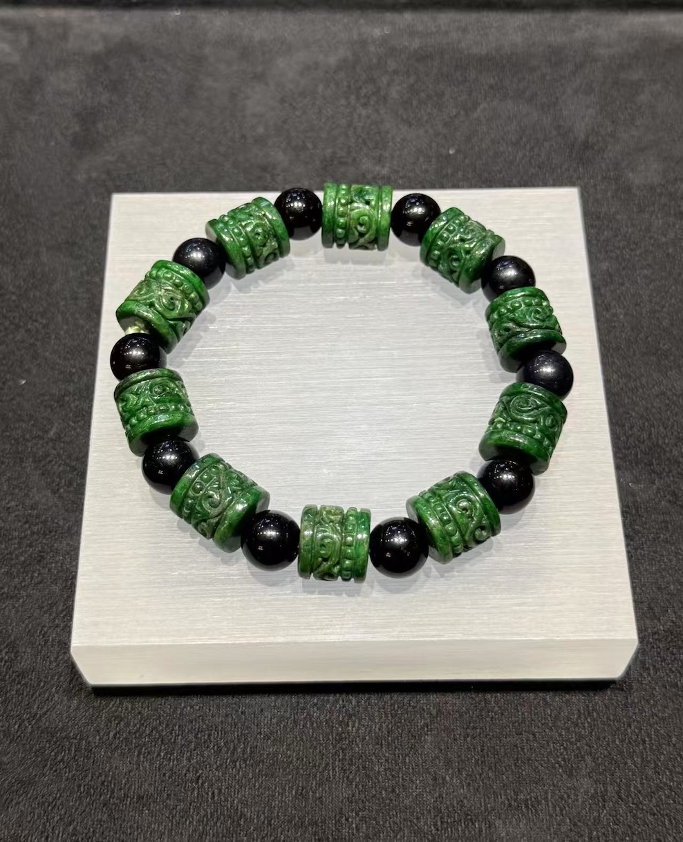 The bracelet feels substantial without being overwhelming. It suits those who prefer a stronger, more defined jade presence. At the same time, the traditional carving keeps the design rooted in heritage.