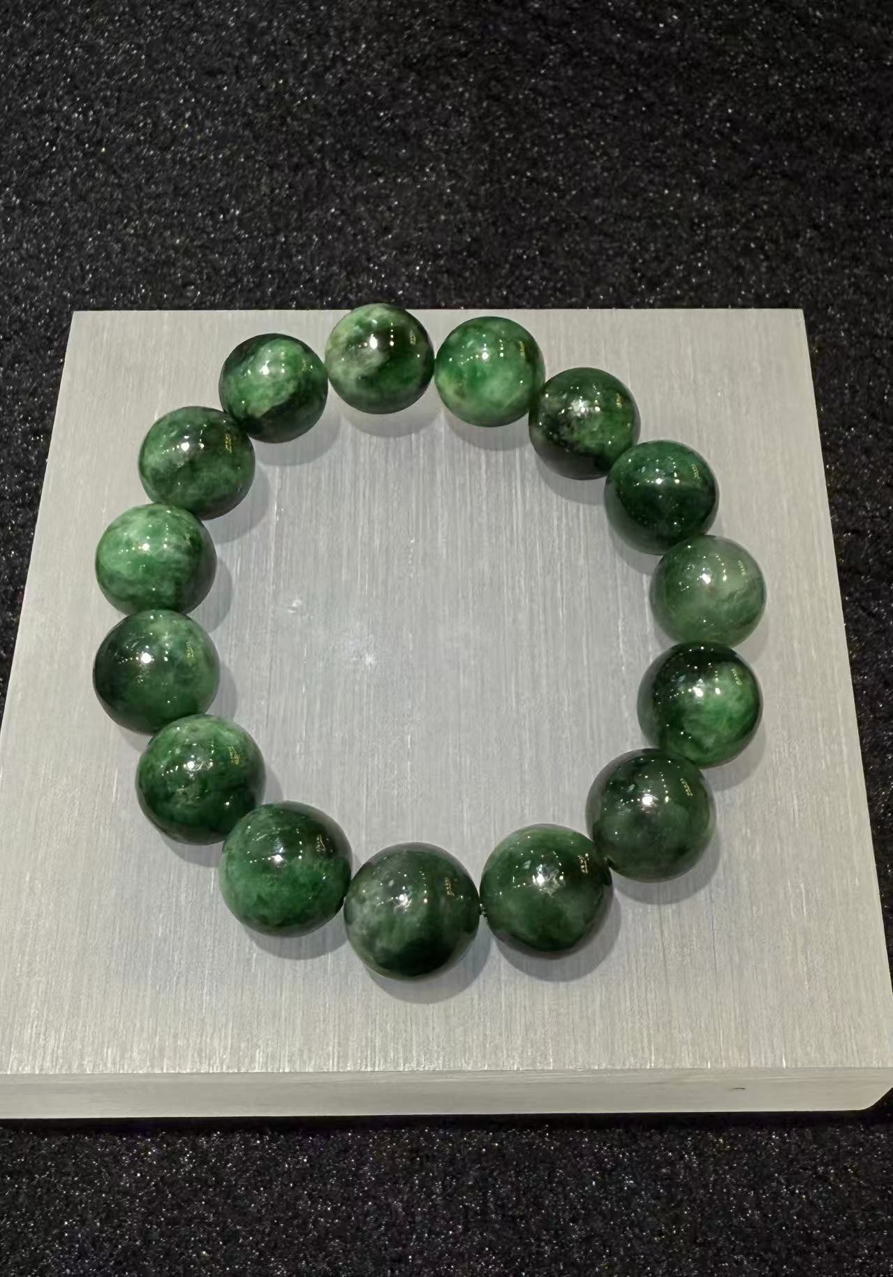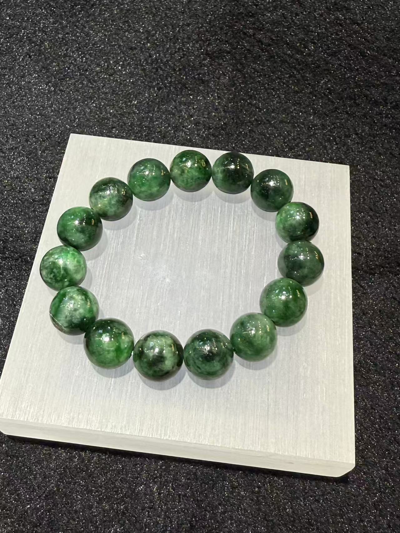 This bracelet features dark old-pit jadeite beads in a deep green tone that shifts gently under light. The colour ranges from forest green to nearly inky patches, creating a natural mix that reflects the character of old-pit material. Its subtle translucency gives the beads a quiet glow, especially when viewed closely or under stronger lighting.