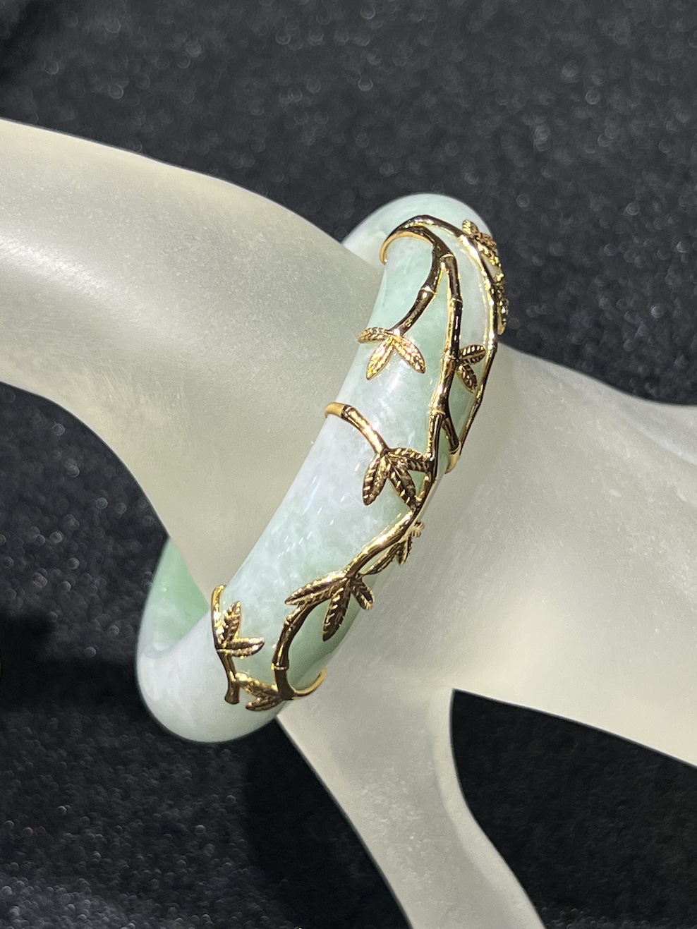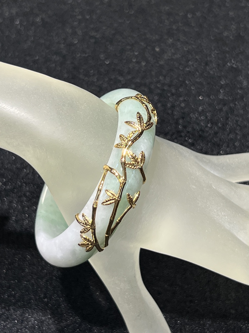 The jade bangle with patches of faint green with whitish base colour in translucent quality. Teh jade is well designed with 18k yellow gold with stem and leaf, which symbols growth of prosperity.