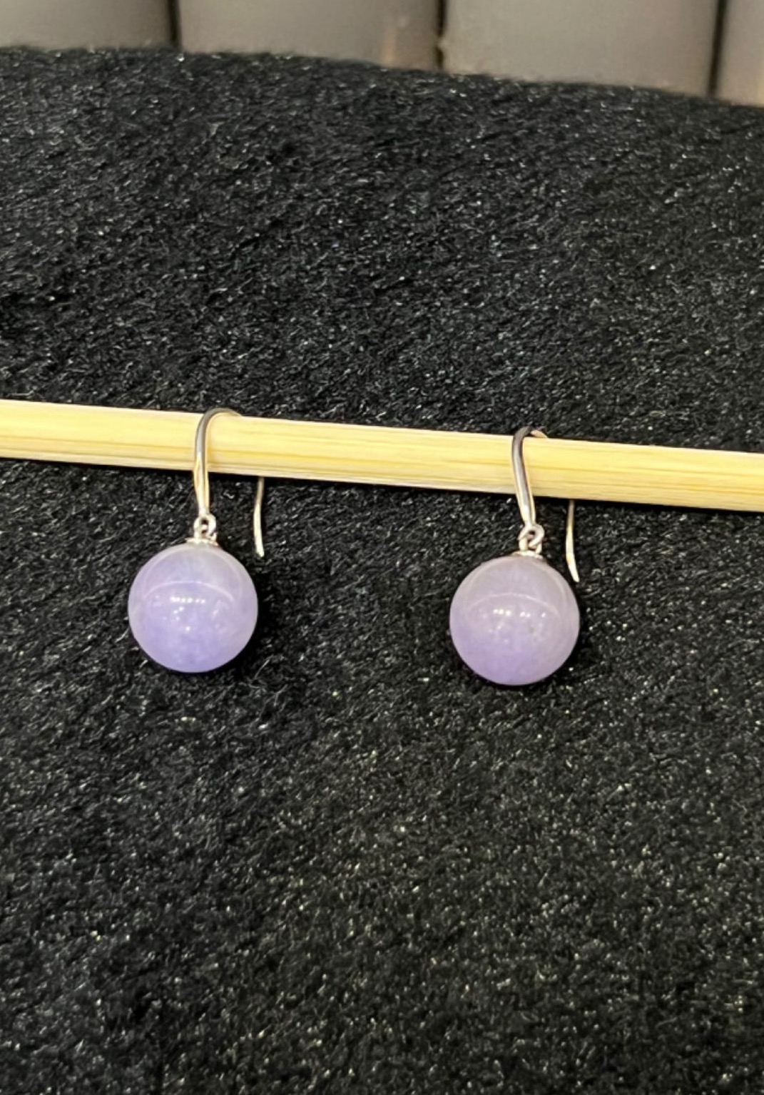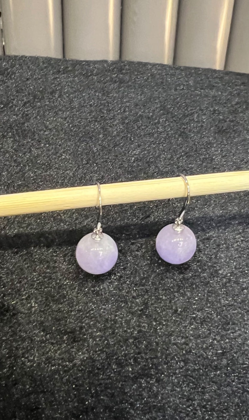 A pair of translucent lavender beads is designed into dangling jade earring. The setting is in 18k white gold.