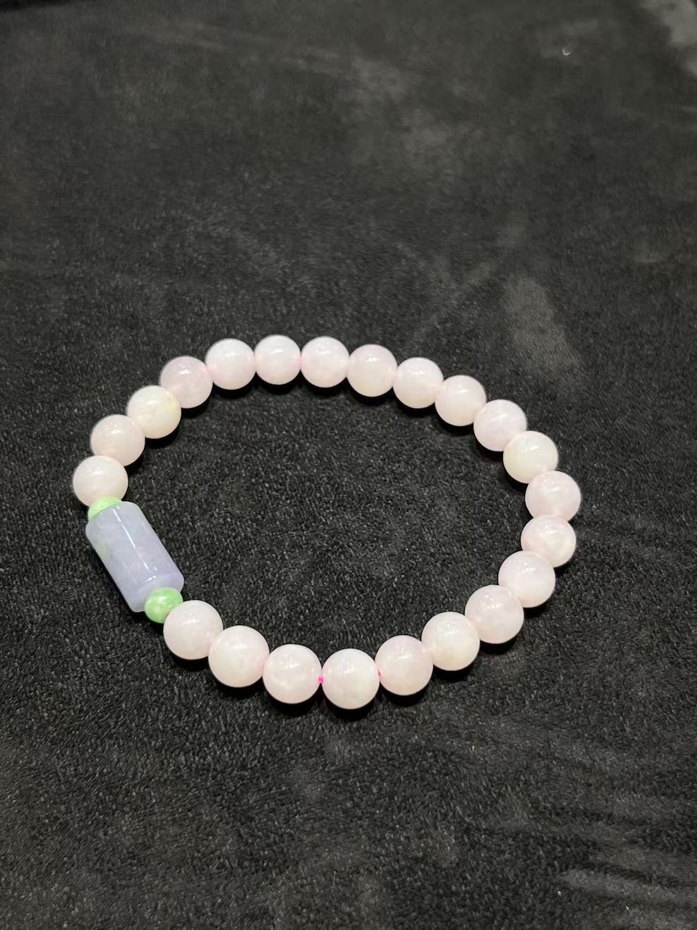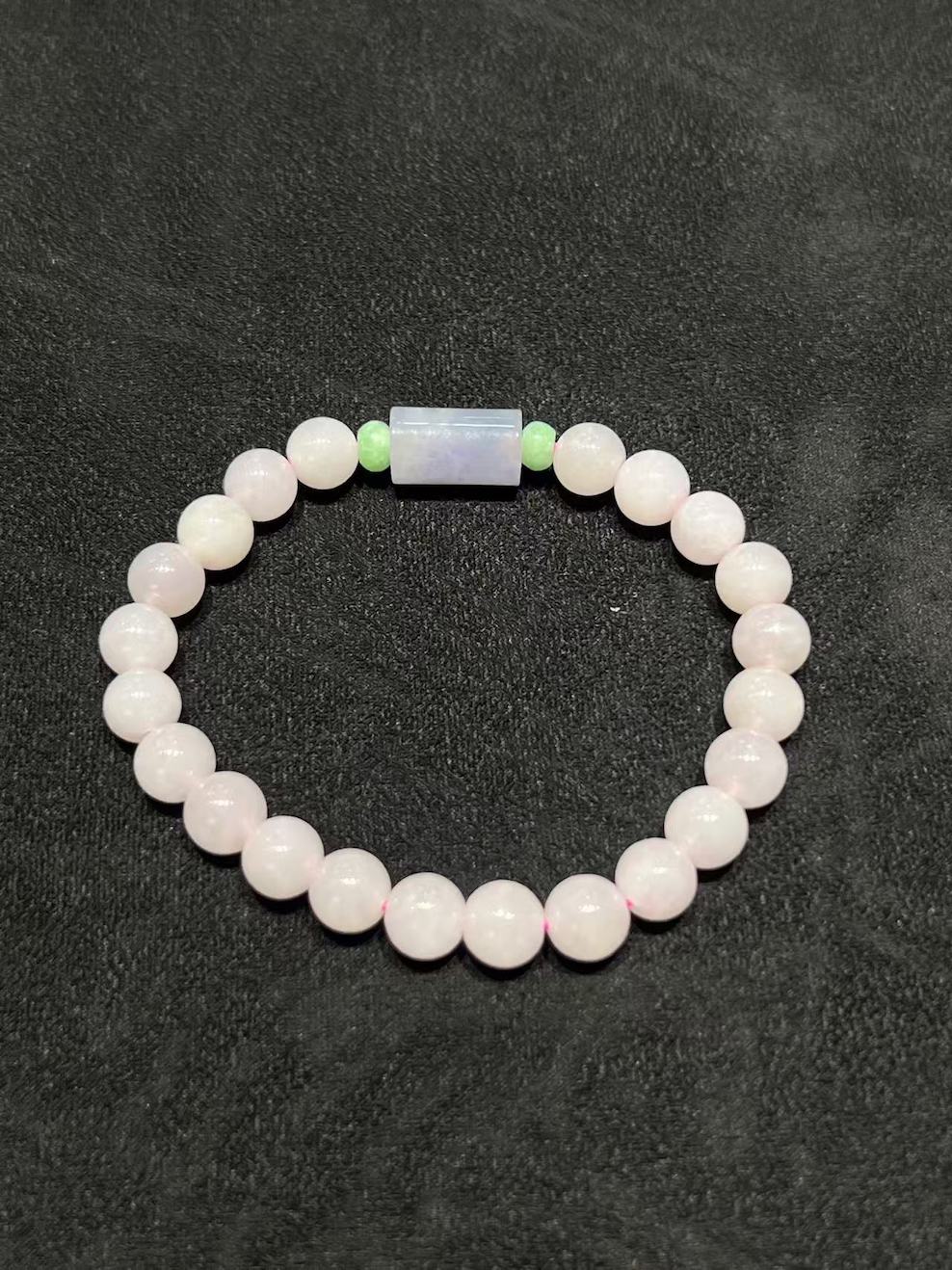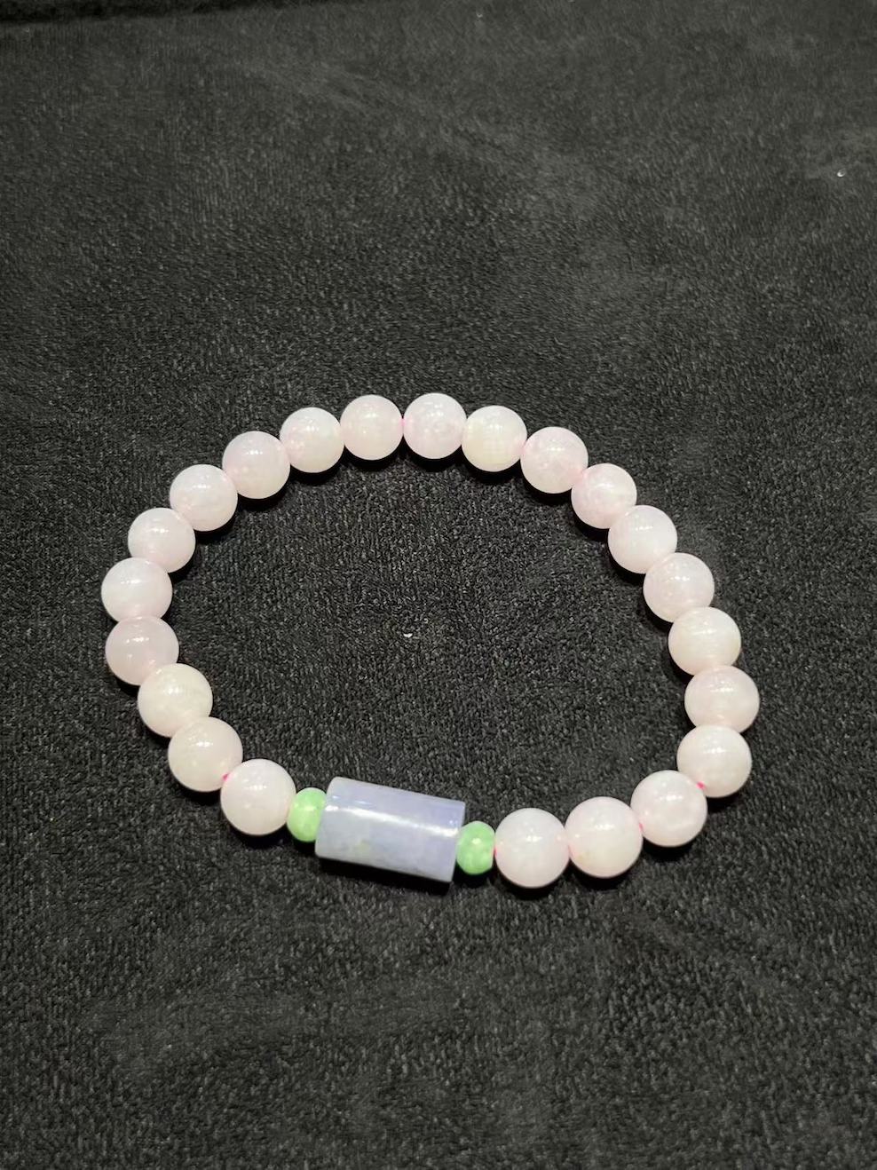This delicate jade bracelet, featuring translucent faint pink lavender beads paired with an elegant blue lavender jade barrel centerpiece. The soft pastel tones exude a calming, graceful charm, perfect for adding a subtle touch of sophistication to any outfit.
