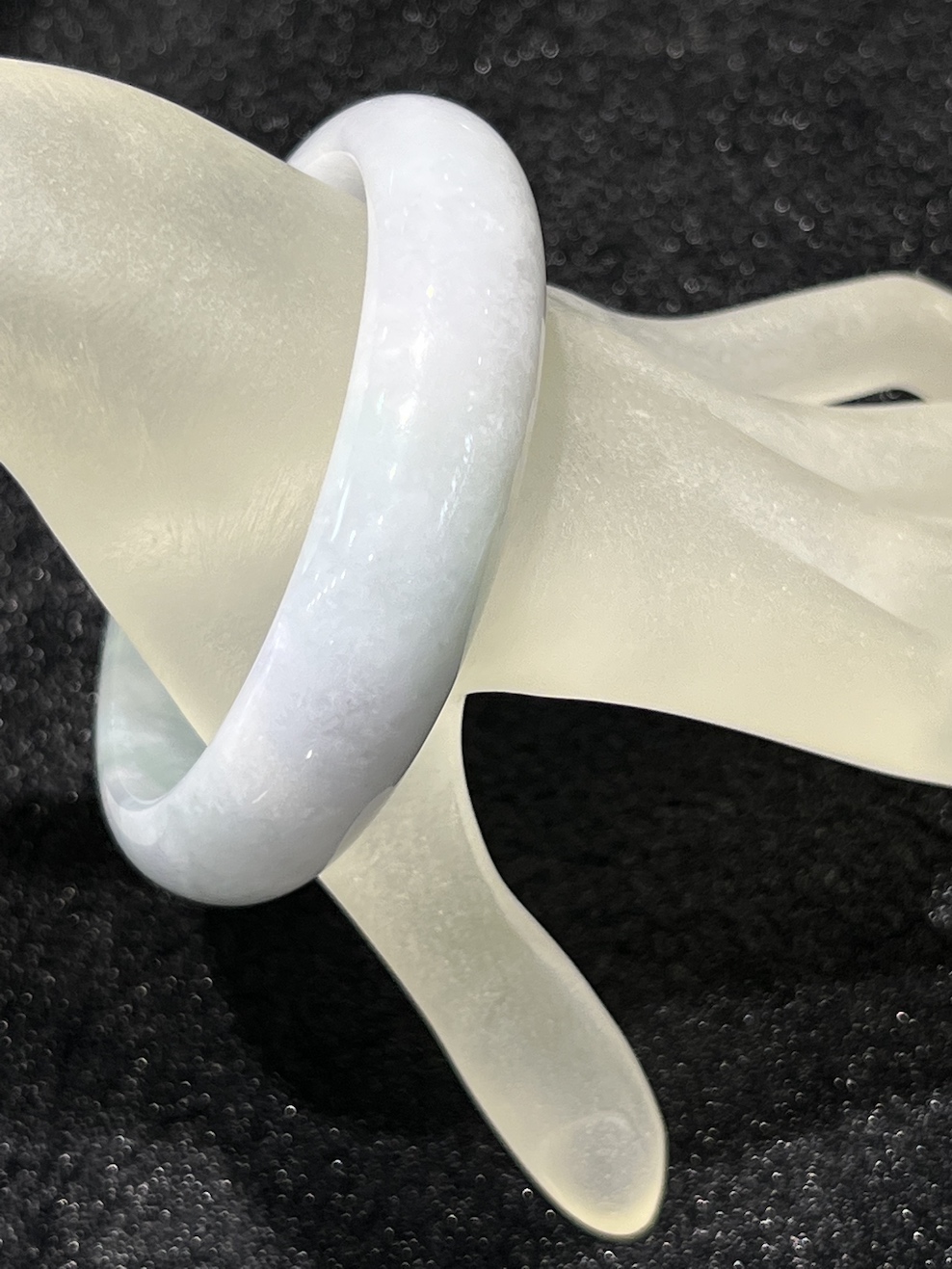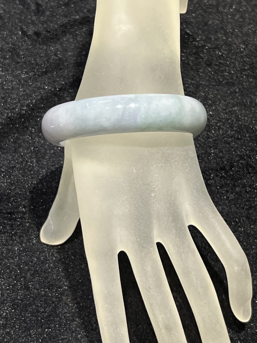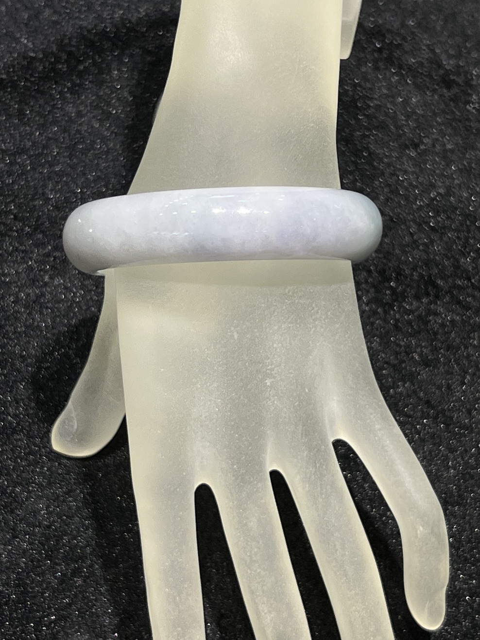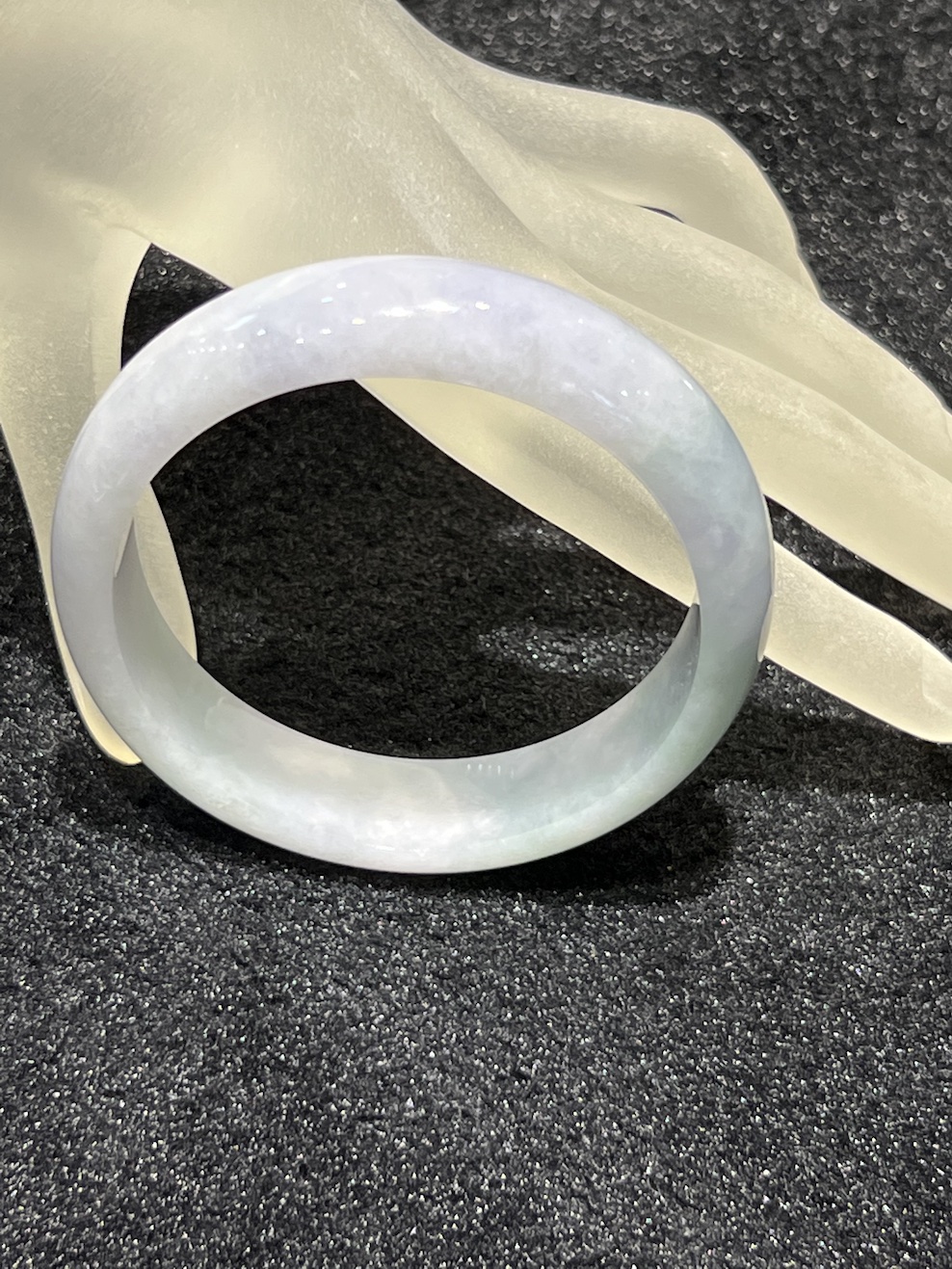 The jade bangle has faint lavender colour with patches of faint green colour. The jade bangle has translucent quality.