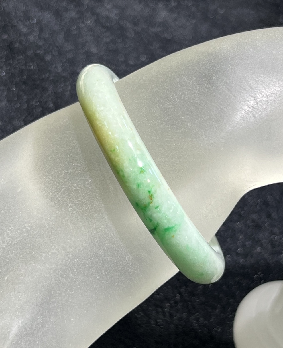 The jadeite bangle has whiteish base colour with a patch of green and honey yellow. It is also know as triple colour in the trade. the jade bangle has translucent quality and good lustre. It is unique jade bangle collection.