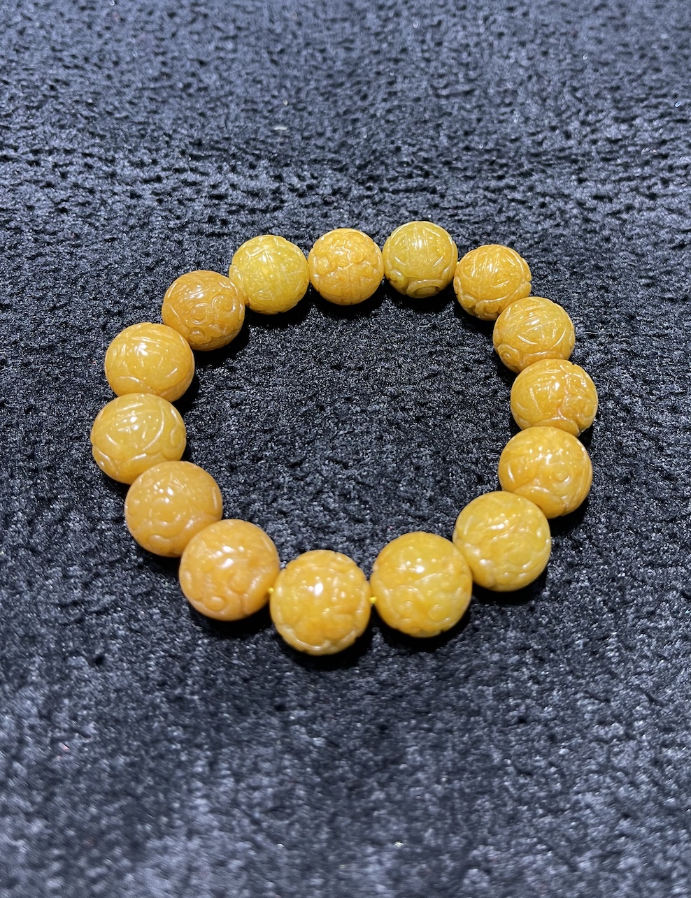 The jade bracelet has vibrant honey yellow colour.The jade beads are carving with Ruyi clouds over it.