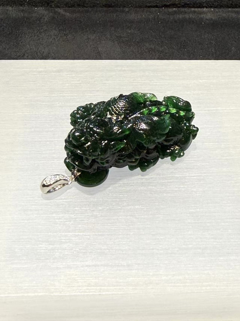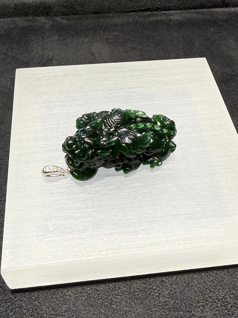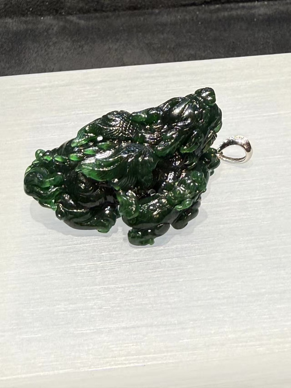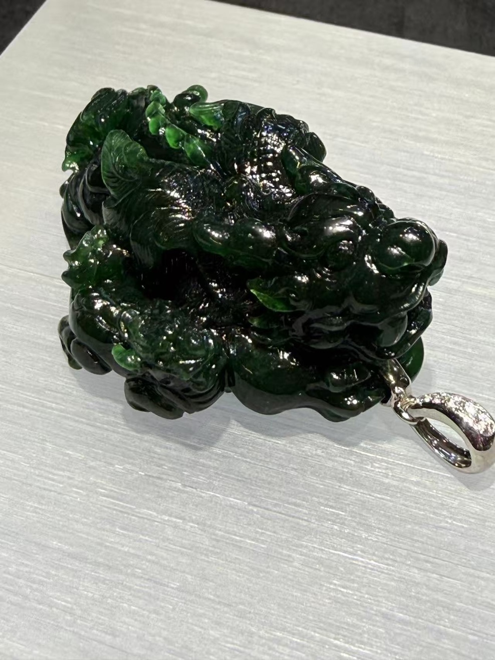 Finally, each jadeite carving forms differently in nature. The structure, colour depth, and carving flow always vary slightly. For this reason, every dark green Pixiu jadeite pendant stands as a unique expression of natural jade and craftsmanship.