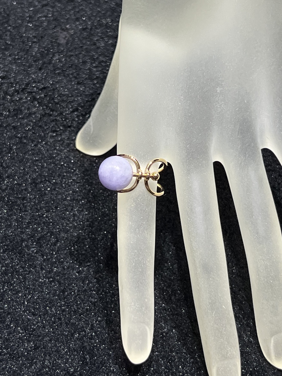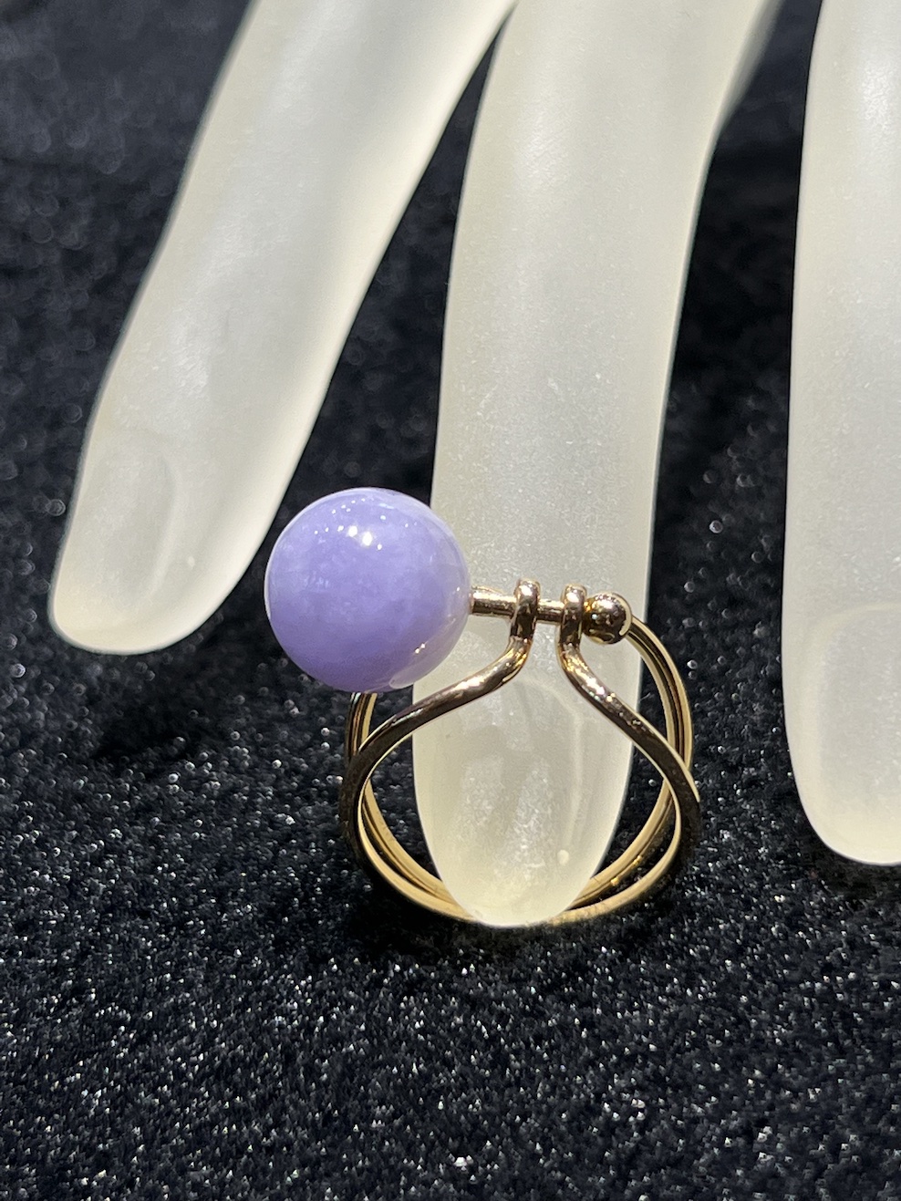 A jade bead has lovely lavender colour, it is designed into a jade ring. The jade ring is set in 18k yellow gold.