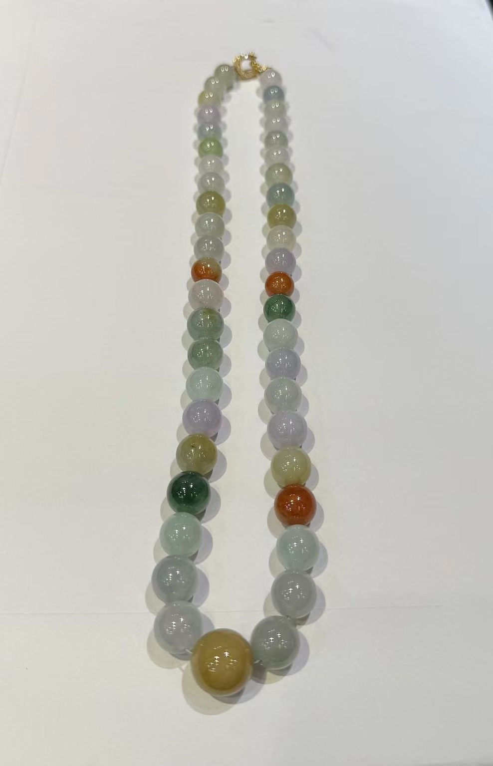 Celebrate nature’s artistry with this Translucent Multi-Colour Jade Bead Necklace — an exquisite expression of colour, craftsmanship, and cultural meaning. Each bead is carved from Type A natural jadeite, known for its purity, translucency, and smooth polish.