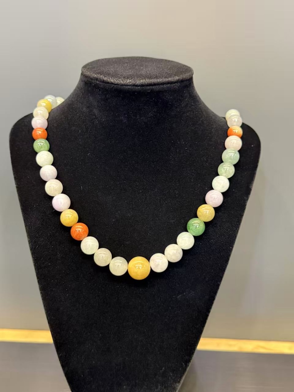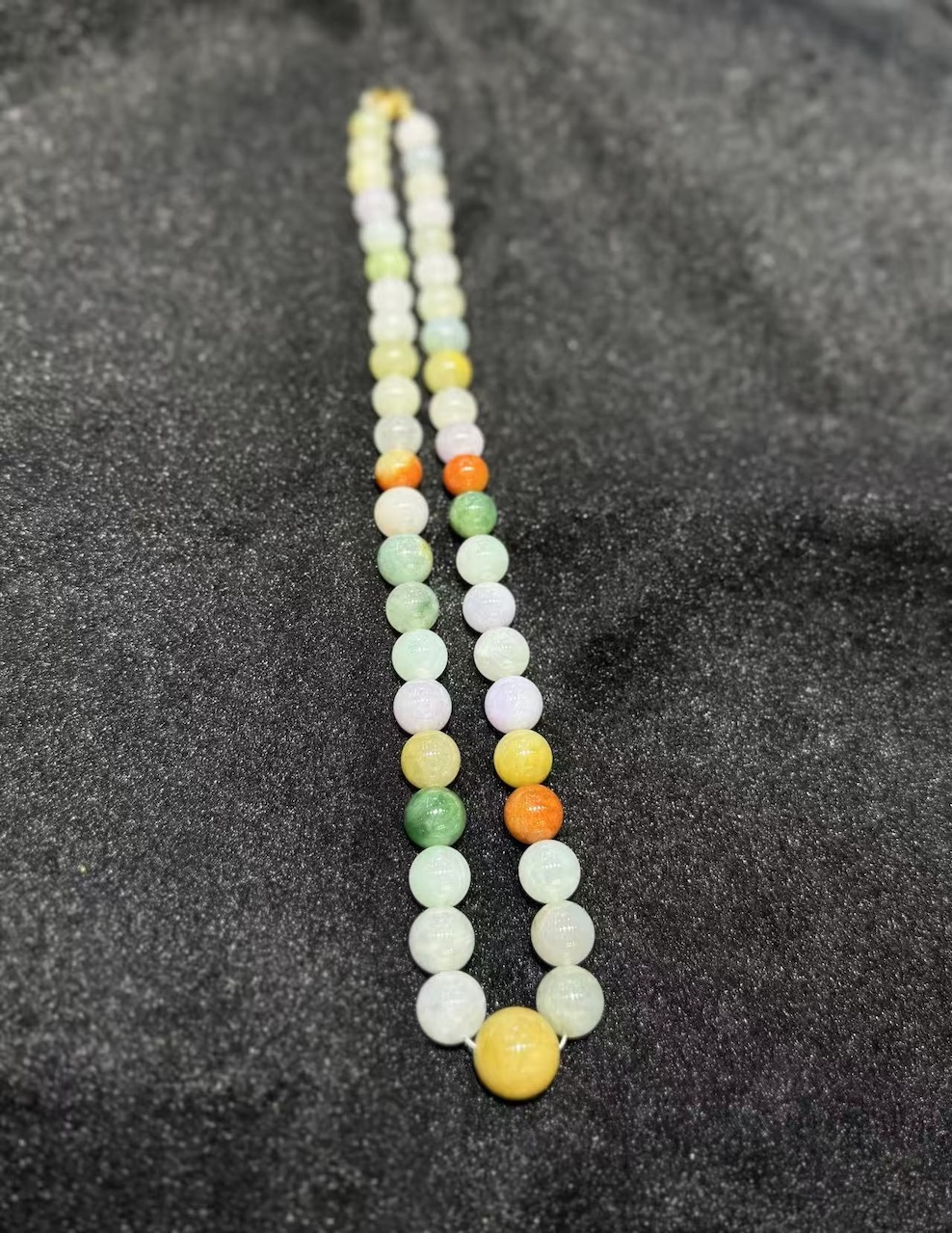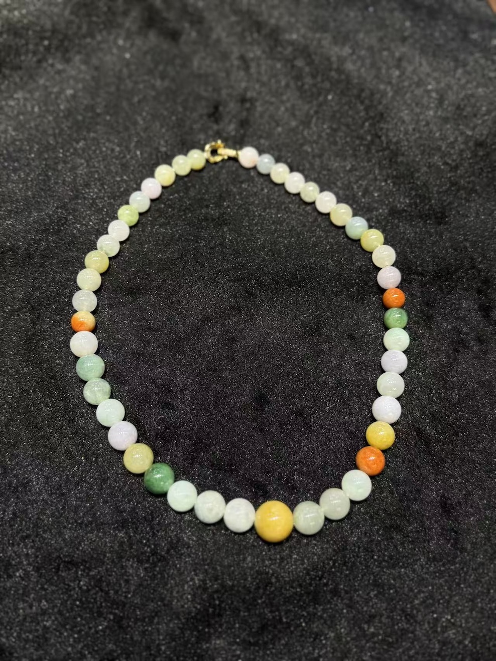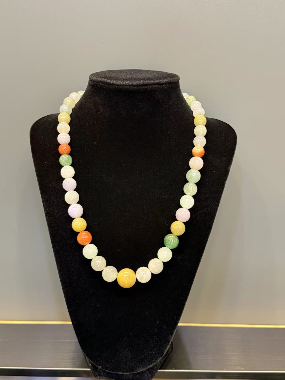 Celebrate nature’s artistry with this Translucent Multi-Colour Jade Bead Necklace — an exquisite expression of colour, craftsmanship, and cultural meaning. Each bead is carved from Type A natural jadeite, known for its purity, translucency, and smooth polish.