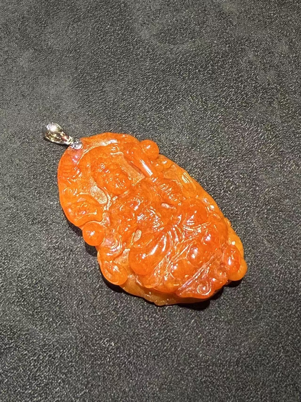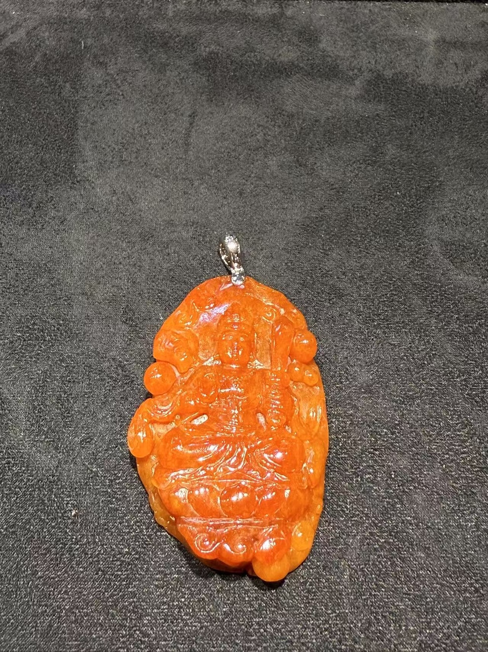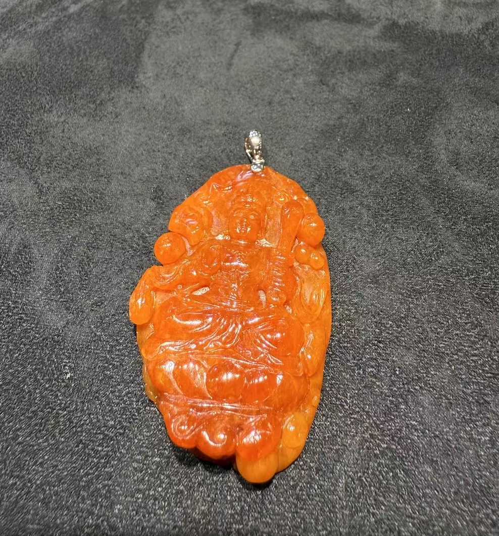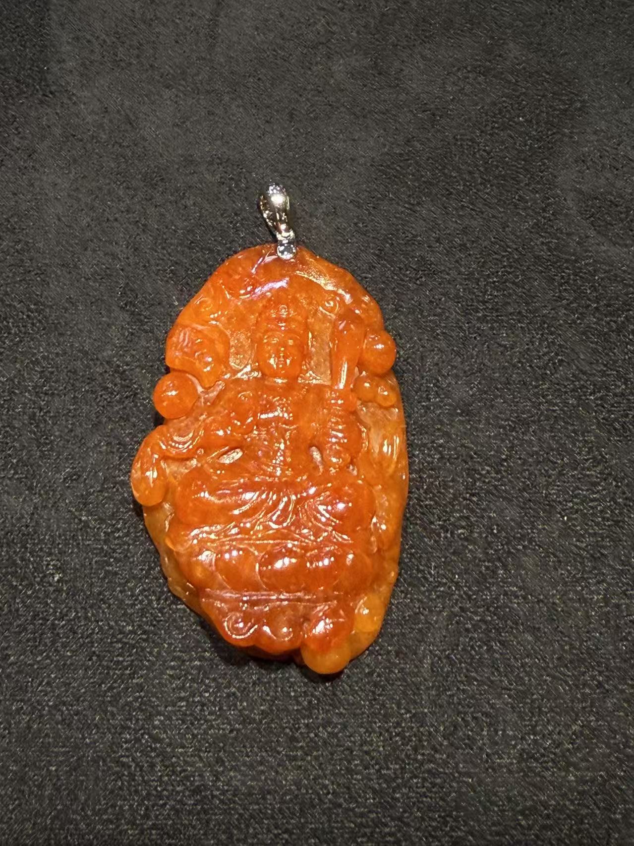 A translucent reddish jadeite Guanyin pendant has a symbol of compassion, protection, and spiritual serenity in fine jade carving.