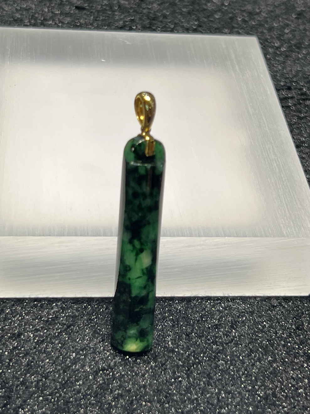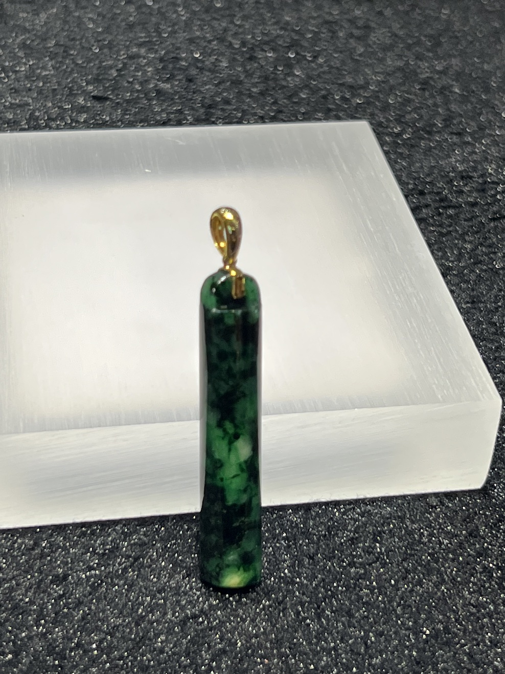 The jade pedant is carved as a hollow cylinder shape of pillar which symbols for good prosperity. The jade pillar has translucent dark old it green colour.