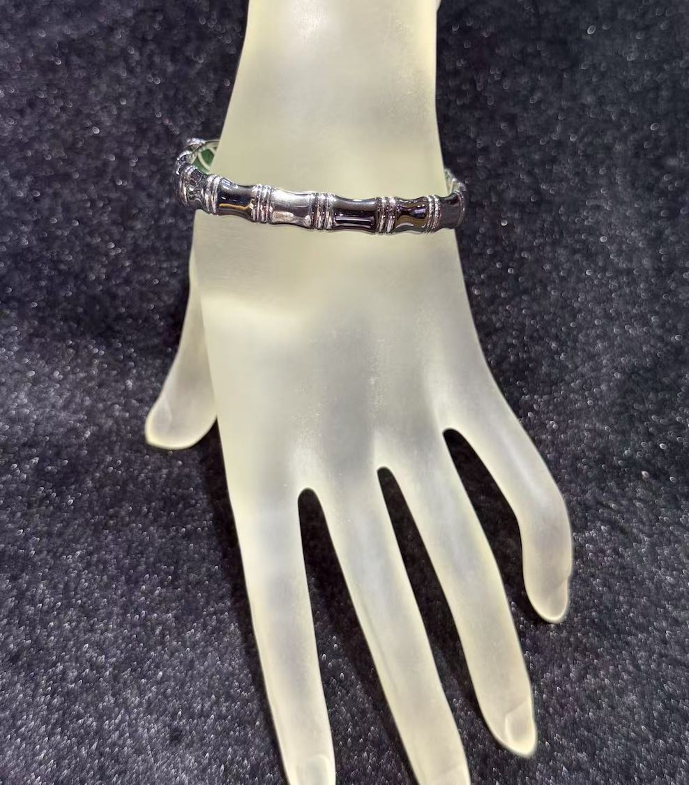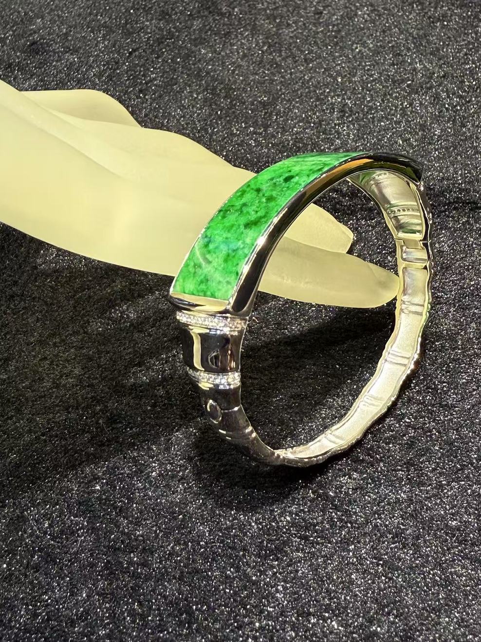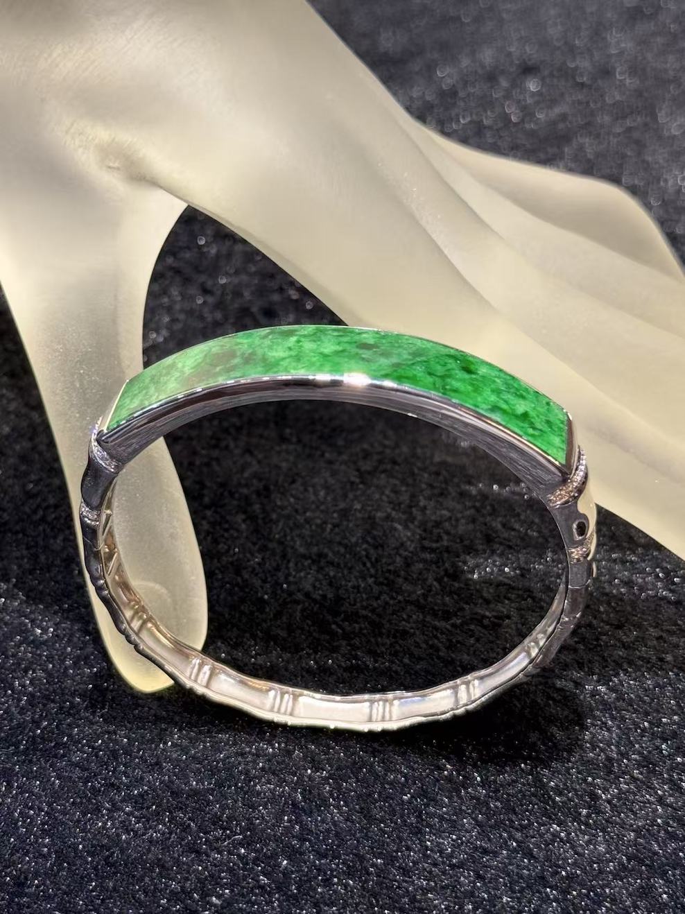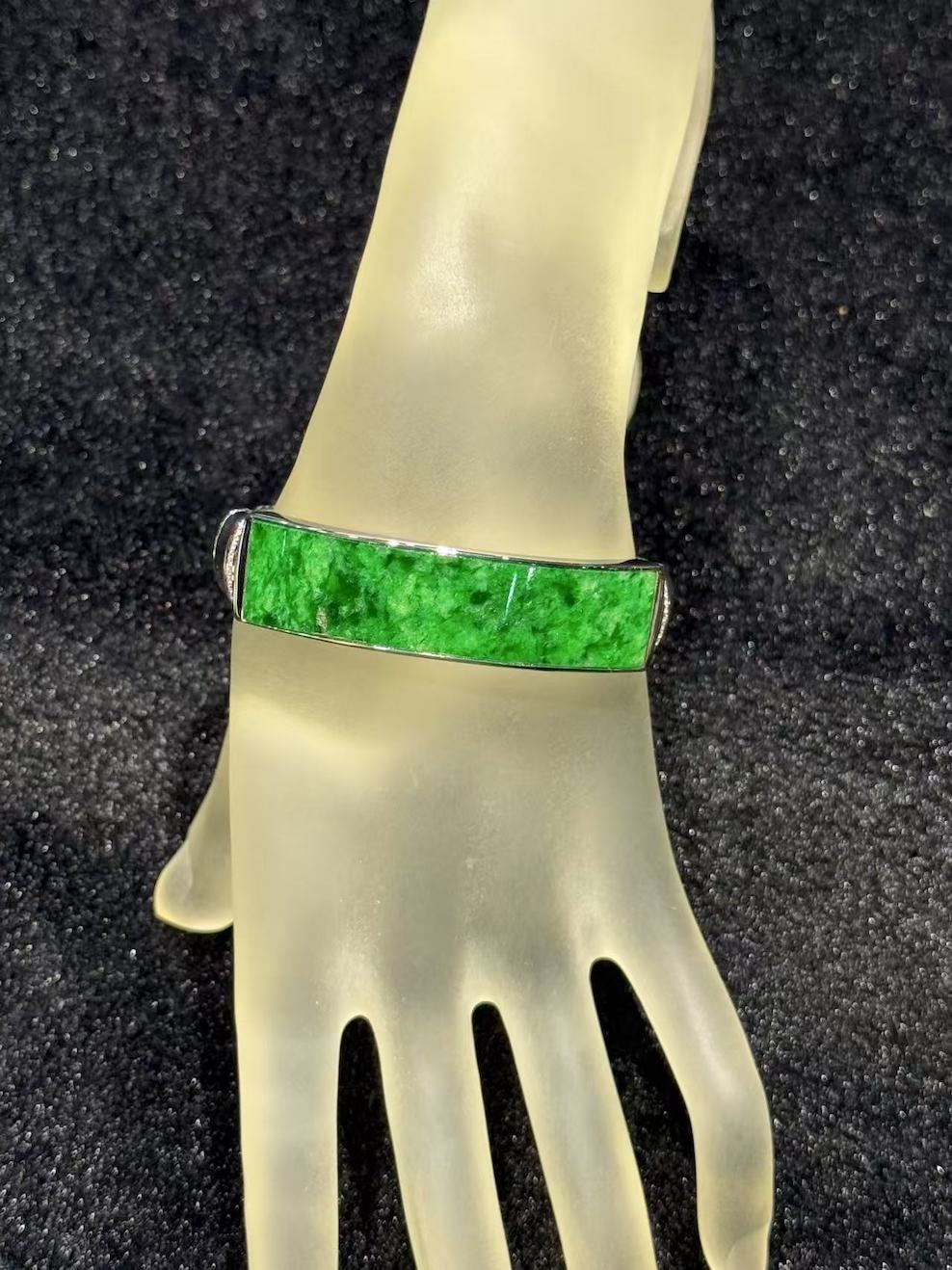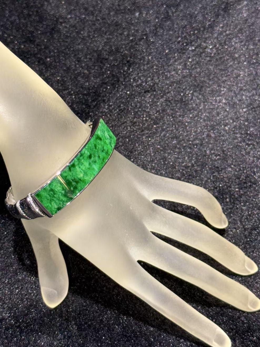The oval designed bangle has a very vibrant green jade. the design of gold and jade symbols “金玉满堂” in Chinese. Embrace the timeless elegance and profound symbolism of our gold and jade bangle. This meticulously crafted piece harmoniously combines the opulence of gold with the revered significance of jade. Representing not only prosperity and wealth but also balance and harmony, this bangle is a celebration of enduring beauty and cultural traditions. setting is in 18k white gold and diamonds.
